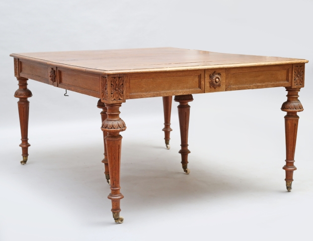ek, träskuren dekor av fleuroner och akantus, runda bladhölstrade avsmalnande ben med kannelyr, fottrissor i porslin, fasta stödben, 7 iläggsskivor i original (bredd 32(1st), 65(6st)), höjd 76, bredd 126, längd 148 - total längd 570 (dekoravslag, en iläggsskiva med avslag, skivan med torksprickor, infälld skruv) (maffigt bord som det går att sitta ca. 26 personer vid)