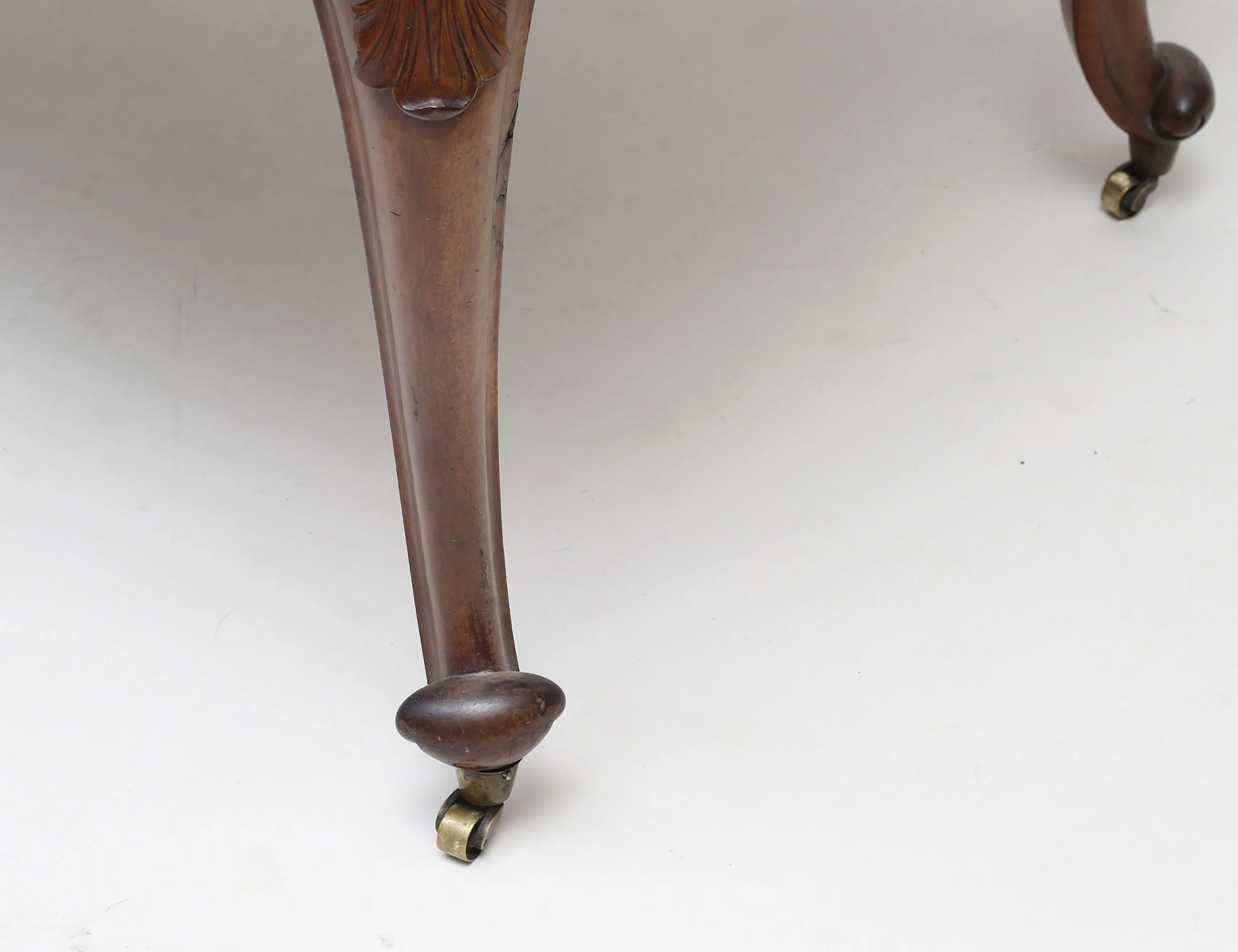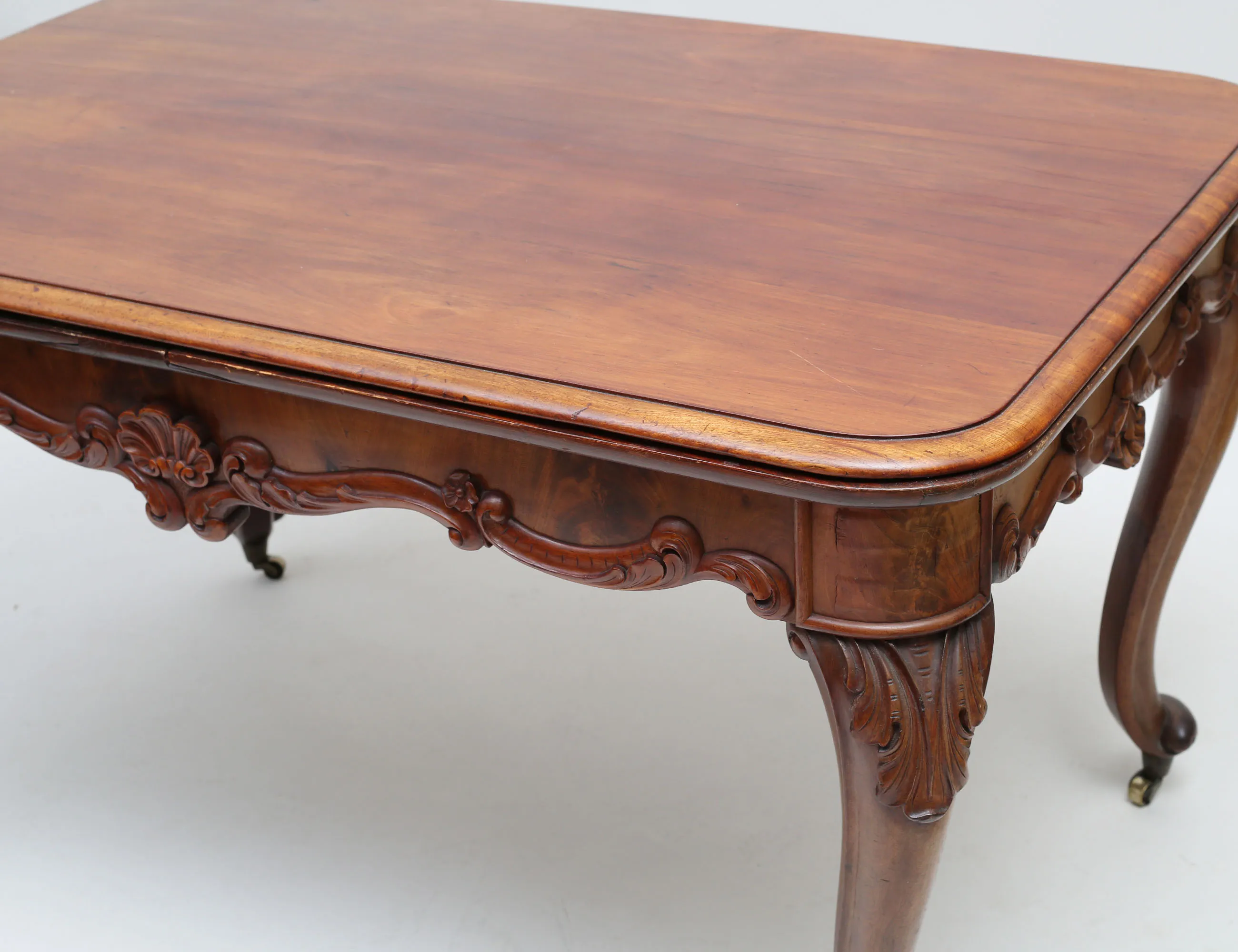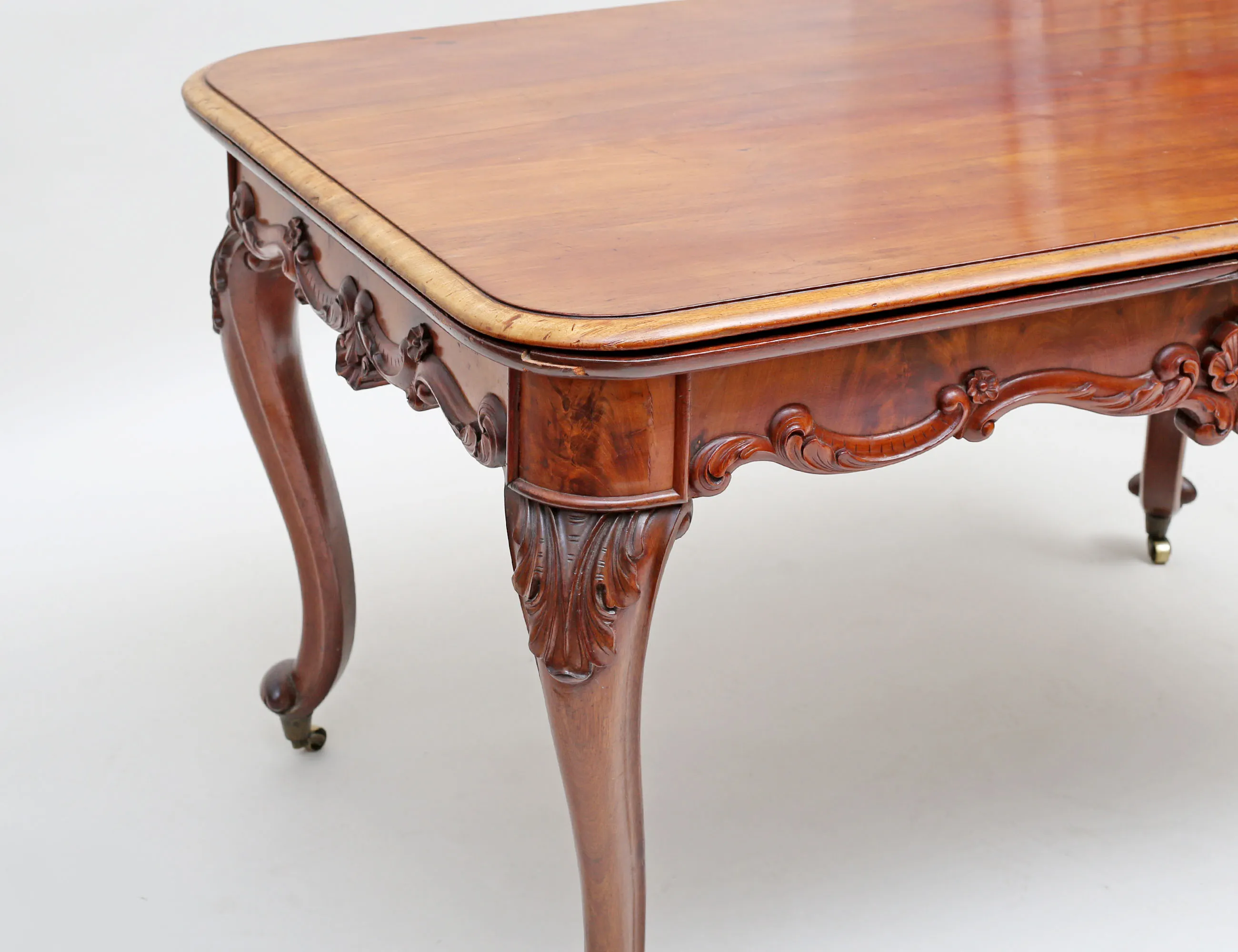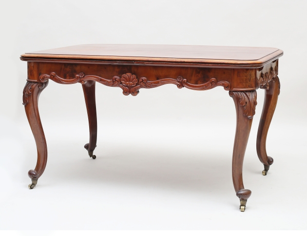 mahogny, träskuren dekor, profilerad skiva med rundade hörn, fottrissor i mässing, två utdragbara skivor, höjd 79, bredd 89, längd 138-244 (bruksslitage, extra skivor med fläckar)