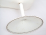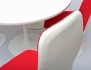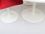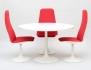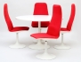 Johanson Design Markaryd 1960/70-tal, matbord med trumpetformad fot, vitlaminerad rund skiva, fyra snurrbara stolar med trumpetformad fot, vitlackerad metall, röd stoppa klädsel, bordets höjd 70, diameter 110, stolens höjd 102 (bruksslitage, repor/märken på stommen, klädsel med smärre fläckar)