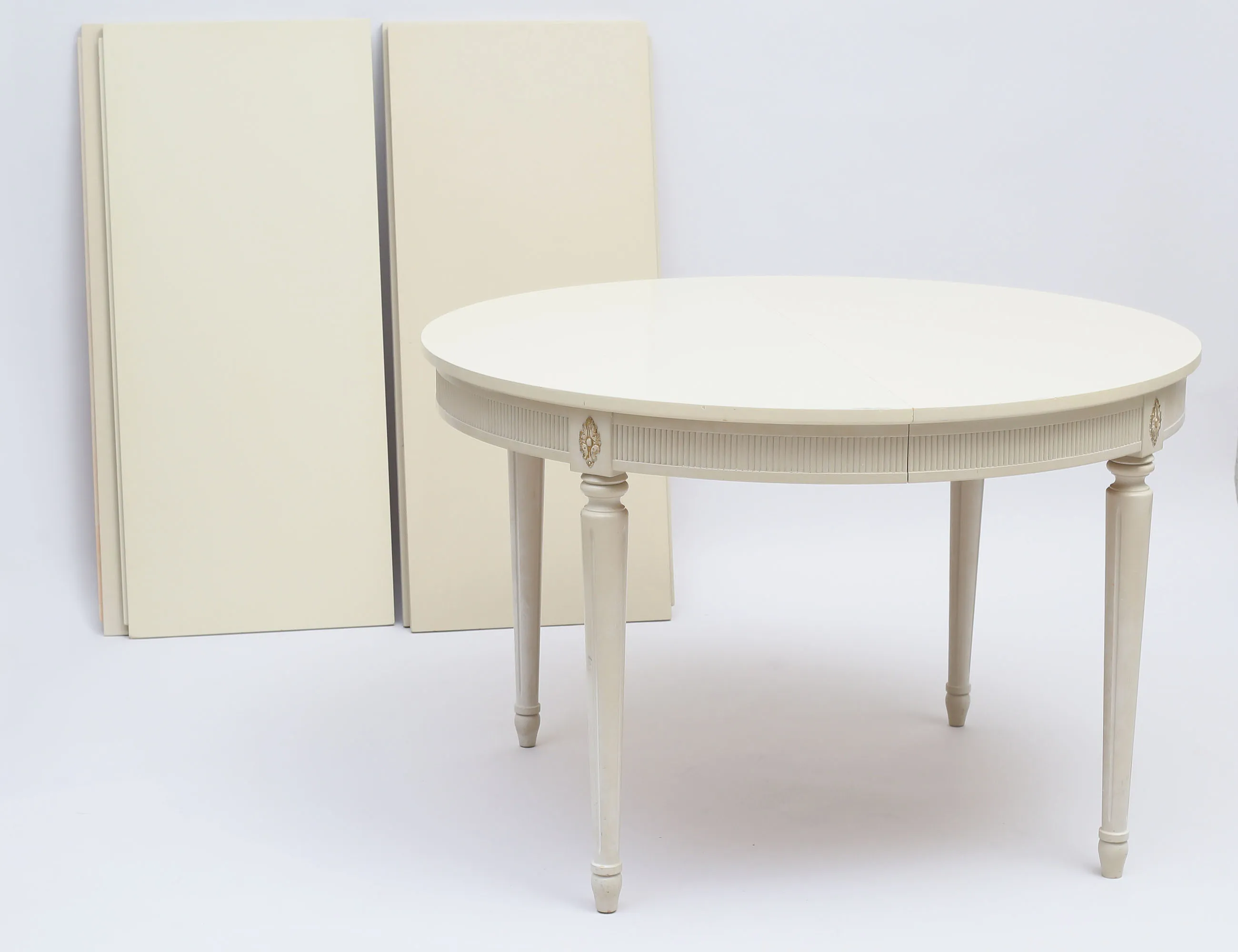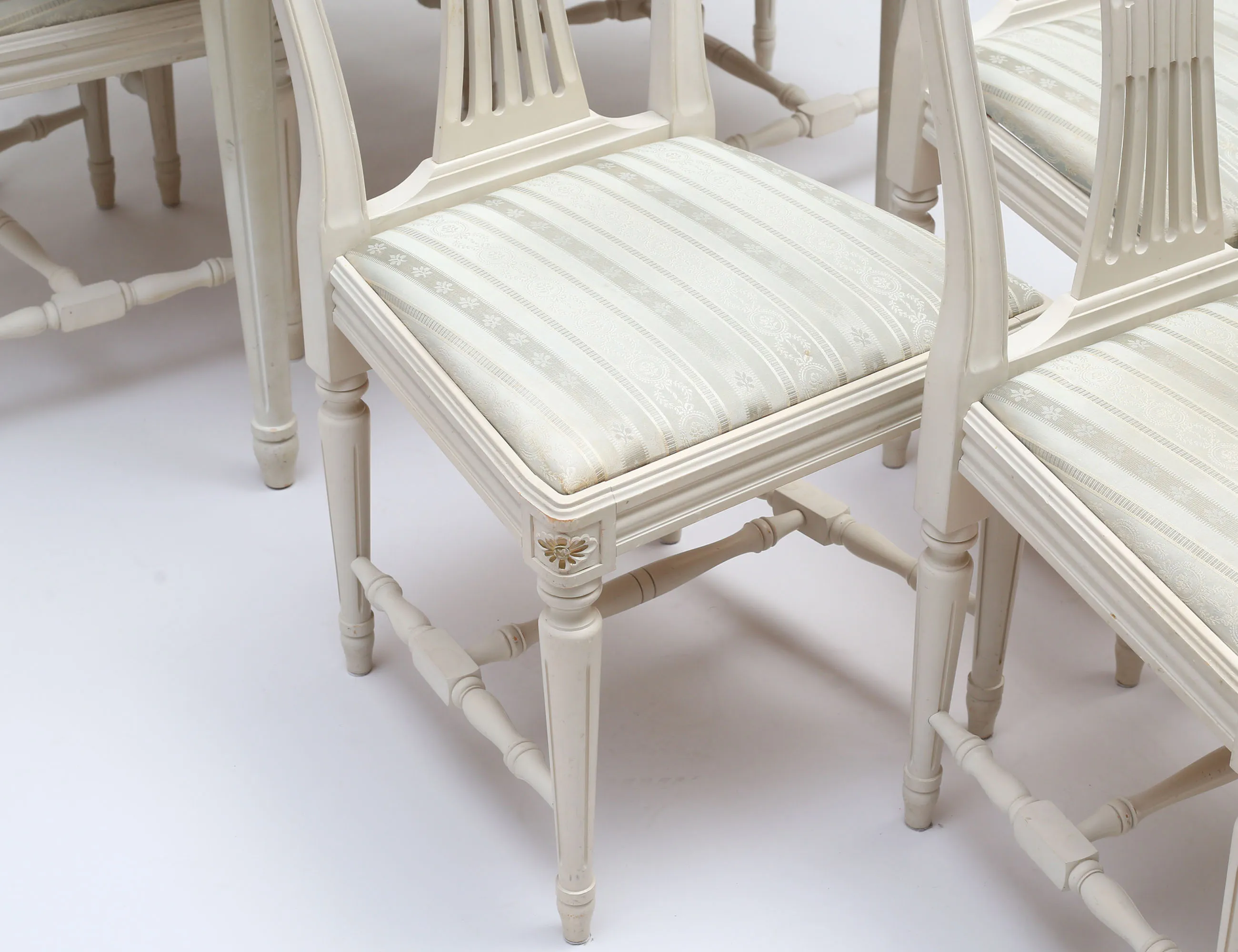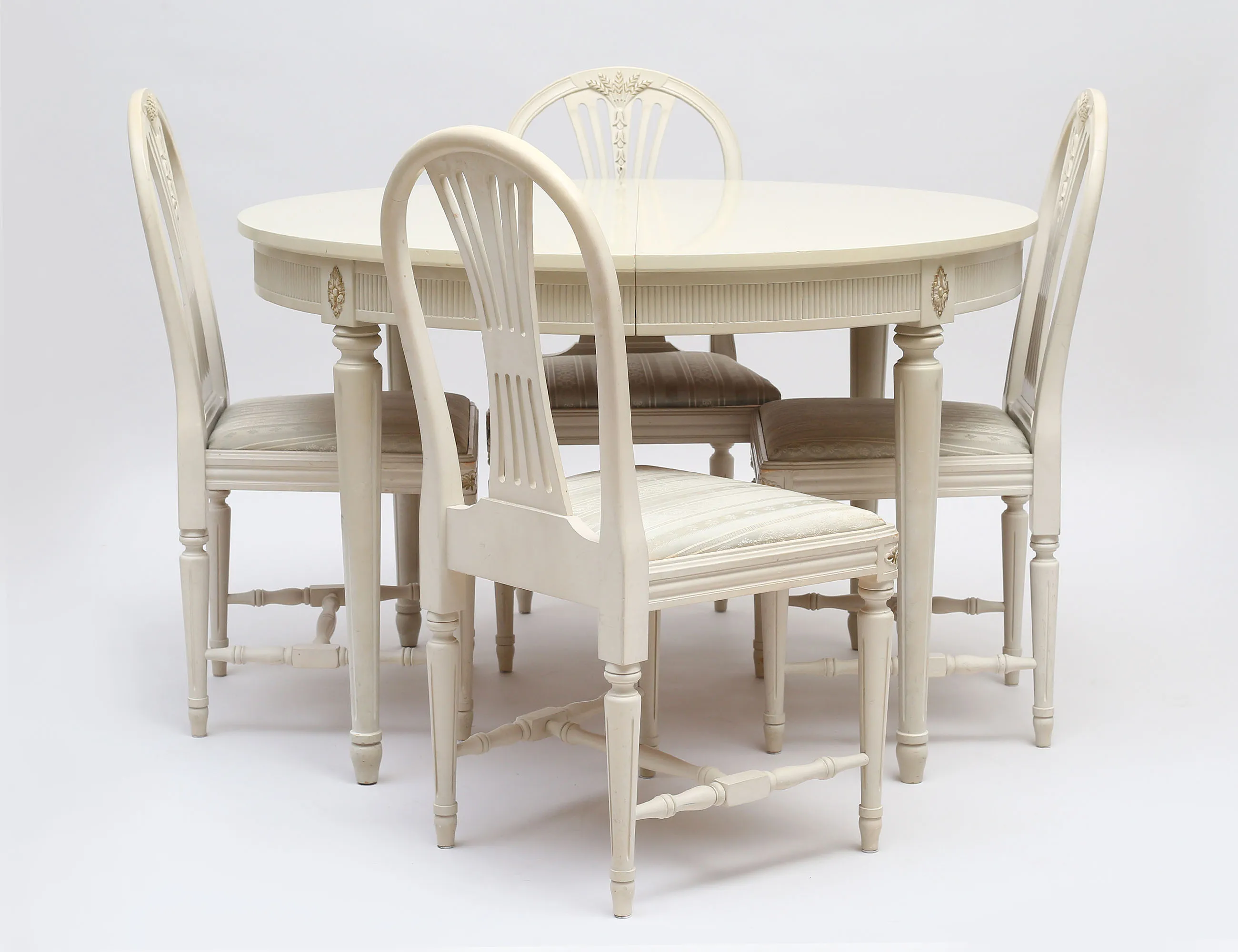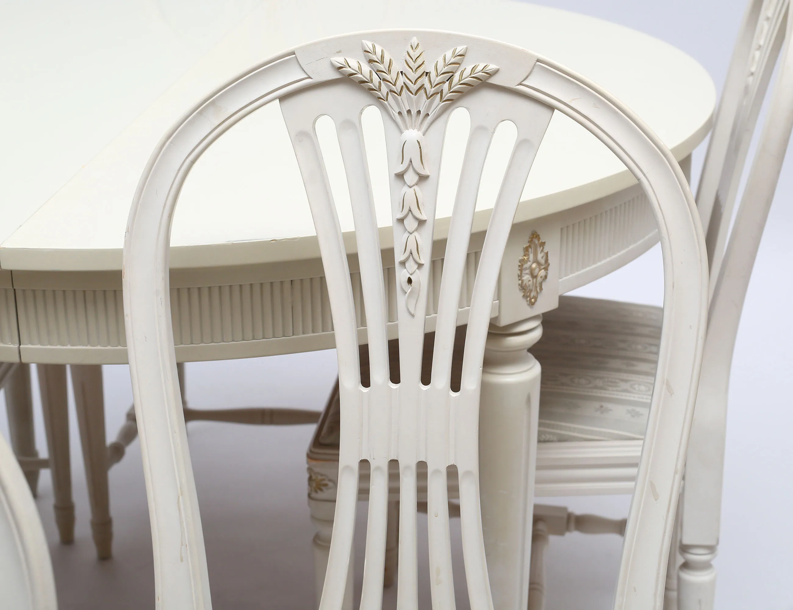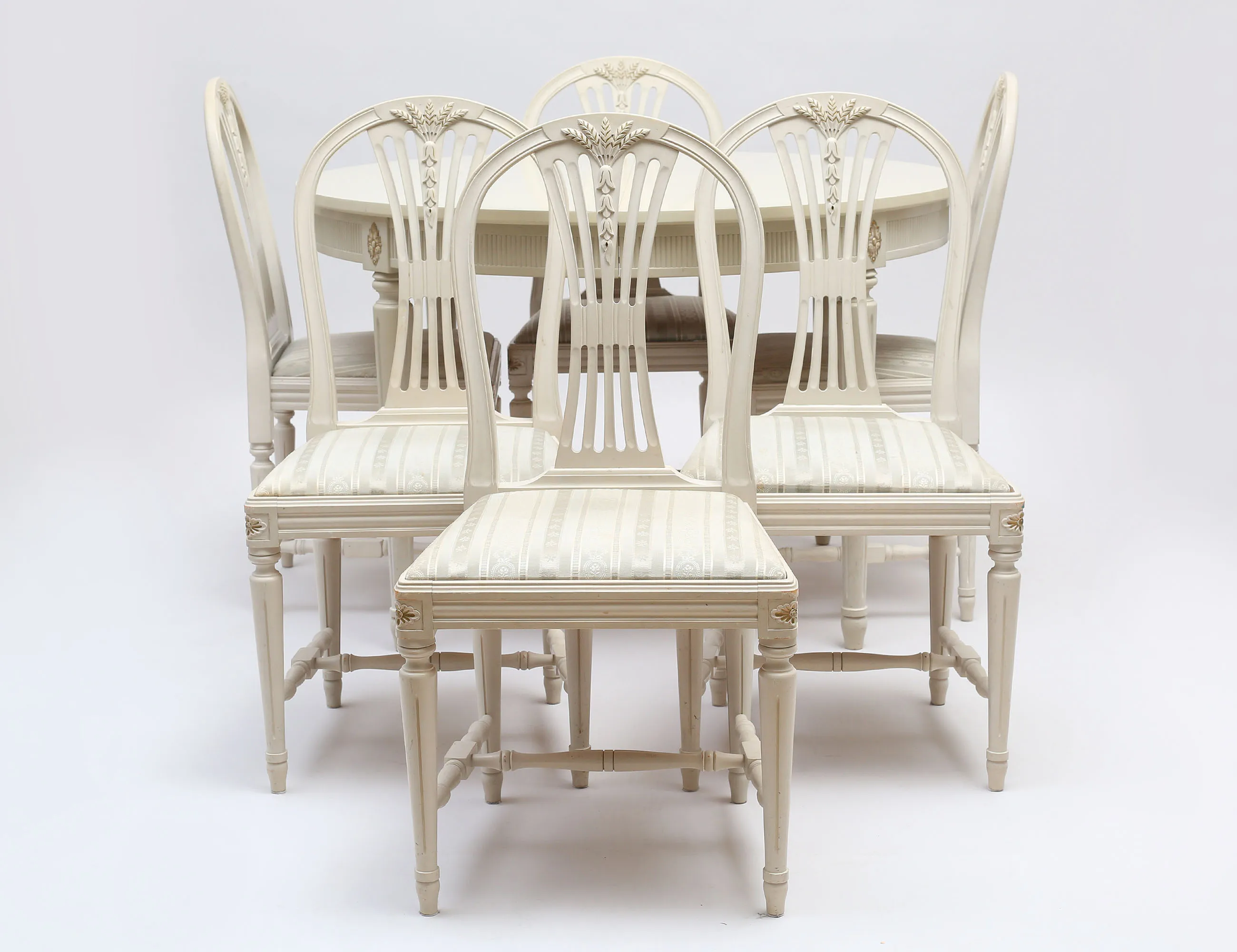 gustaviansk stil 1900-talets andra hälft, 6 stolar samt bord med 4 iläggsskivor, bemålat, lösa stoppade sitsar, bordets diameter 115, total längd 315 (bruksslitage/färgbortfall)
