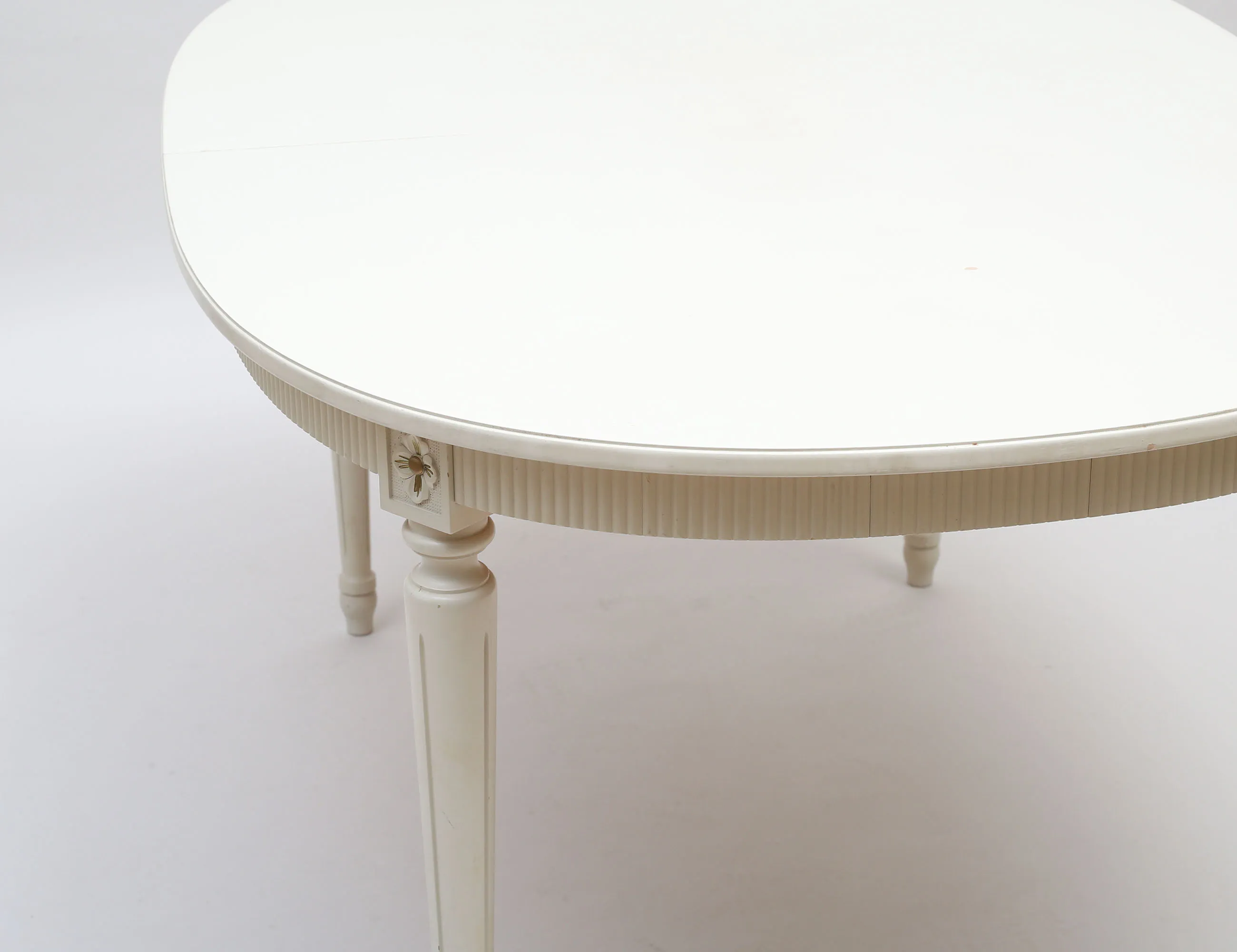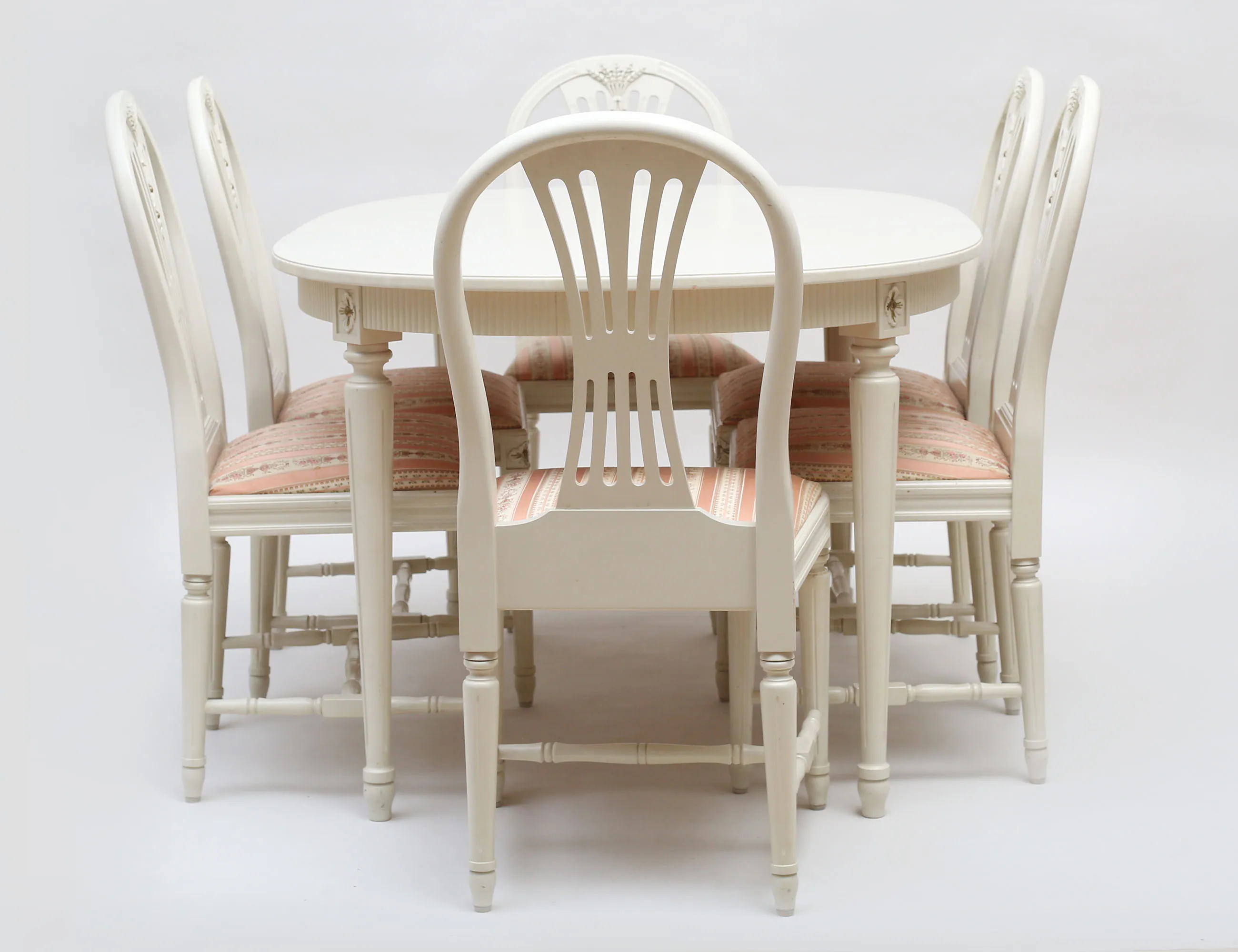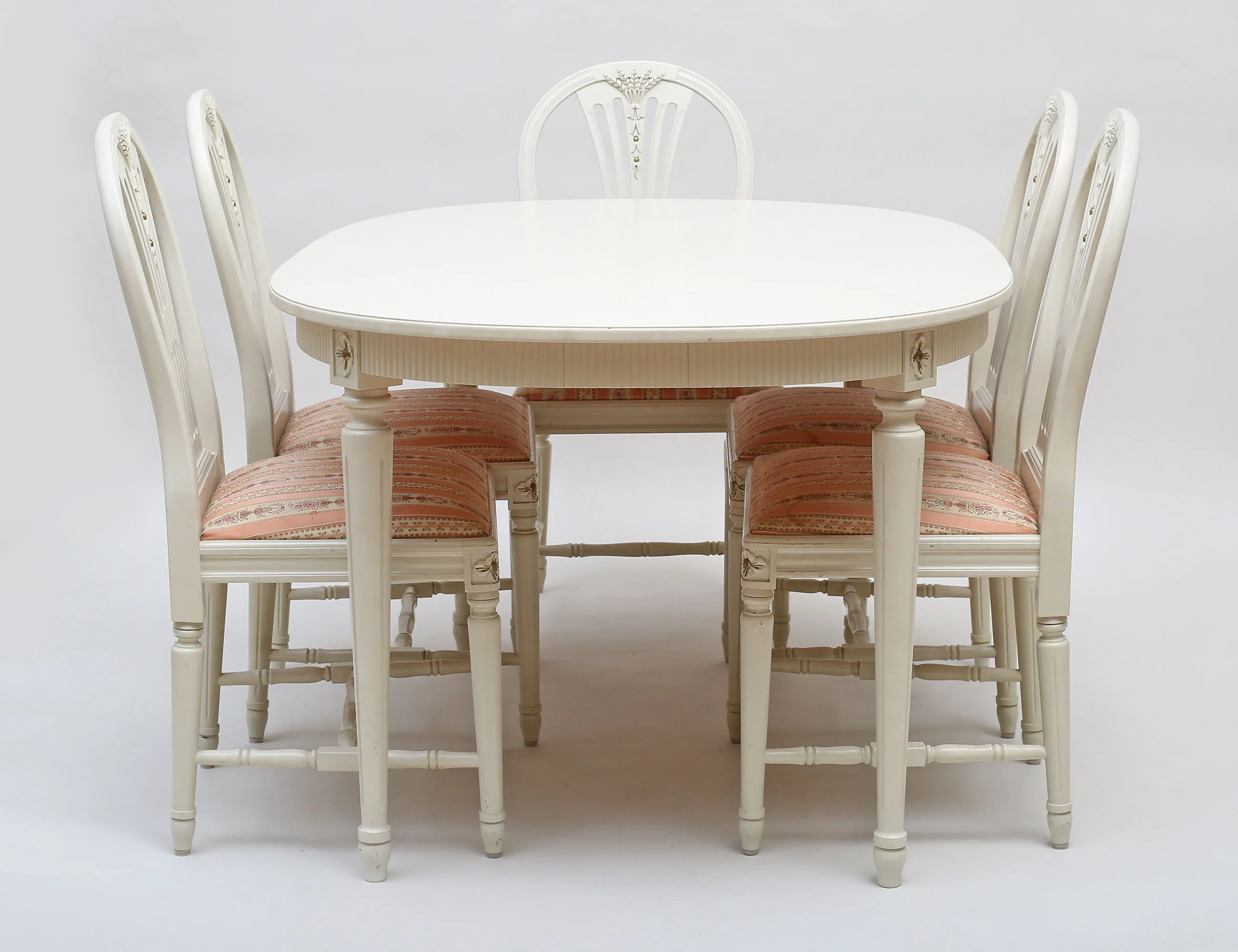 så kallad "Axet" 1900-talets andra hälft, 6 stolar samt bord med 2 iläggsskivor, träskuren dekor, bemålad, lösa stoppade sitsar, höjd 74, bredd 140x100, total längd 236 (skiva med punktmärke, färgavskav, sitsar med fläckar)