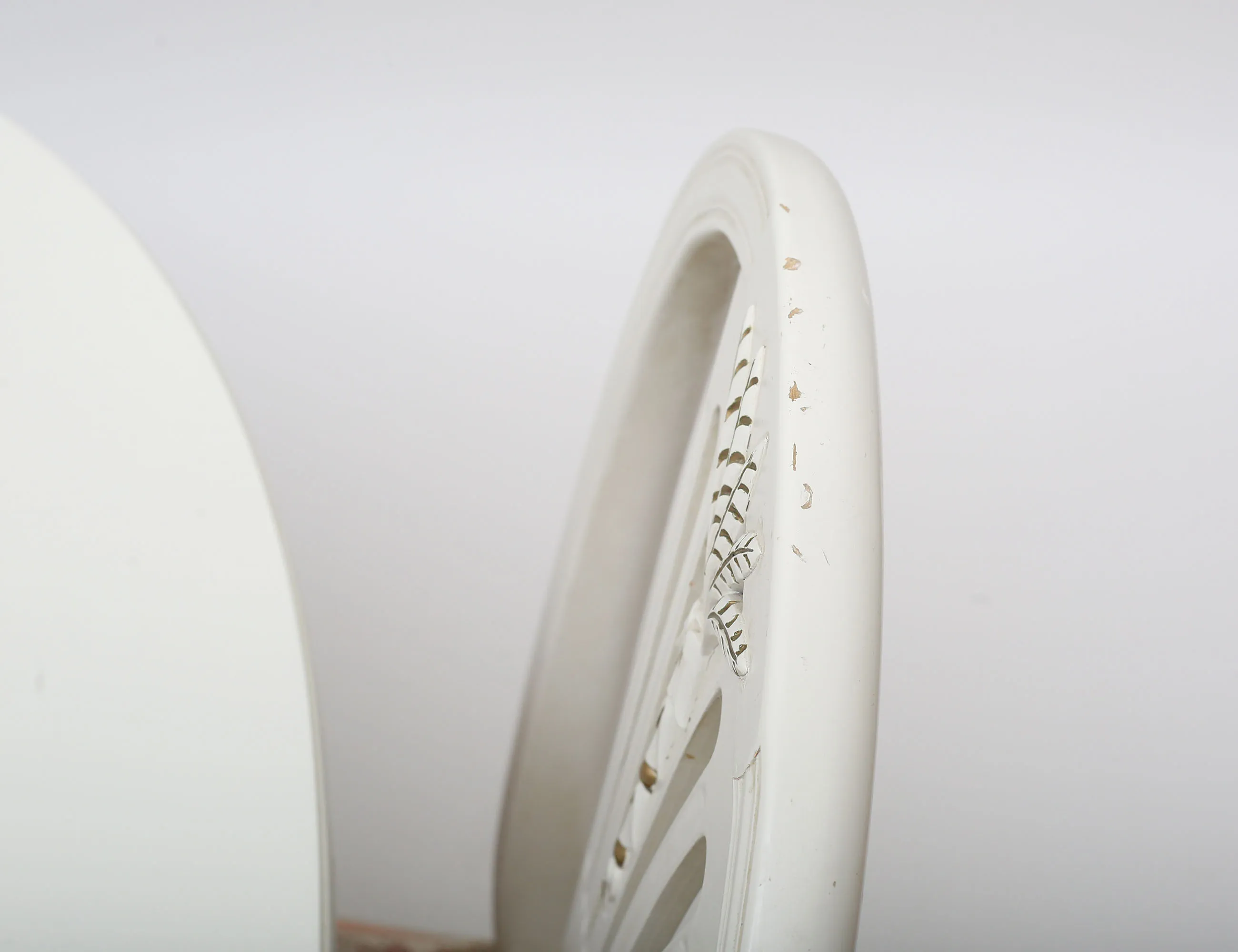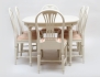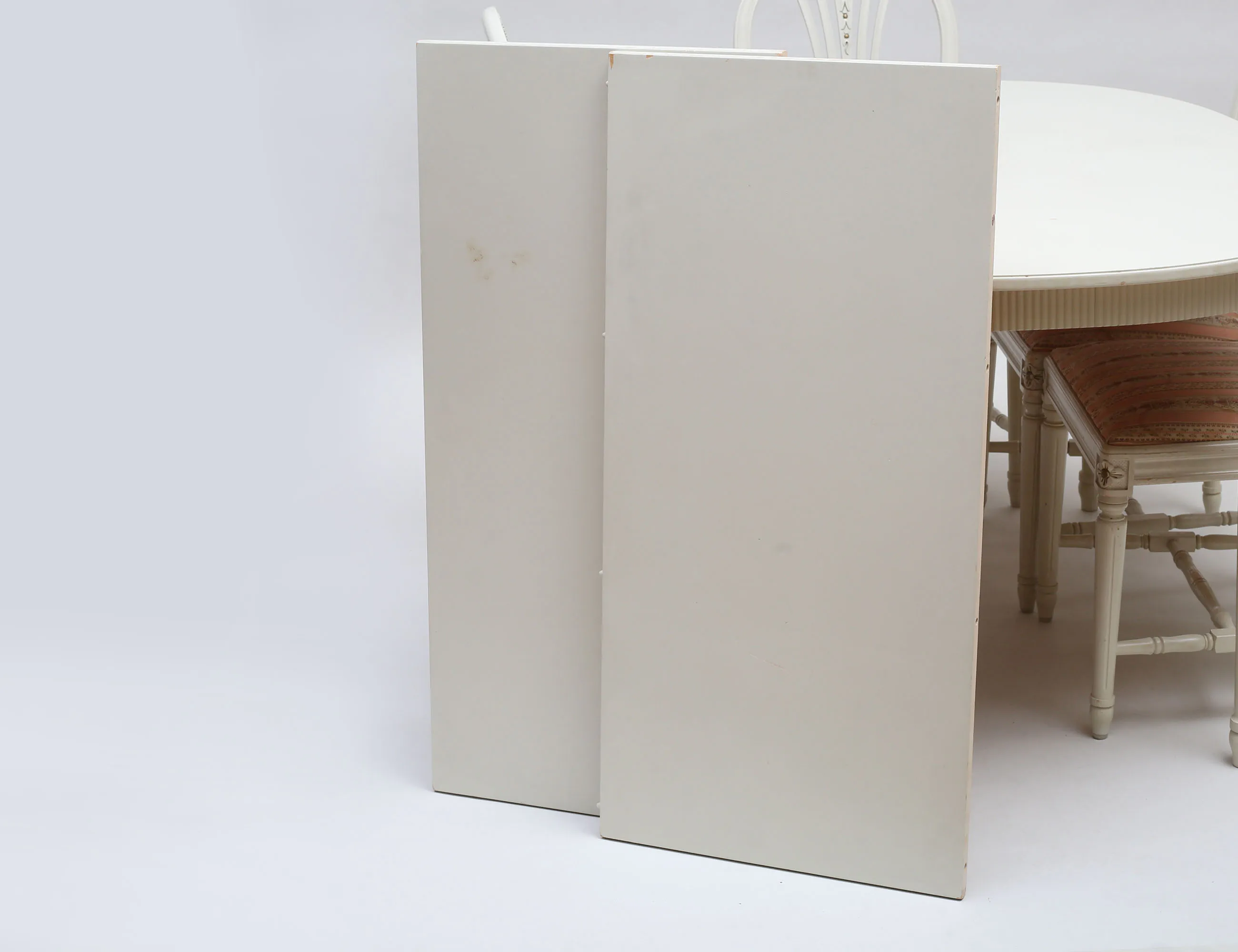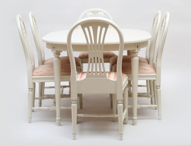 så kallad "Axet" 1900-talets andra hälft, 6 stolar samt bord med 2 iläggsskivor, träskuren dekor, bemålad, lösa stoppade sitsar, höjd 74, bredd 140x100, total längd 236 (skiva med punktmärke, färgavskav, sitsar med fläckar)