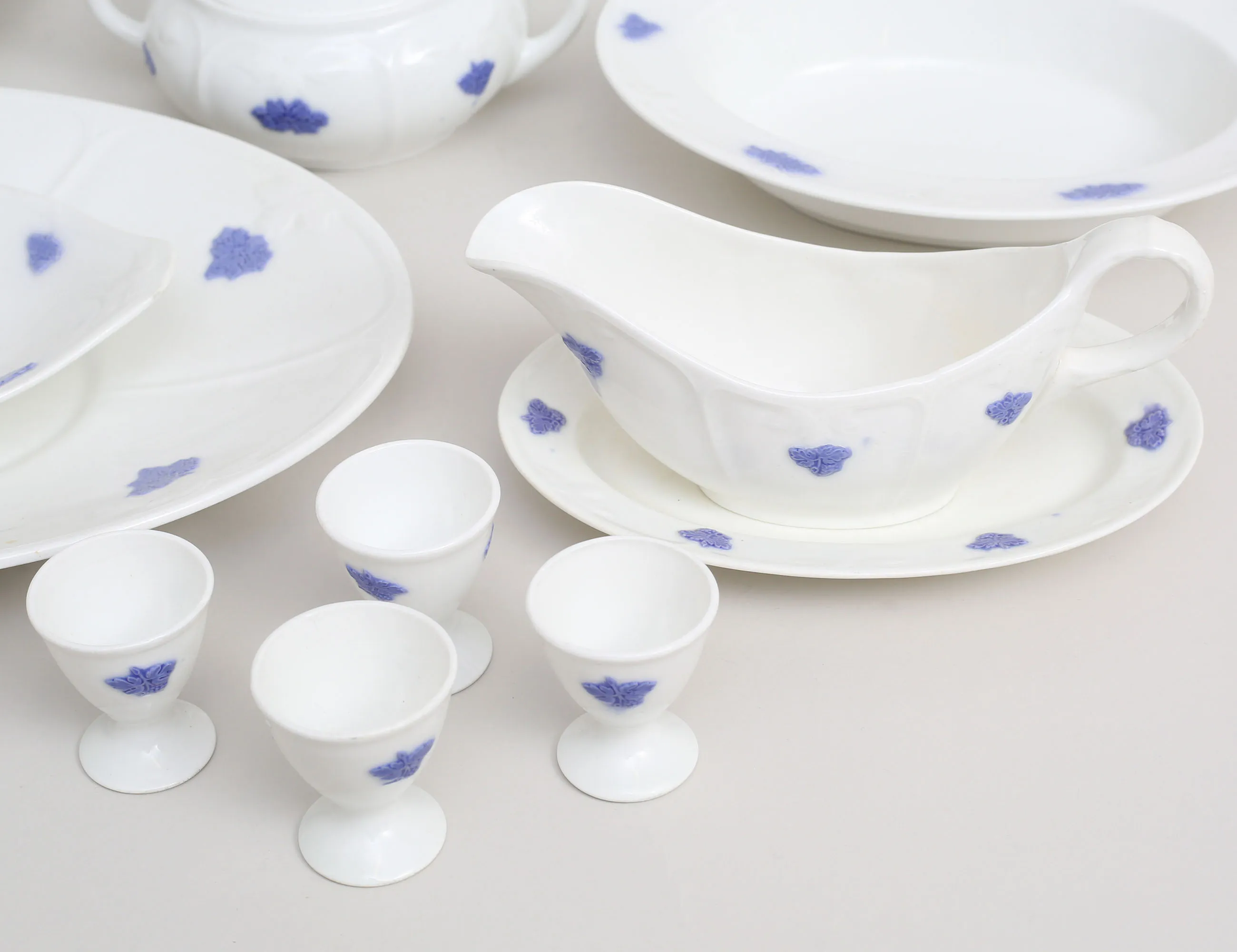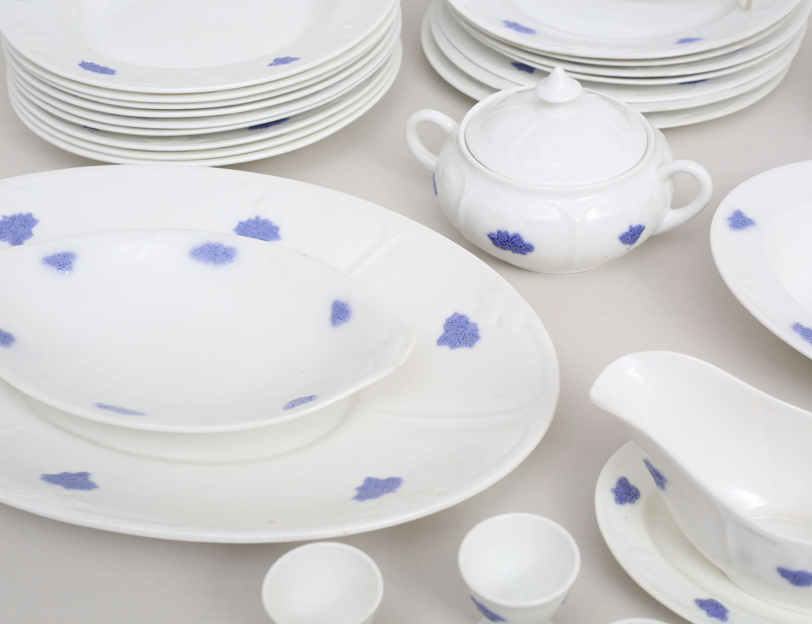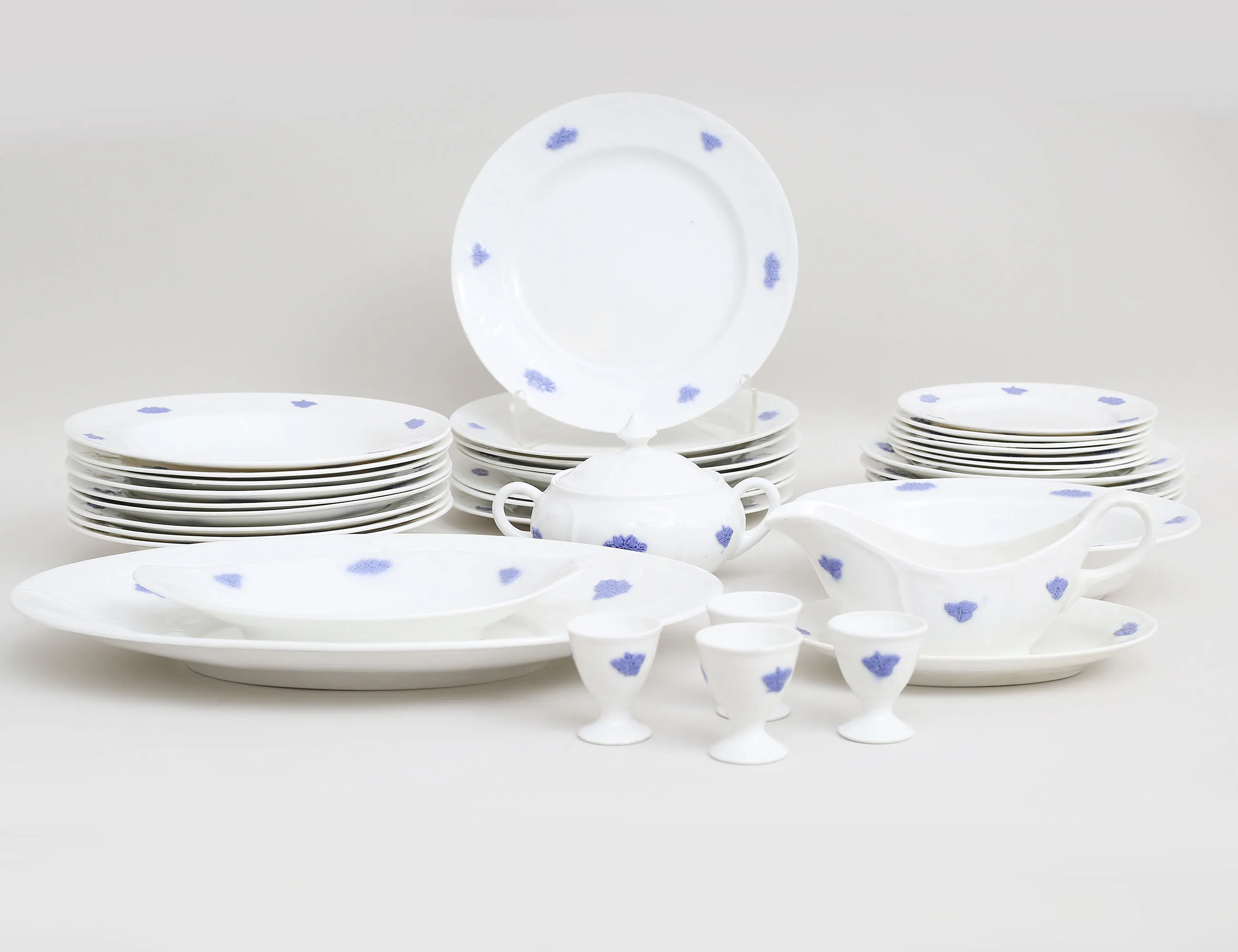 Gustavsberg 1900-talets första hälft, 8 mattallrikar, 9 djupa tallrikar, 5 förrätt, 7 assietter, 4 äggkoppar, uppläggningsfat m.m., diameter 17-24 (bruksslitage)