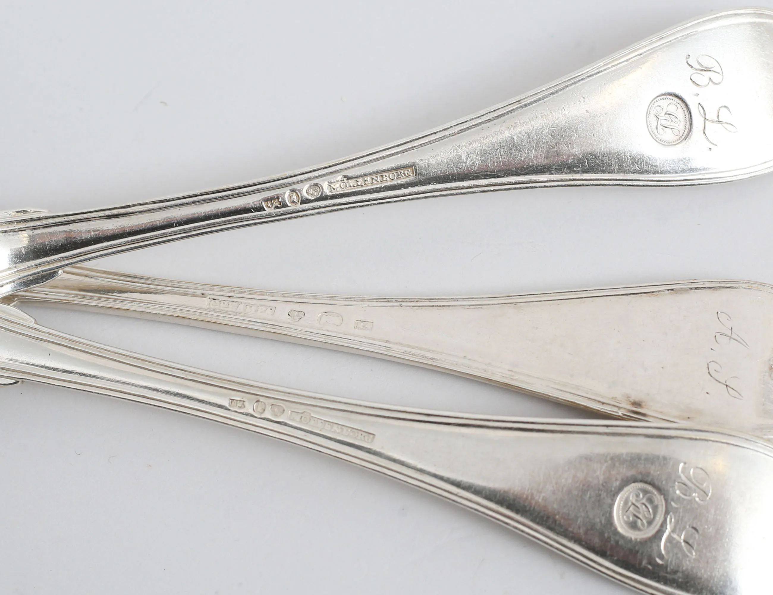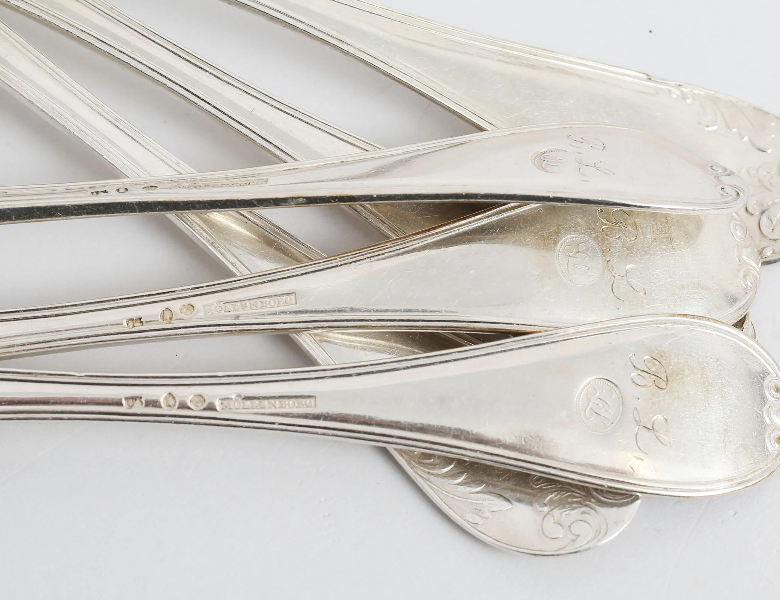 varav 5 stycken Gustaf Möllenborg Stockholm 1826, samt 1 Carl Petter Lampa Stockholm 1826, modell "gammalfransk", vikt 416 gram (monogram)
