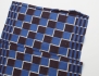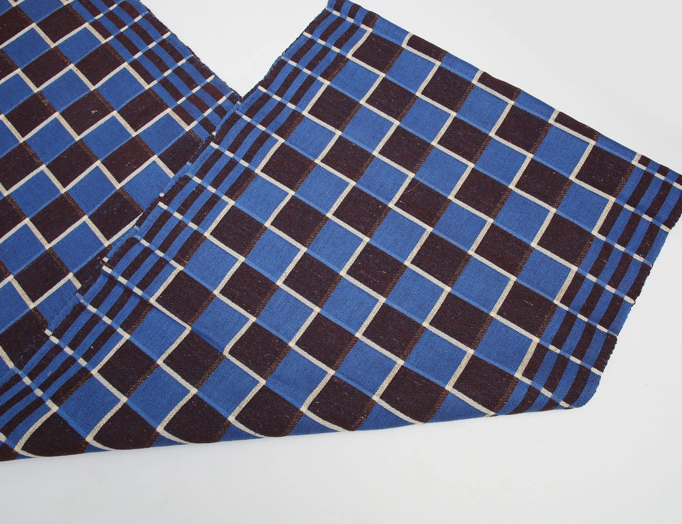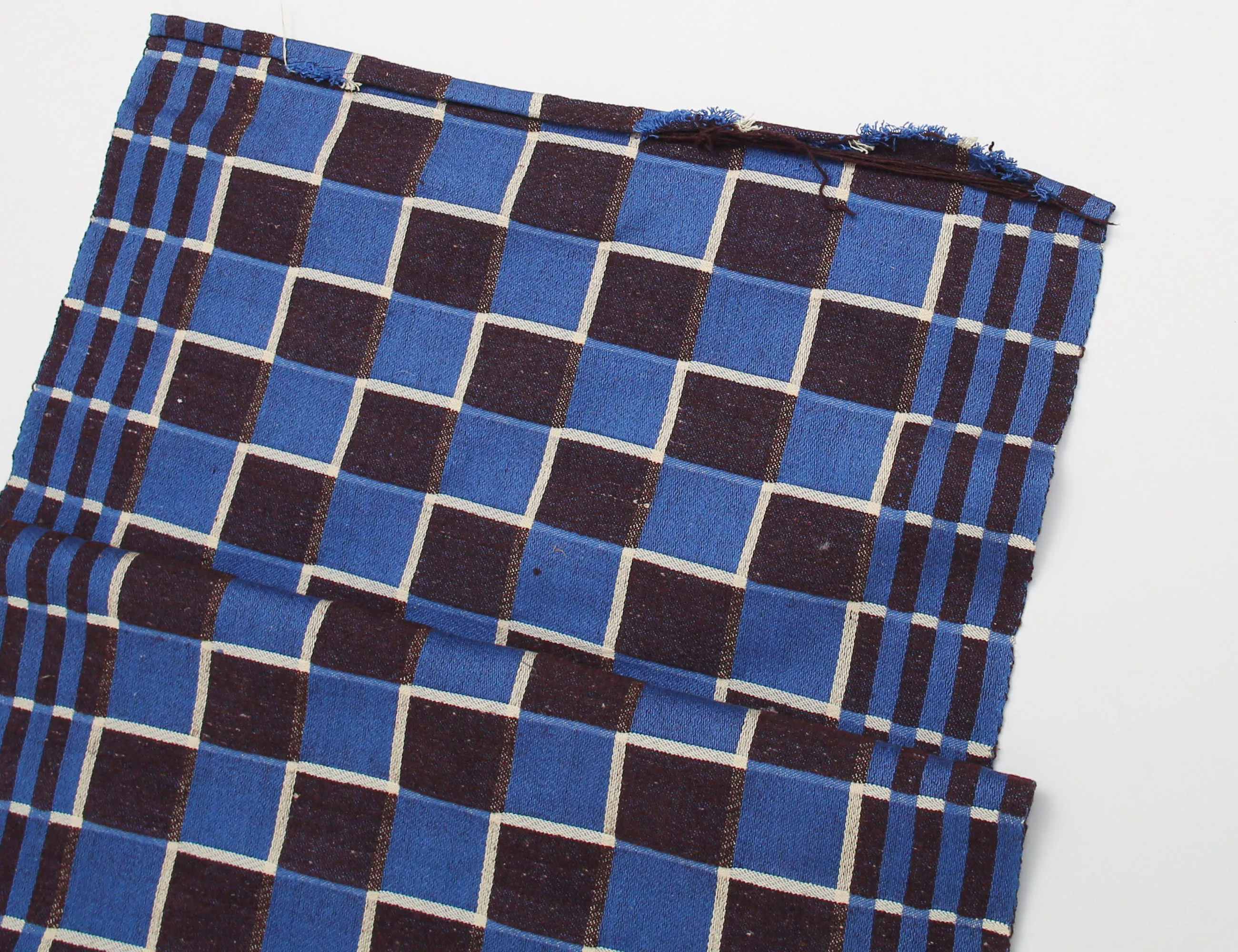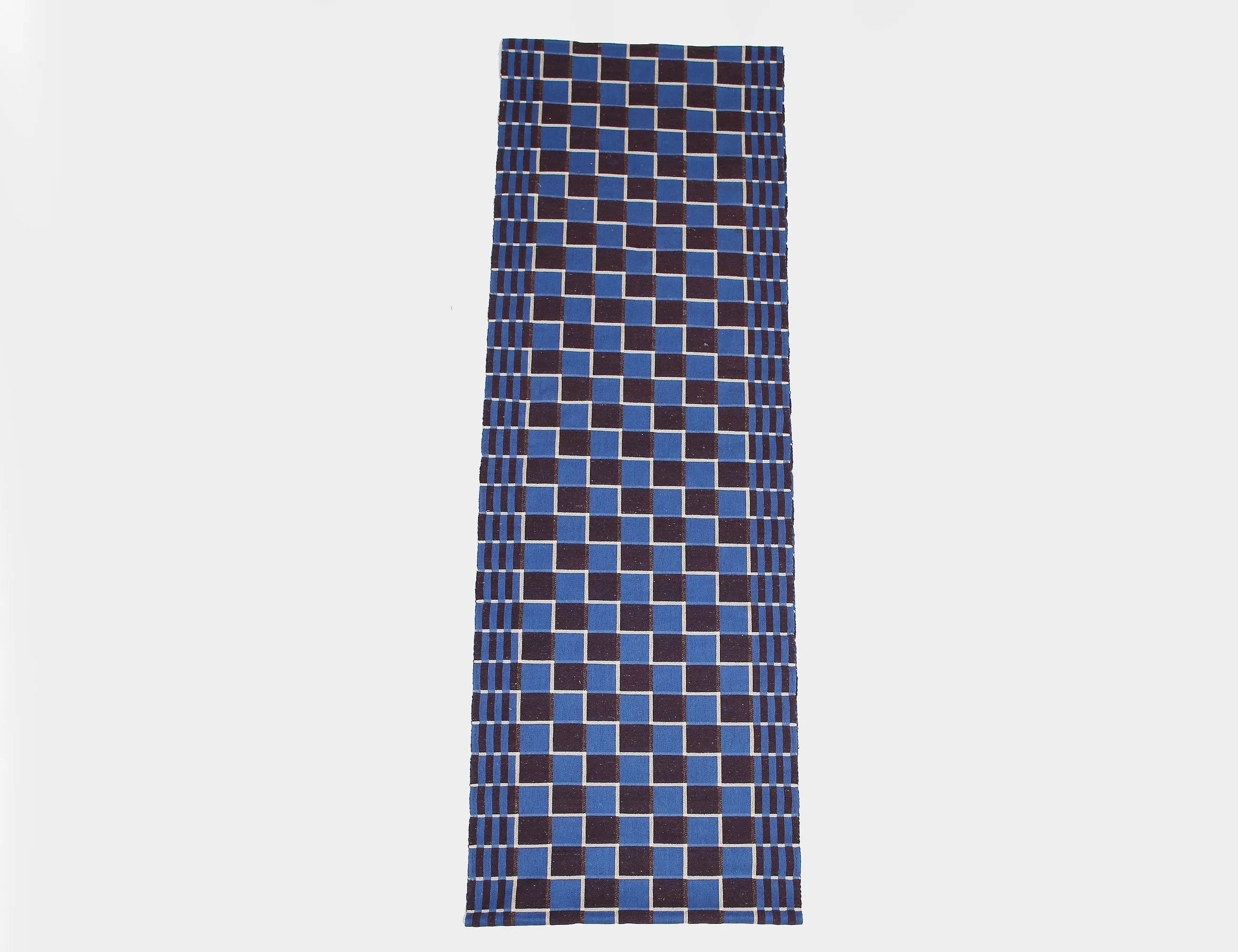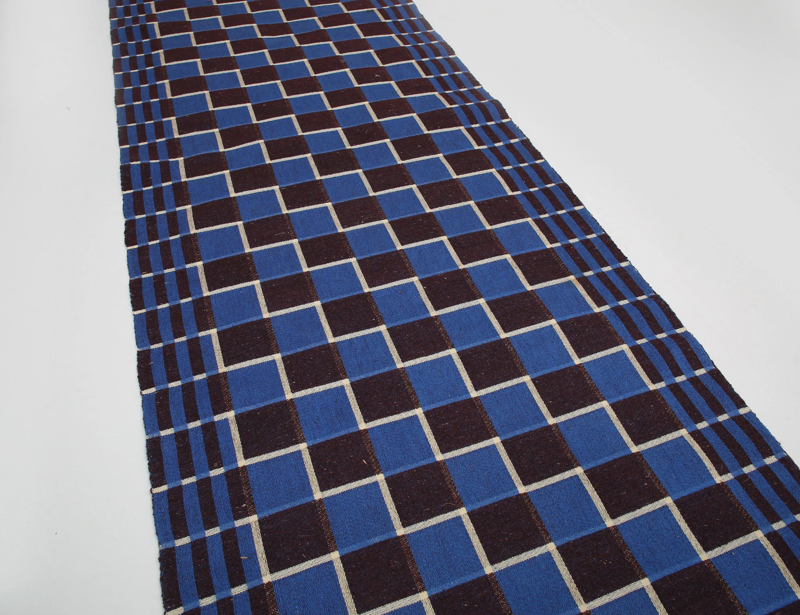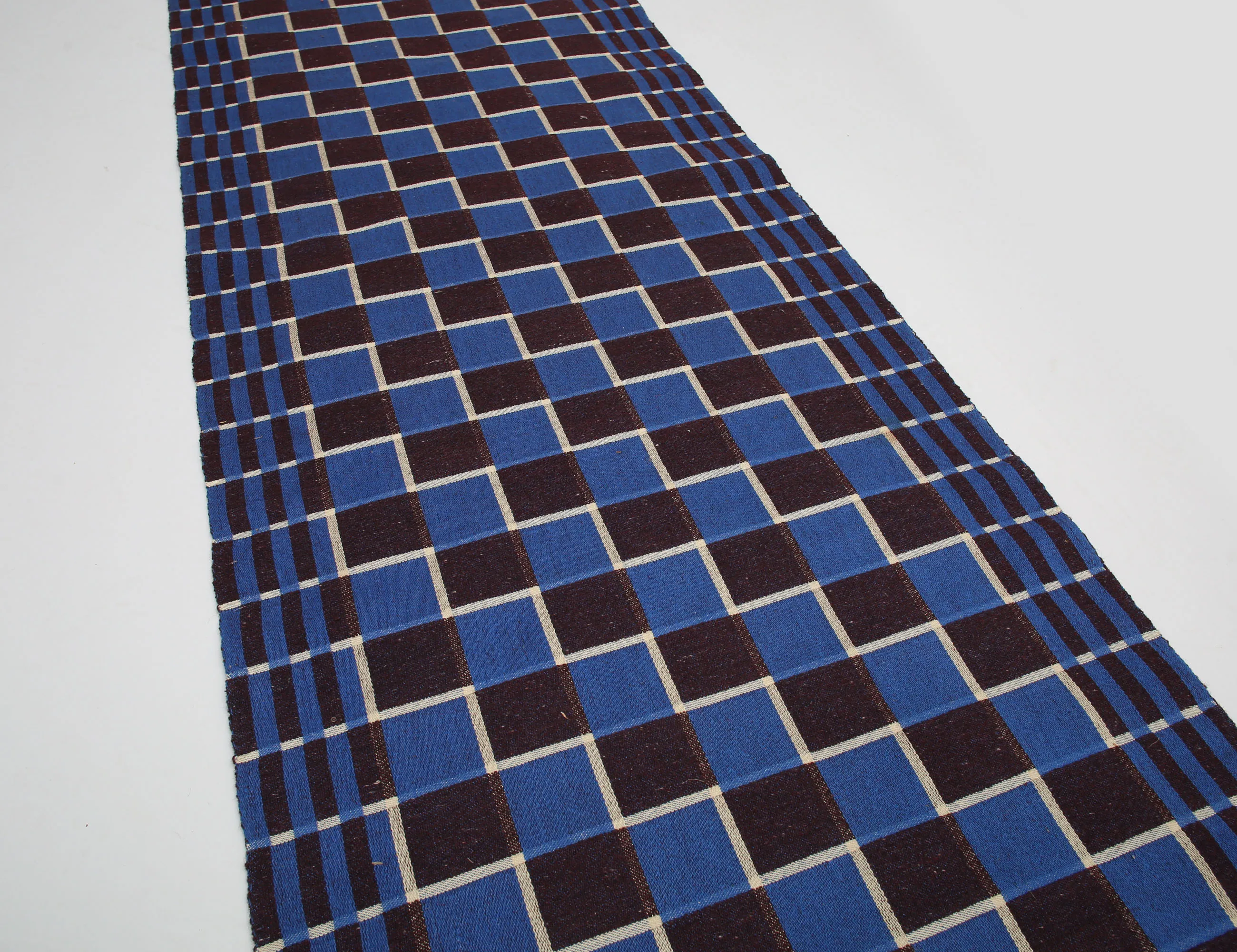 ull, dubbelvävd, geometriskt mönster i blått, brunt och vitt, vävd av Hanna Johansson, 380x60 (ena fållen gått upp)