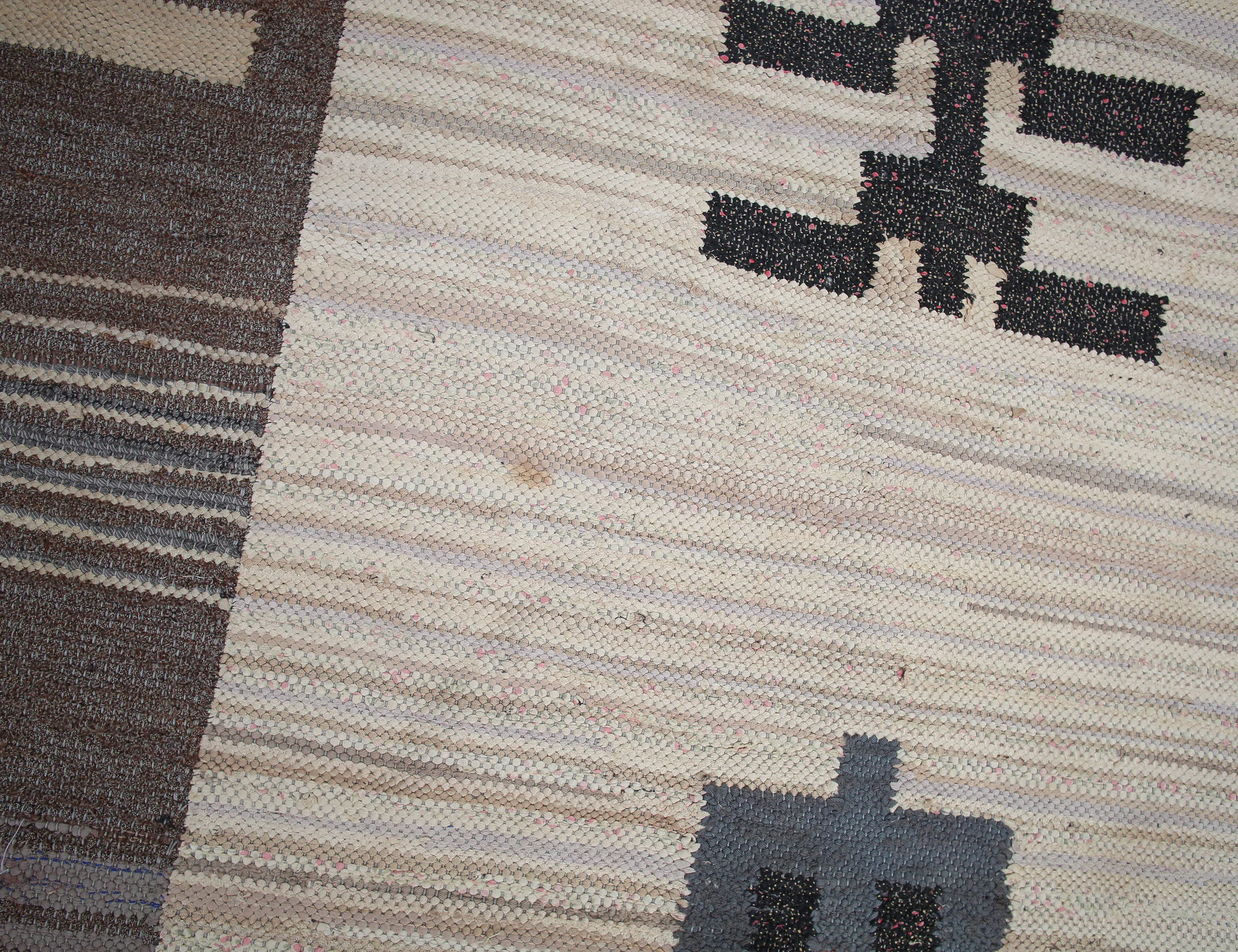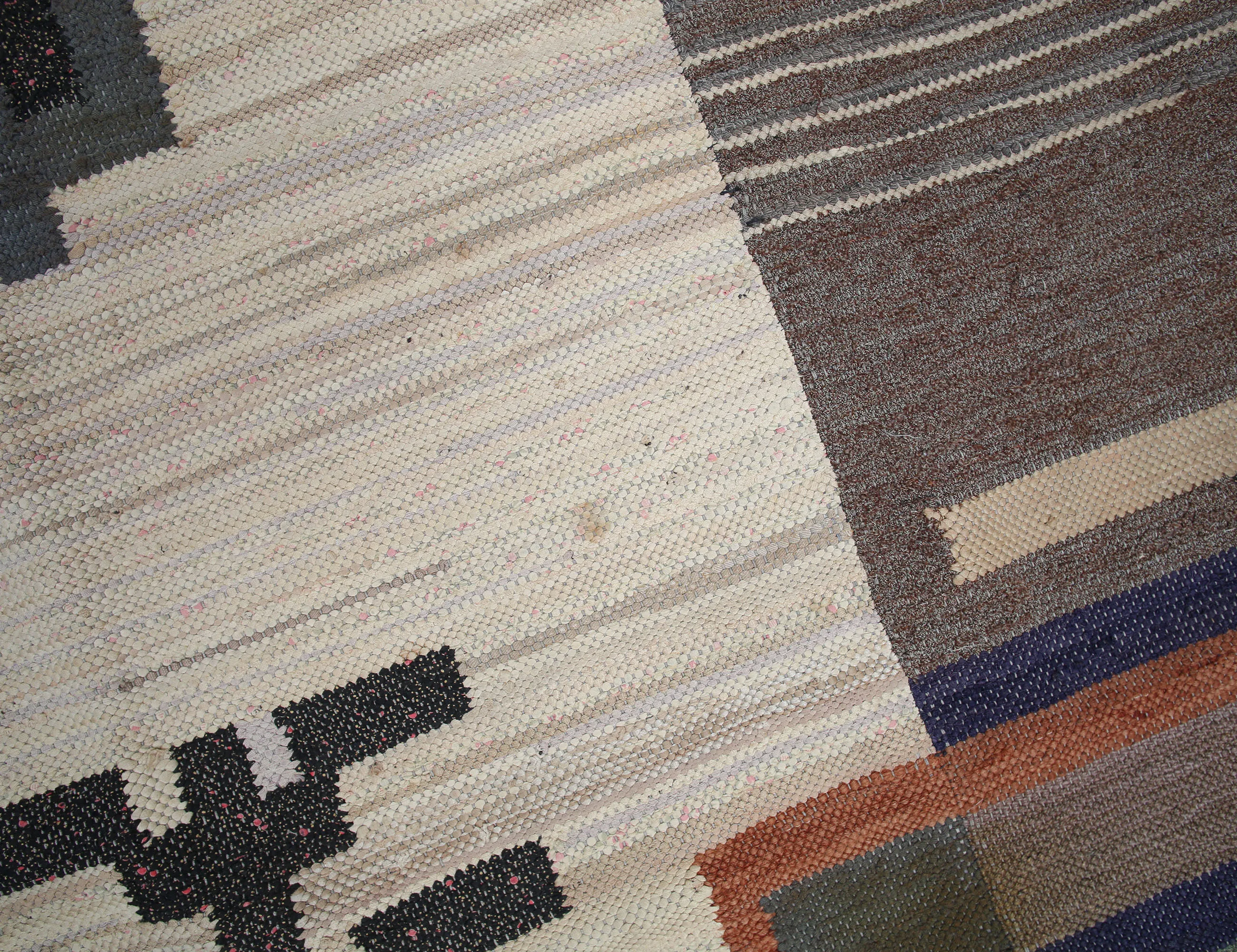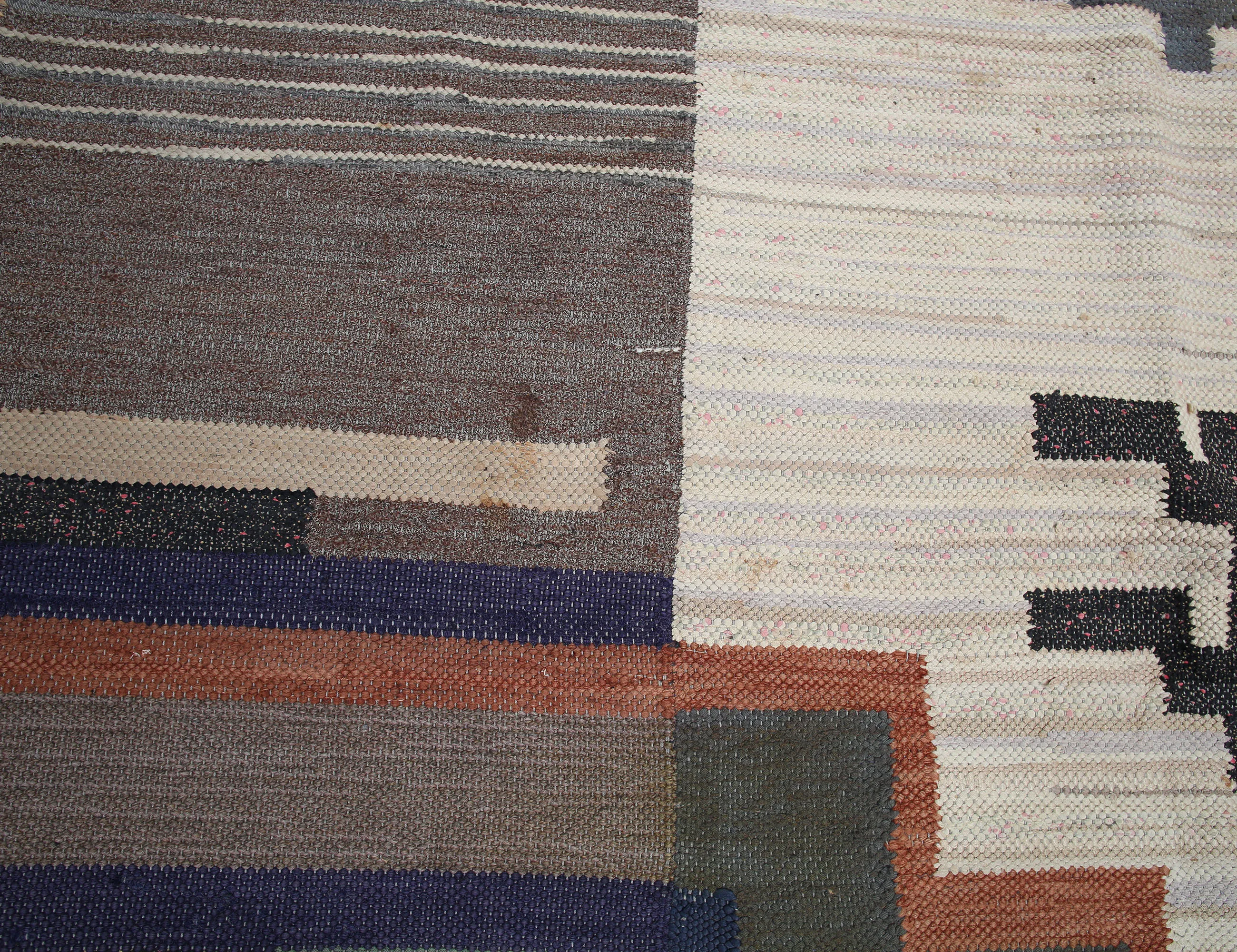 varp i lin, inslag i bomull, geometriskt mönster, vävt i tre sammanfogade våder, vävd av Hanna Johansson, 260x180 (fläckar)