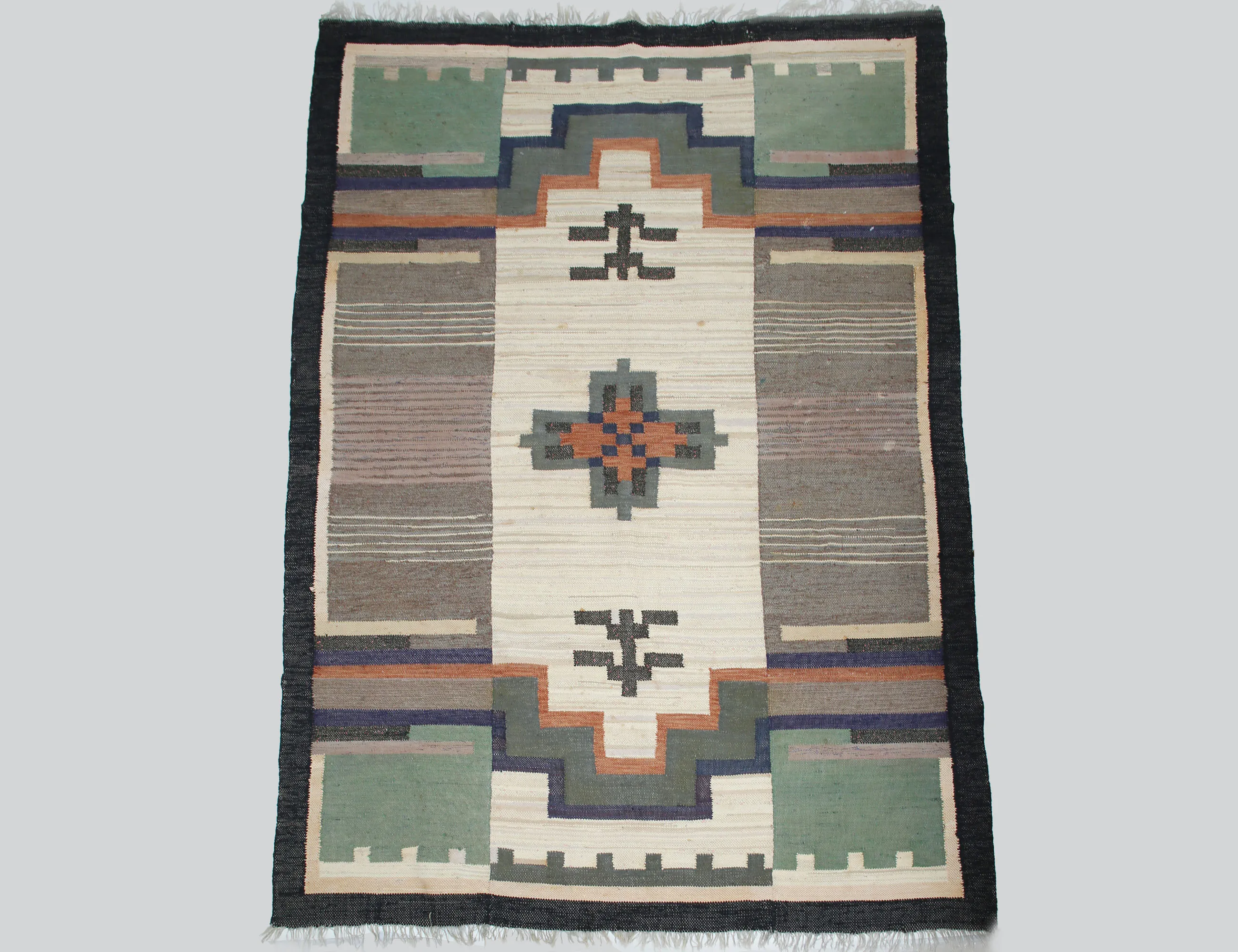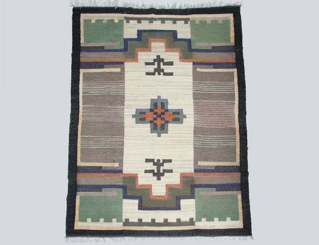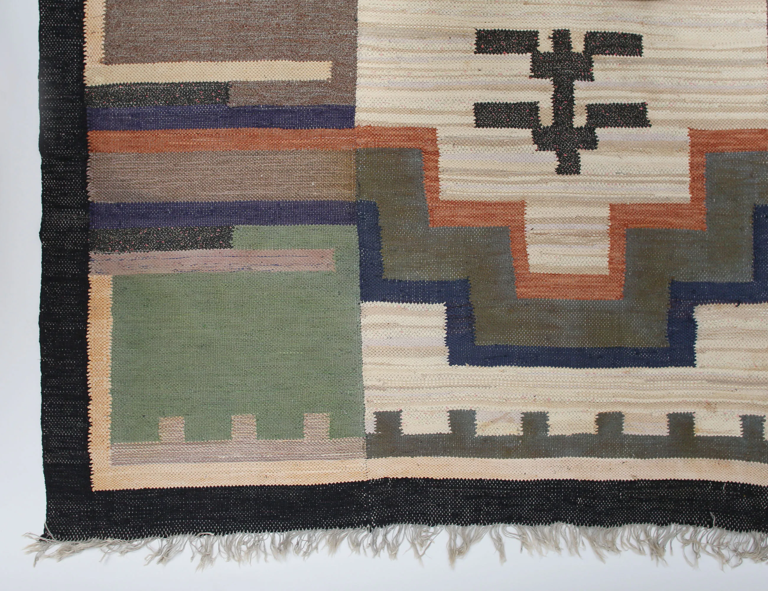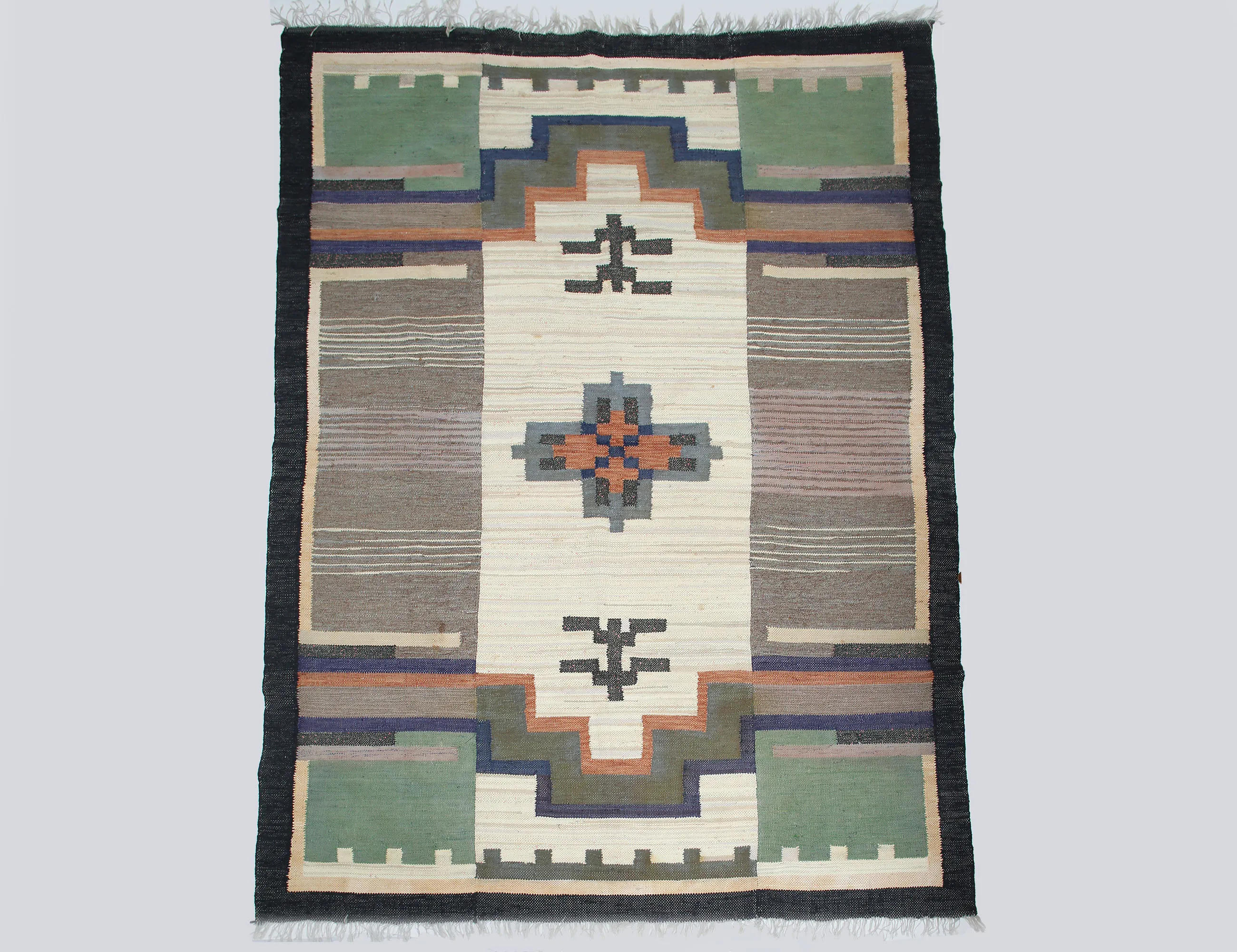varp i lin, inslag i bomull, geometriskt mönster, vävt i tre sammanfogade våder, vävd av Hanna Johansson, 260x180 (fläckar)
