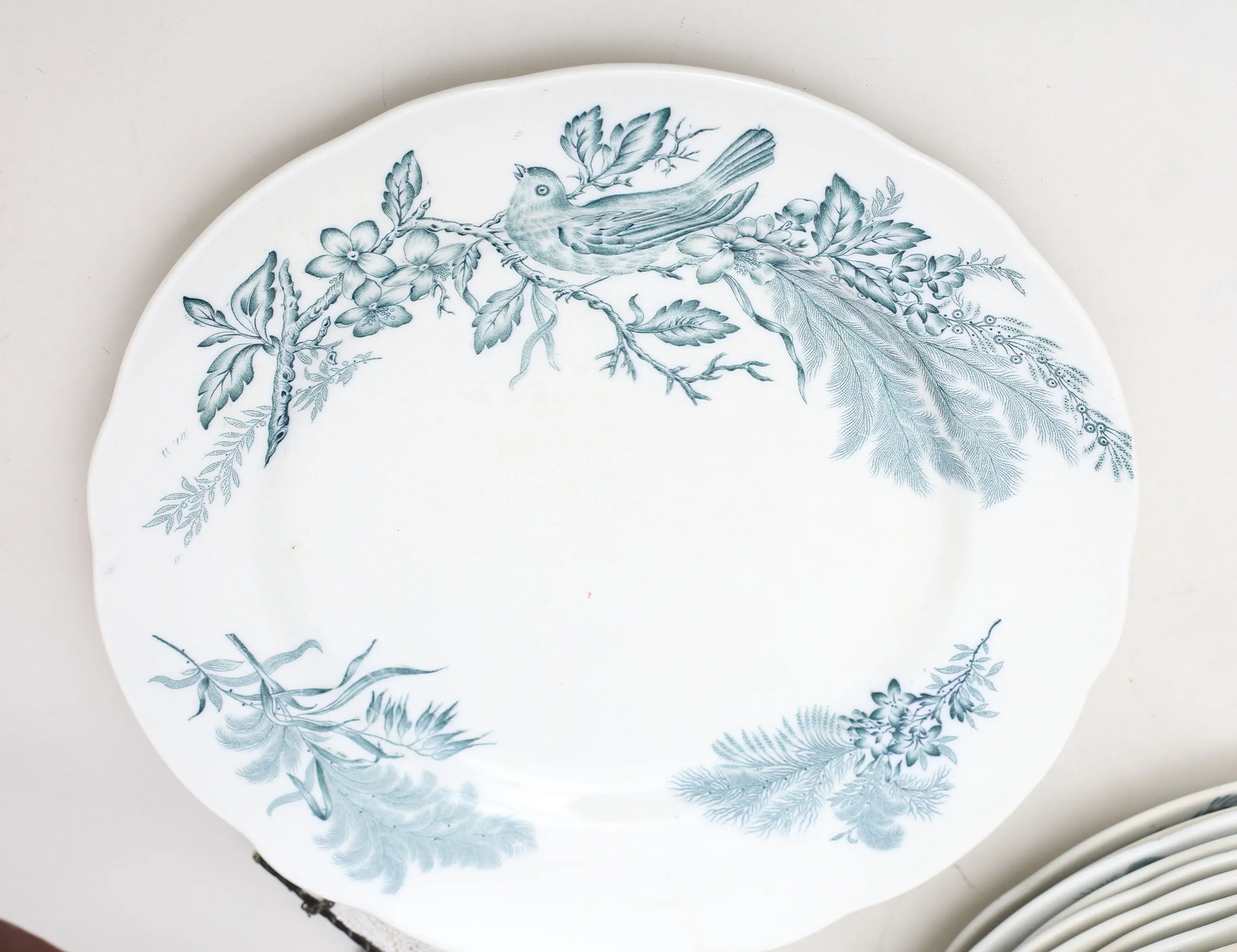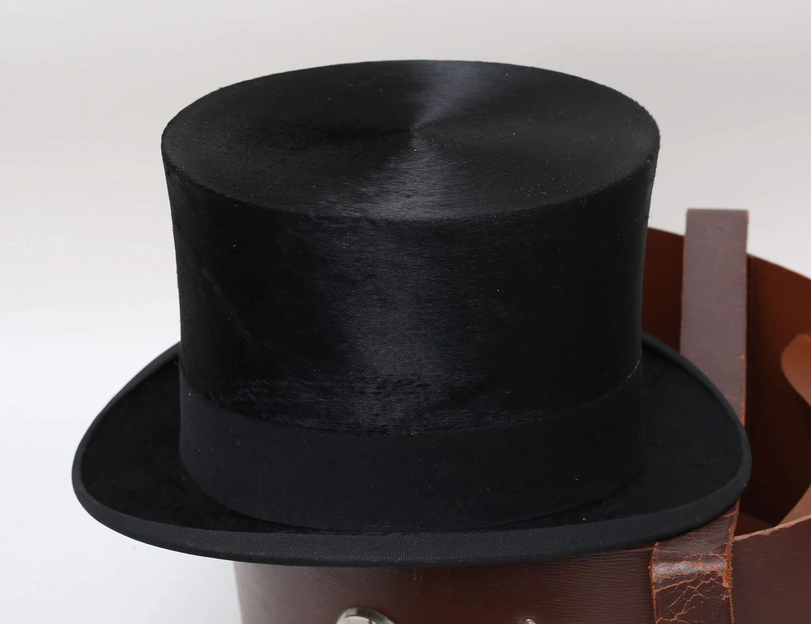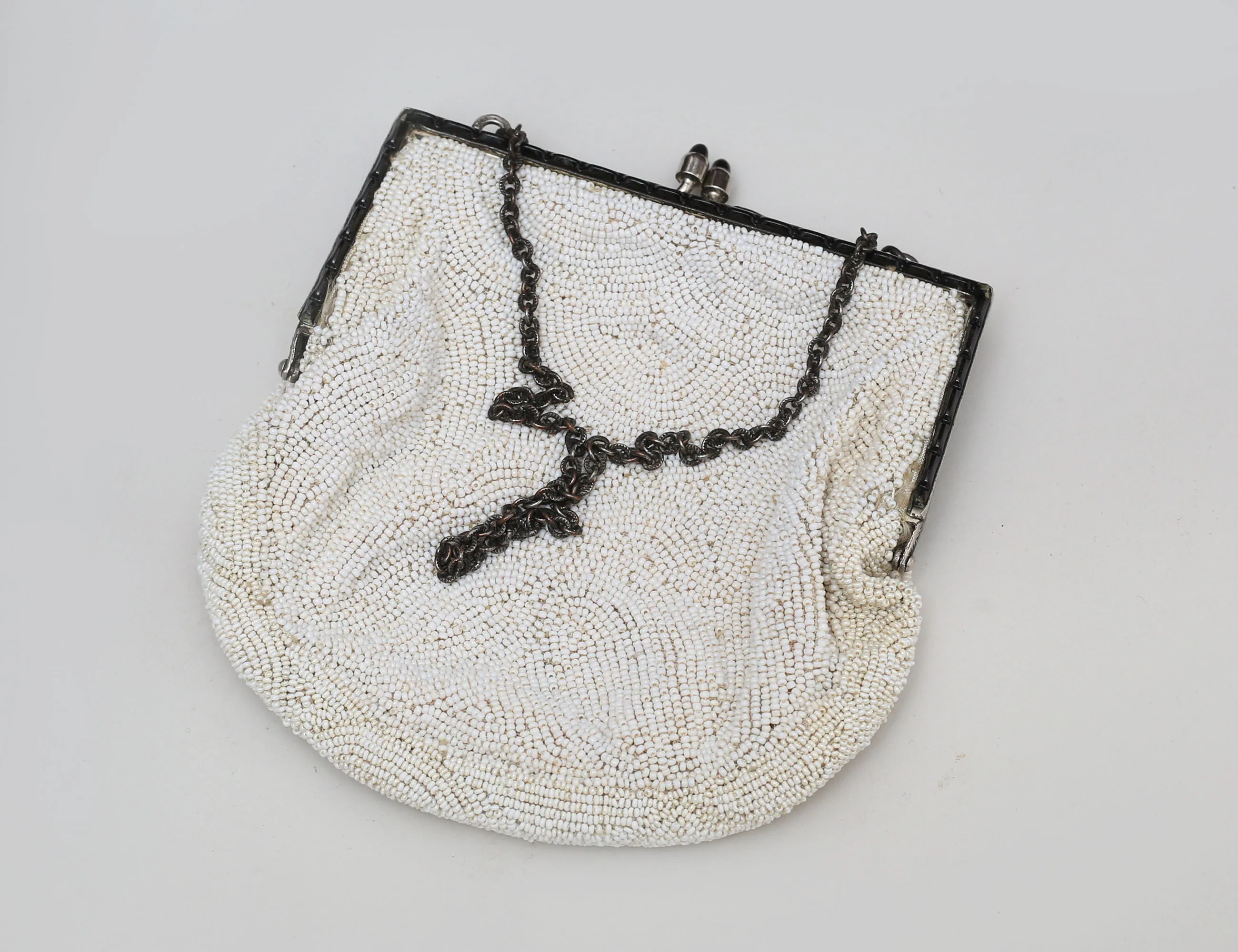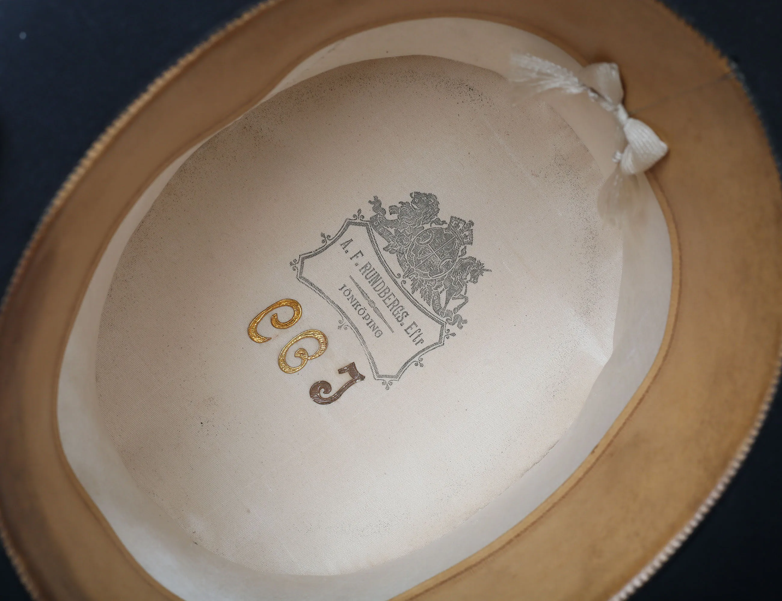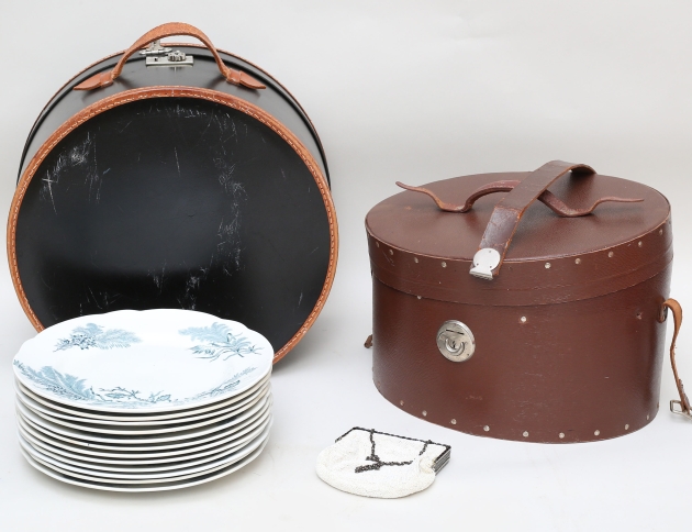 Rörstrand tidigt 1900-tal, diameter 25,5, aftonväska pärlbroderi, bygel i vitmetall med svart dekor, höjd 13, cylinderhatt tidigt 1900-tal, märkt A.F. Rundbergs Eftr. Jönköping, i ask, hattask