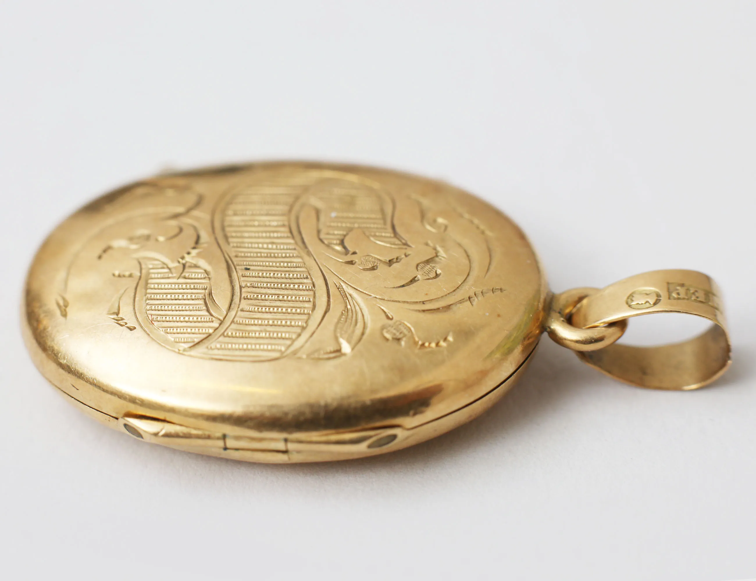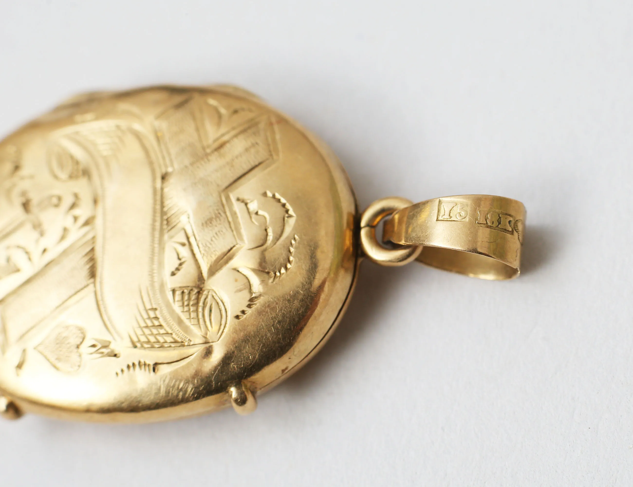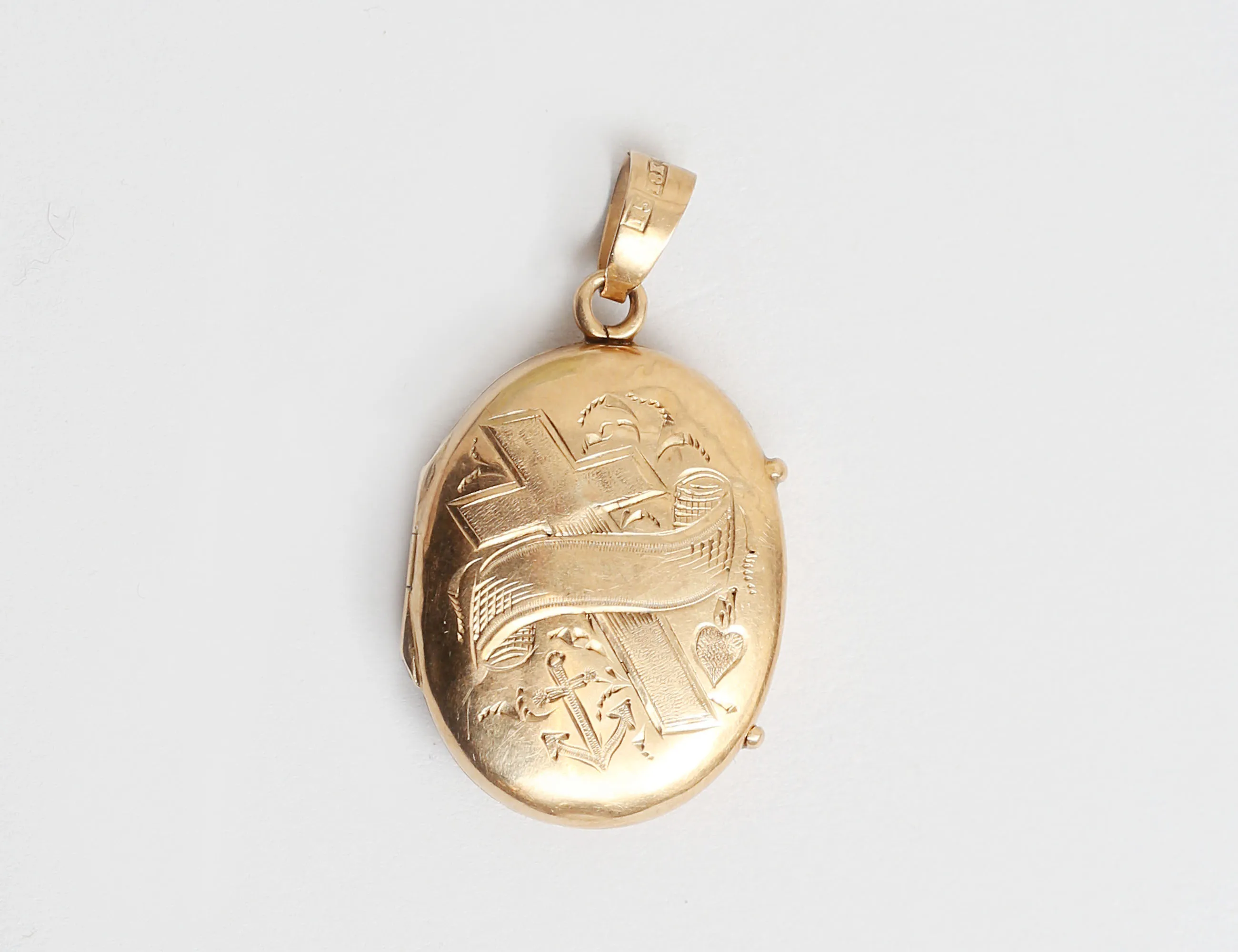 JEP Stockholm 1877, heltäckande graverad dekor av bl a ankare, hjärta och kors, invändigt fotografier, guldvikt 4,43 gram, höjd 3,7 cm