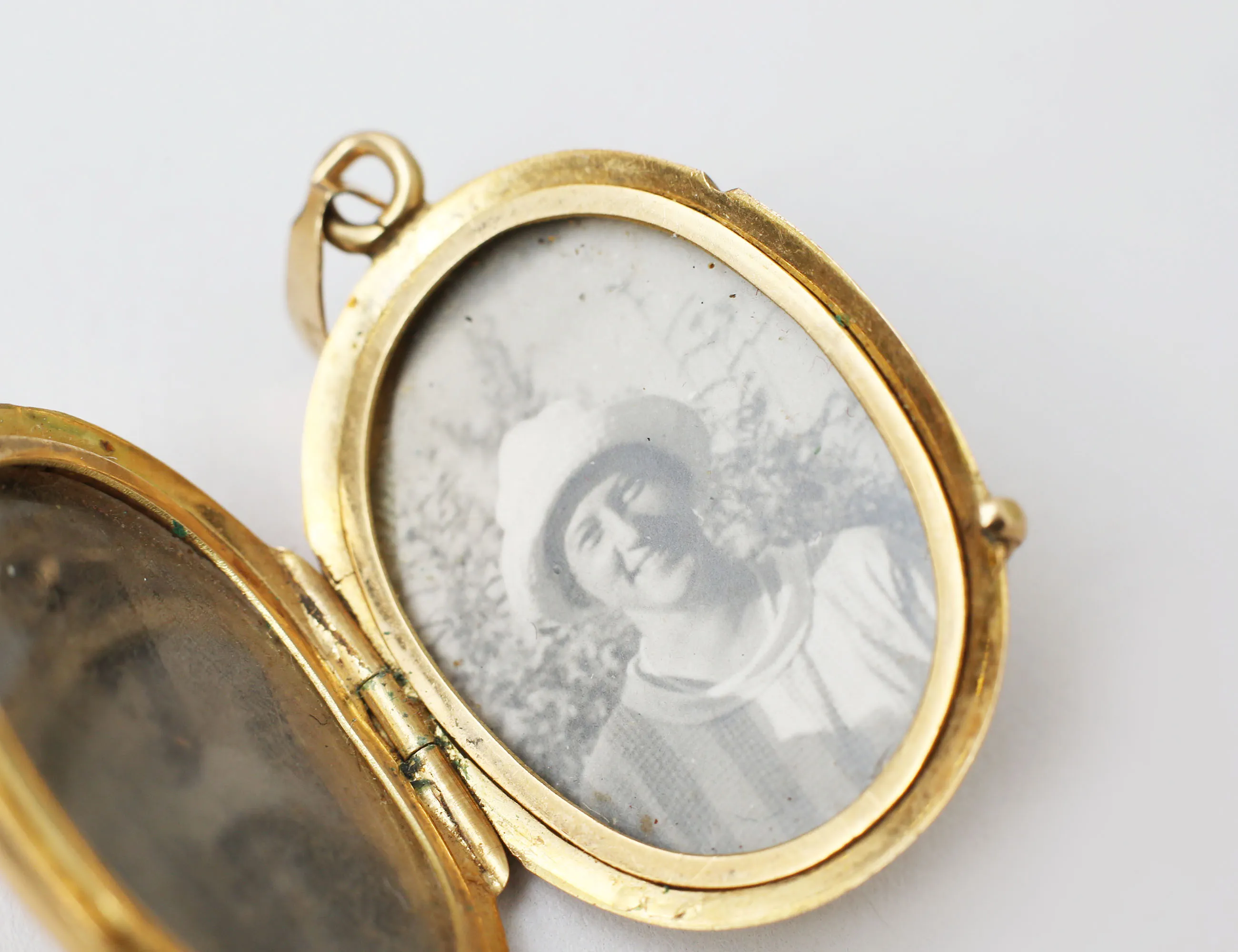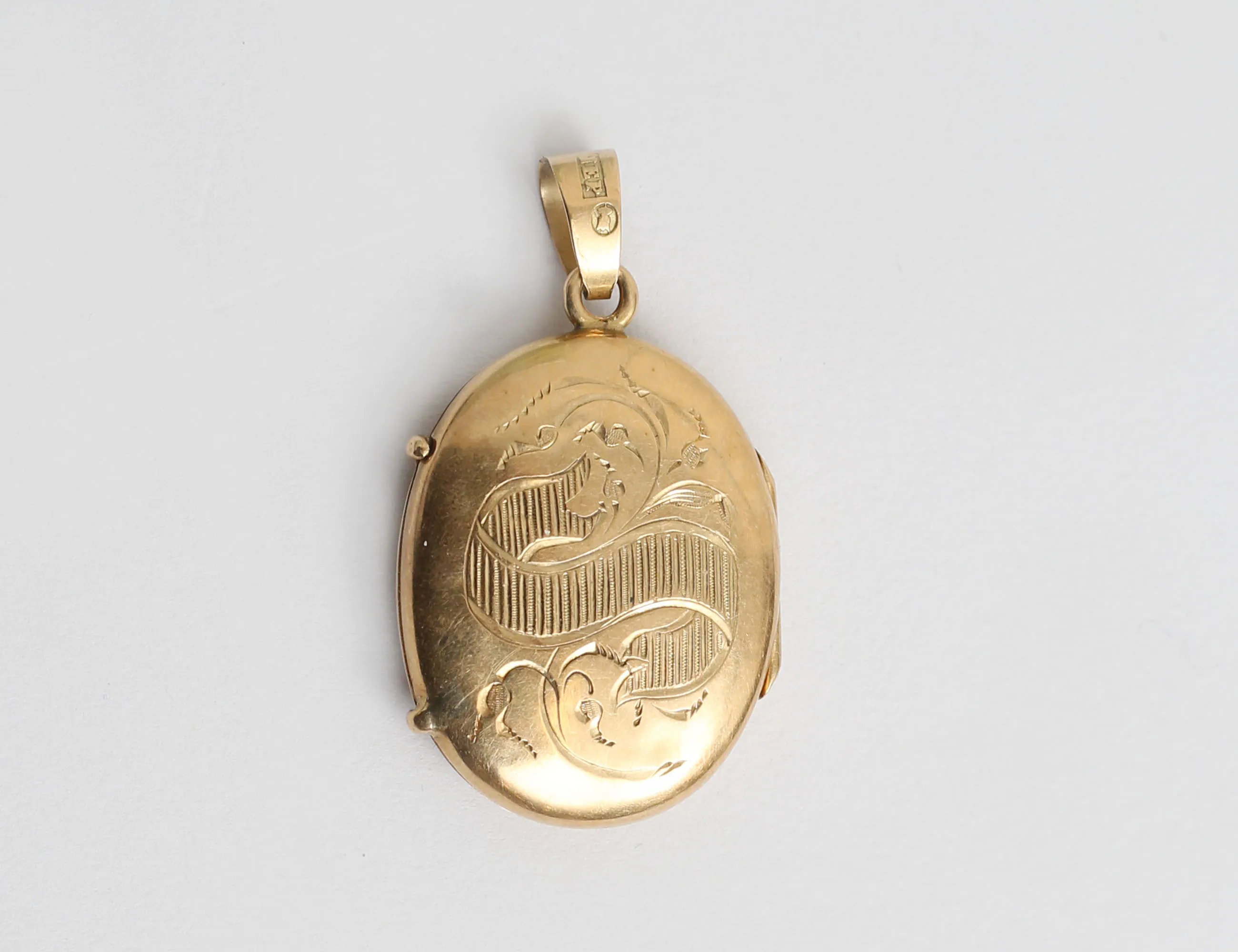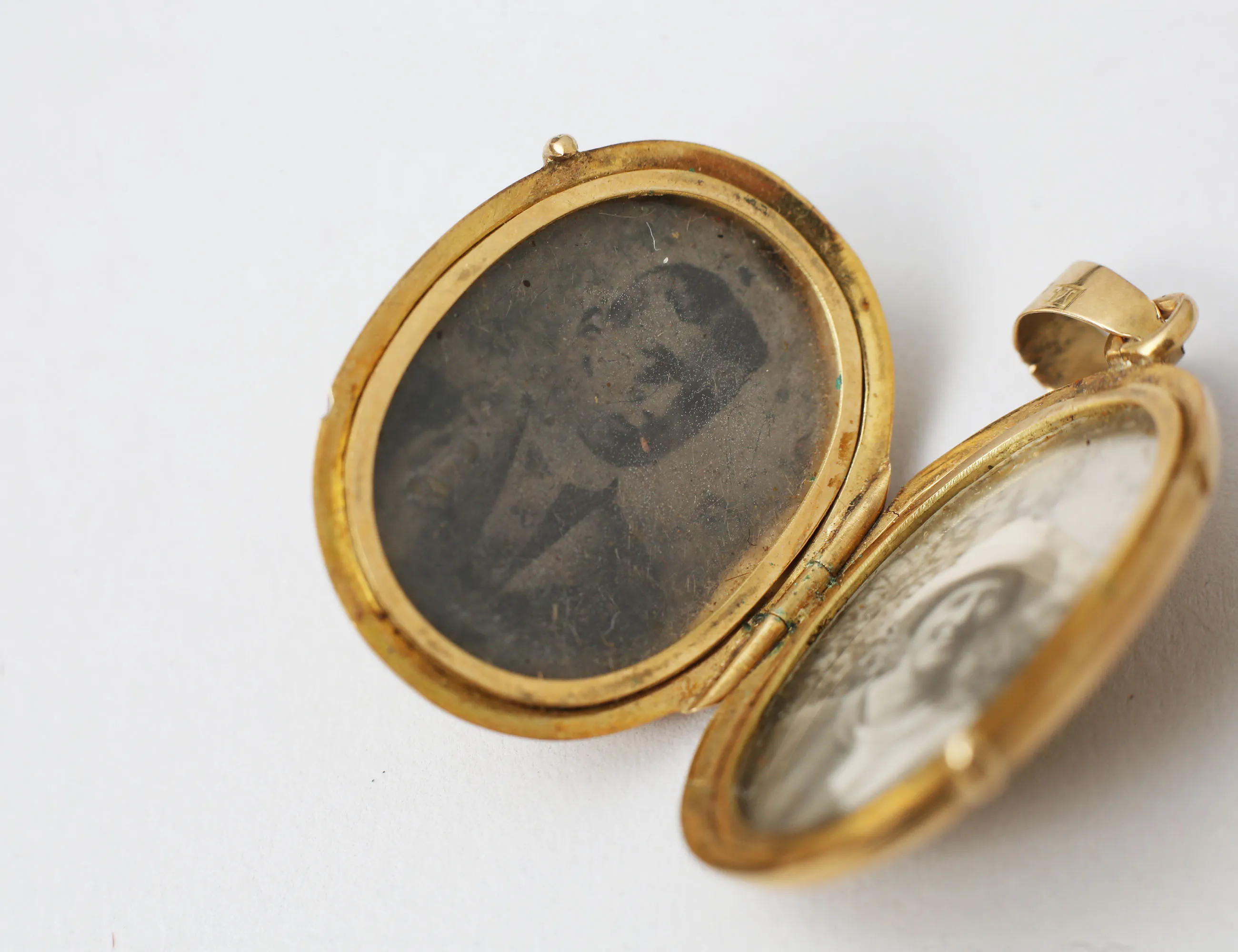 JEP Stockholm 1877, heltäckande graverad dekor av bl a ankare, hjärta och kors, invändigt fotografier, guldvikt 4,43 gram, höjd 3,7 cm