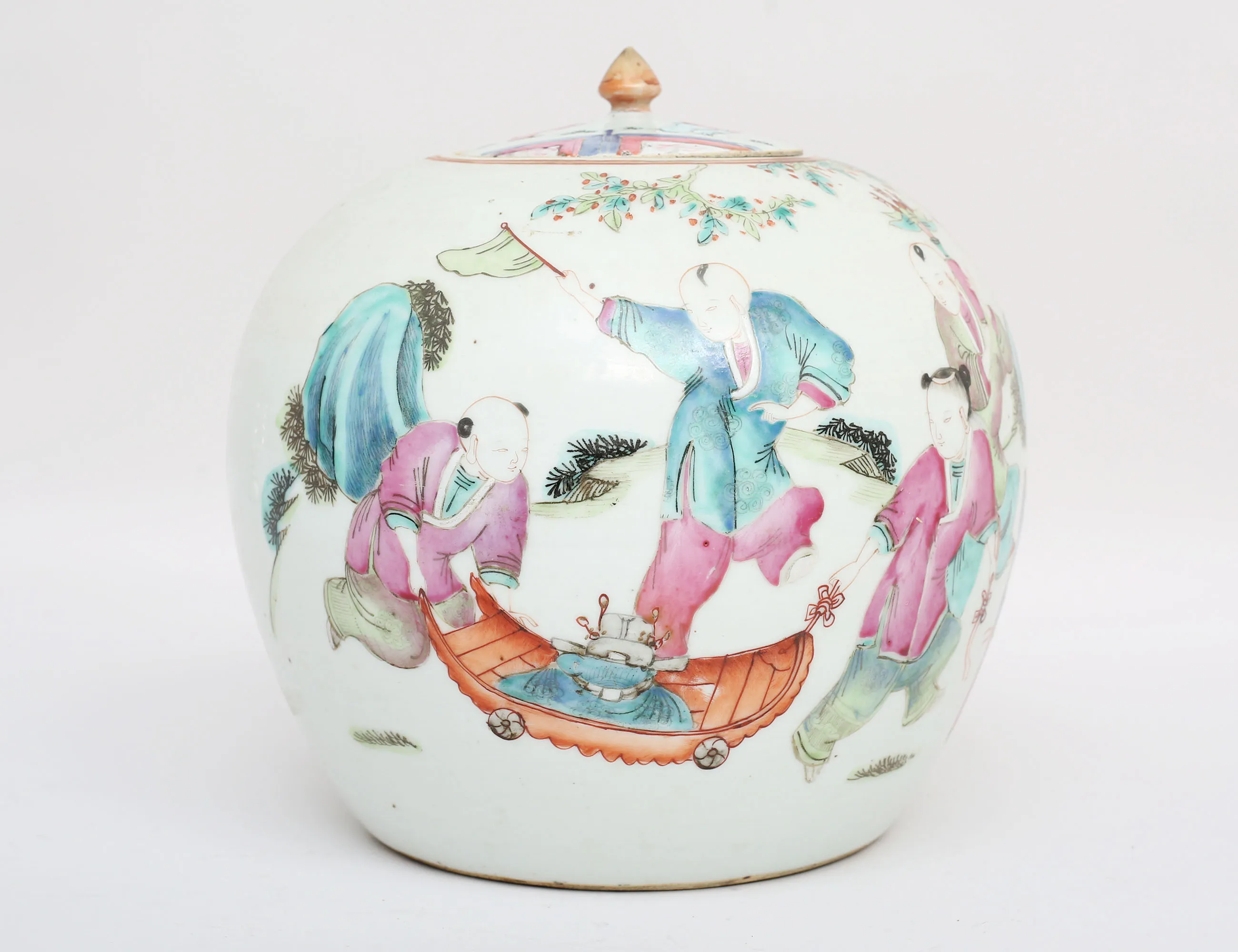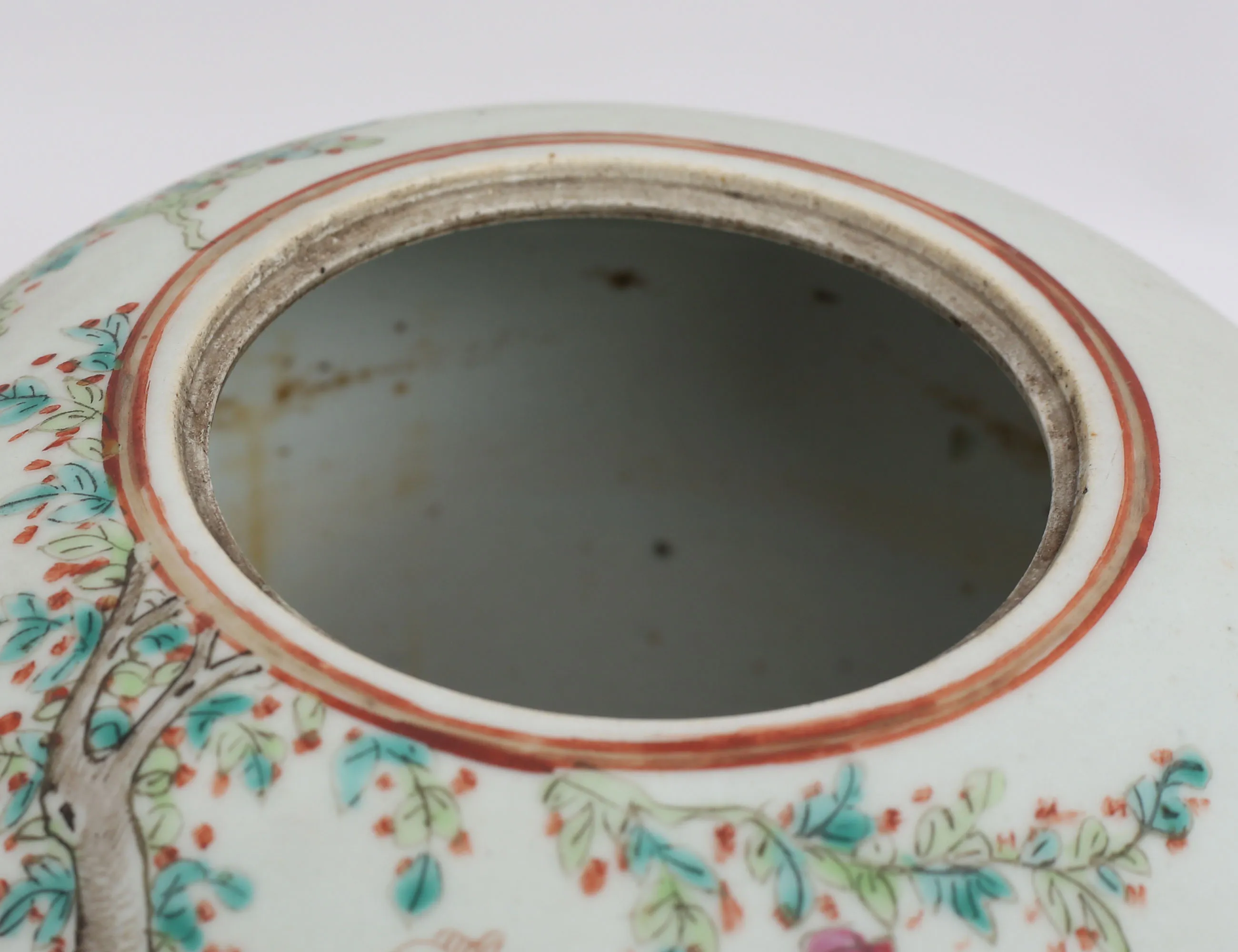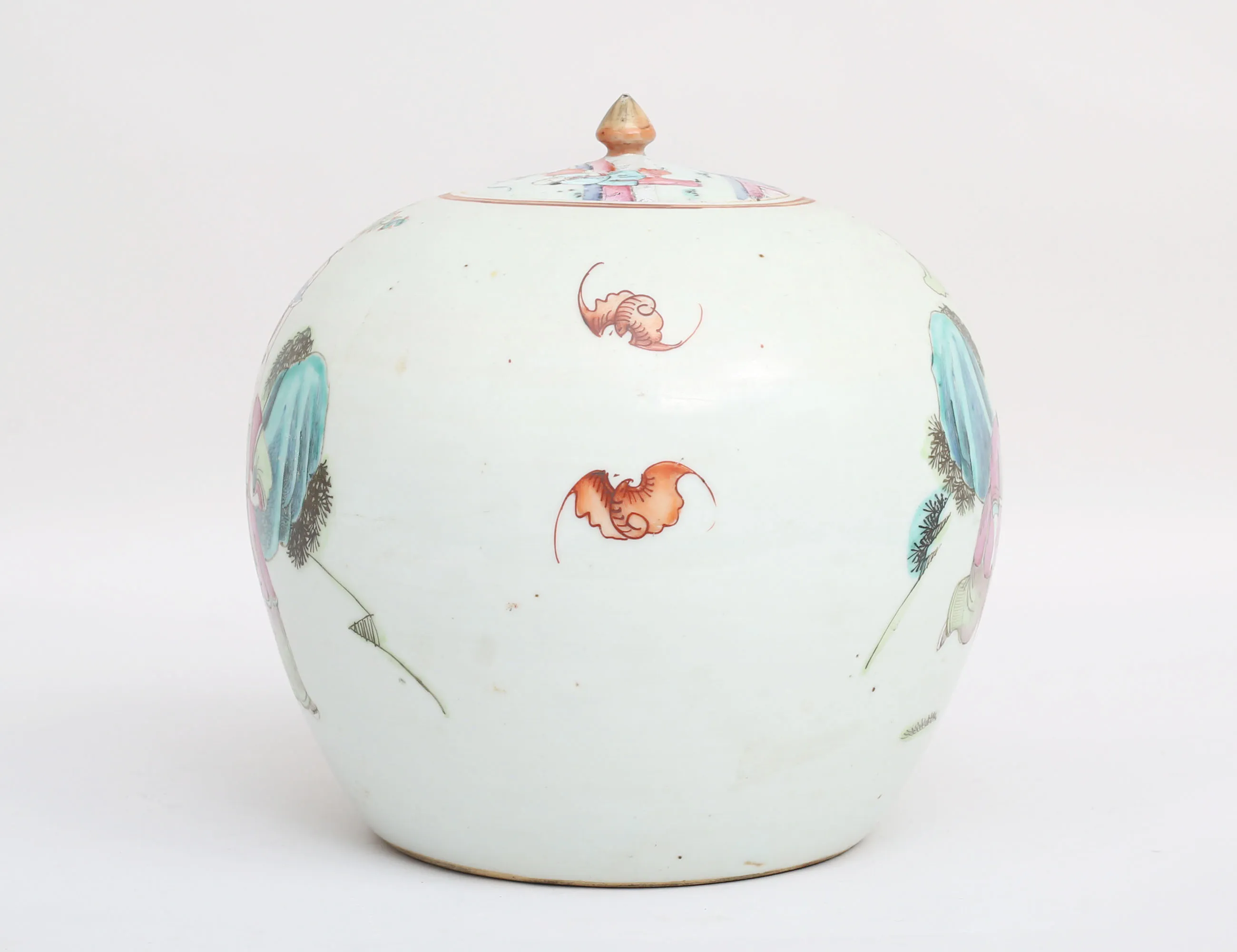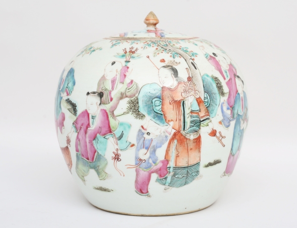 sen Qing c.1900, polykrom emaljdekor av figurscener, höjd 22 (lockknopp med micronagg, invändiga stjärnsprickor i glasyren)