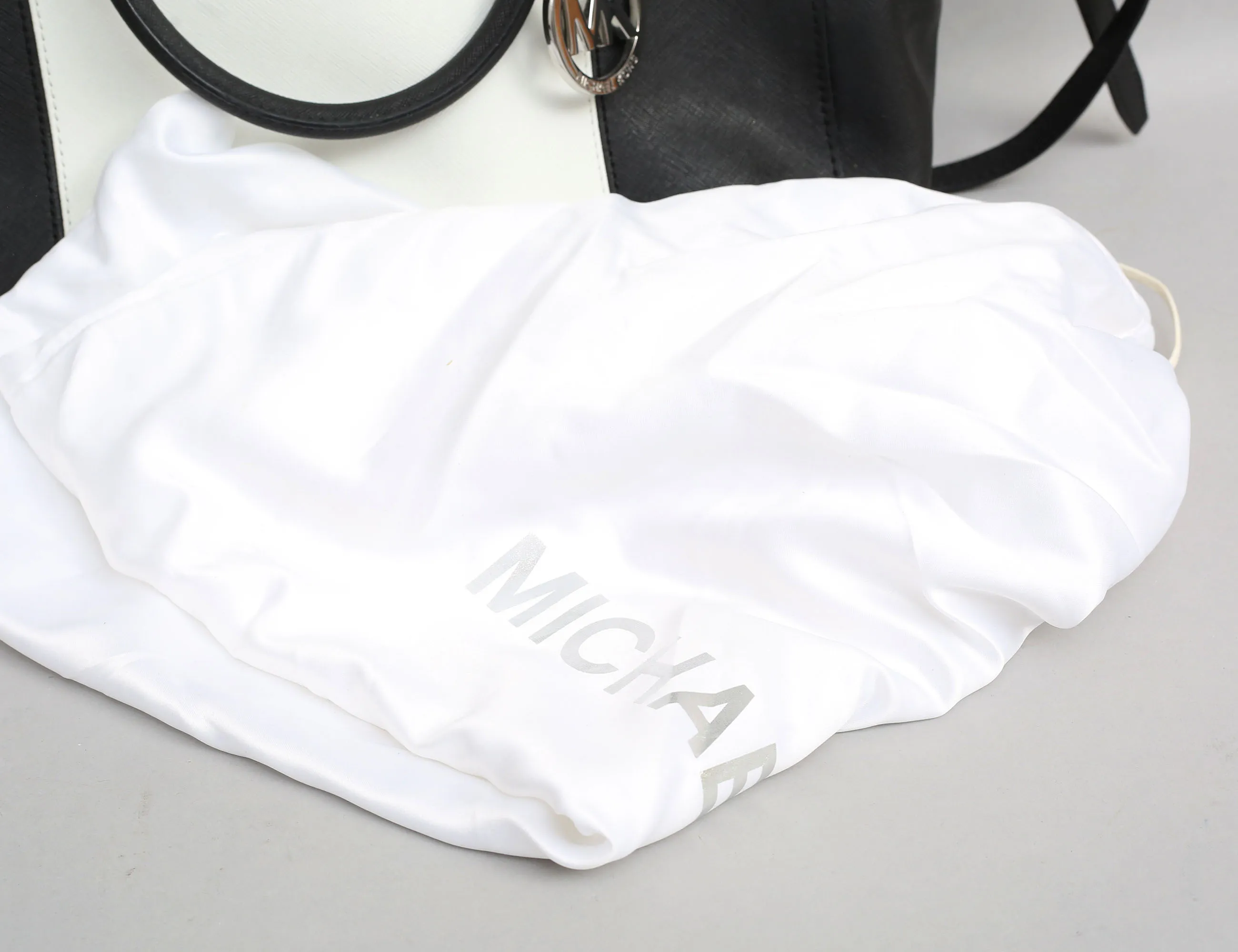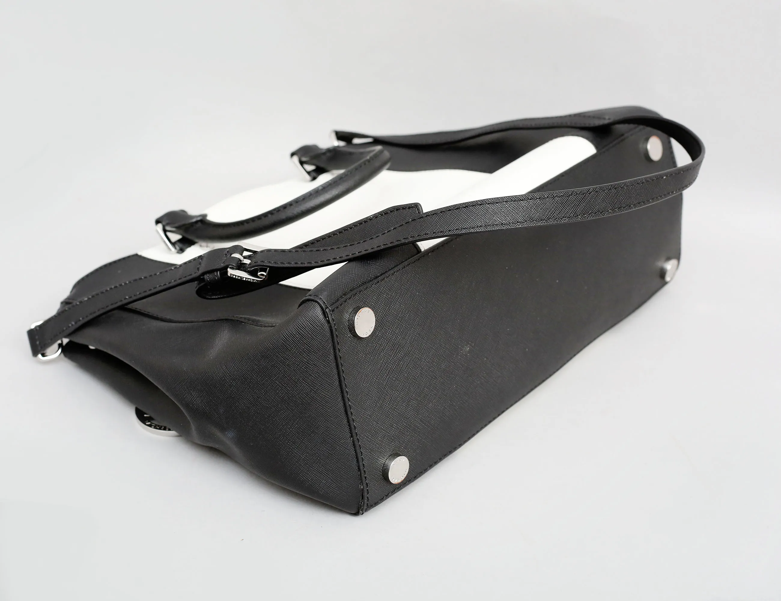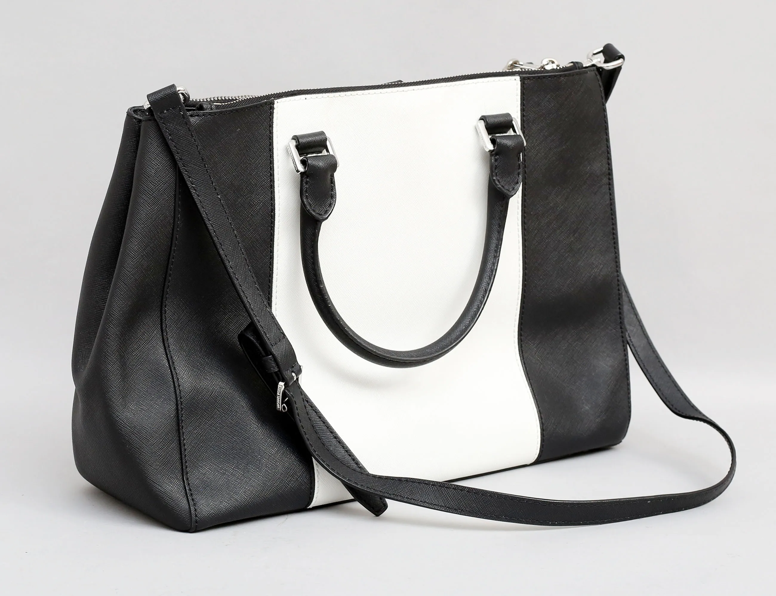 handväska "Jet Set", svart och vitt saffiano läder, huvudfack med fem innerfack varav två med dragkedja, två stora sidofack med dragkedja, dubbla bärhandtag samt justerbar axelrem, dustbag, höjd 26, bredd 34 (obetydligt bruksslitage)