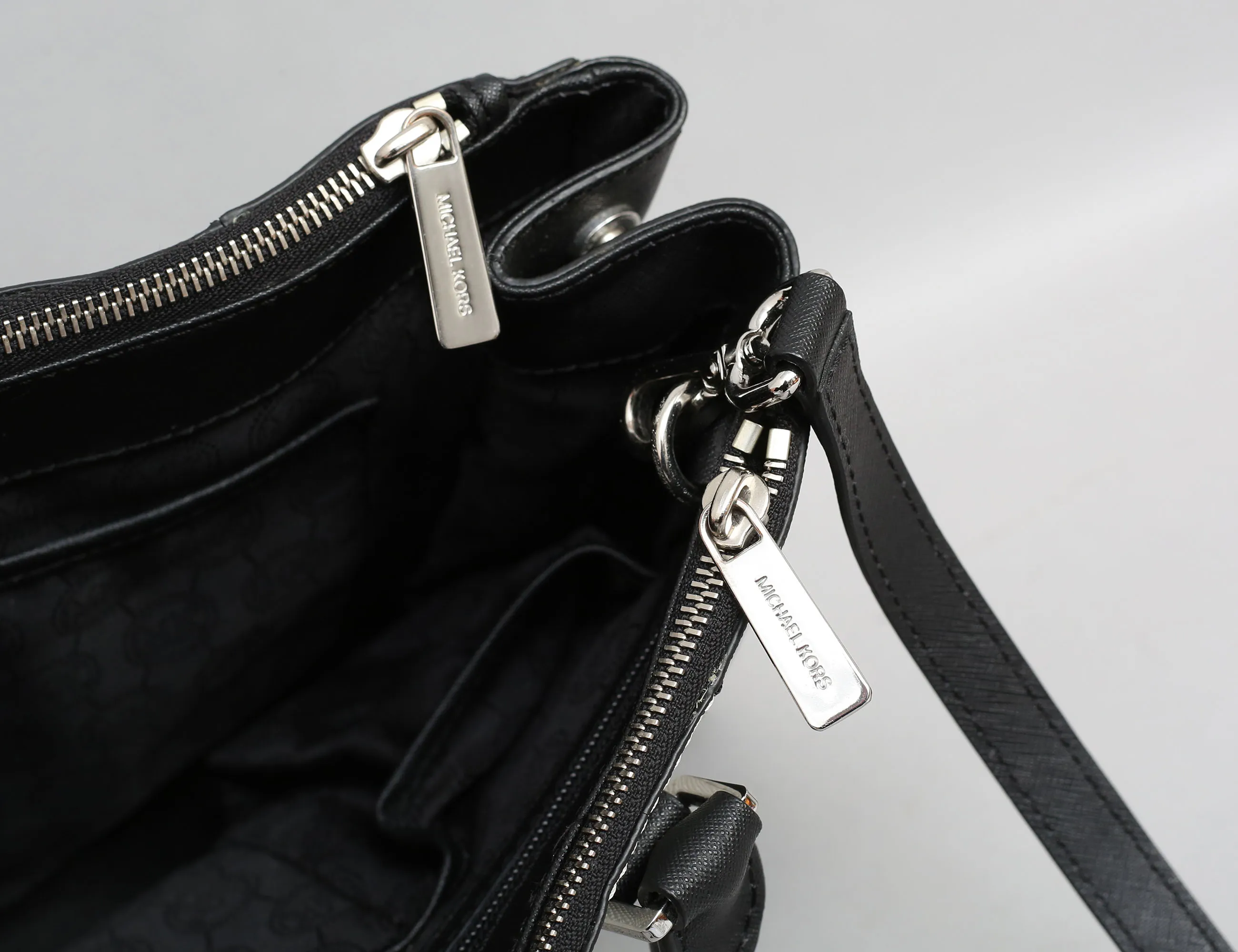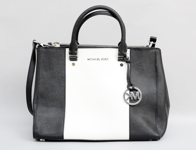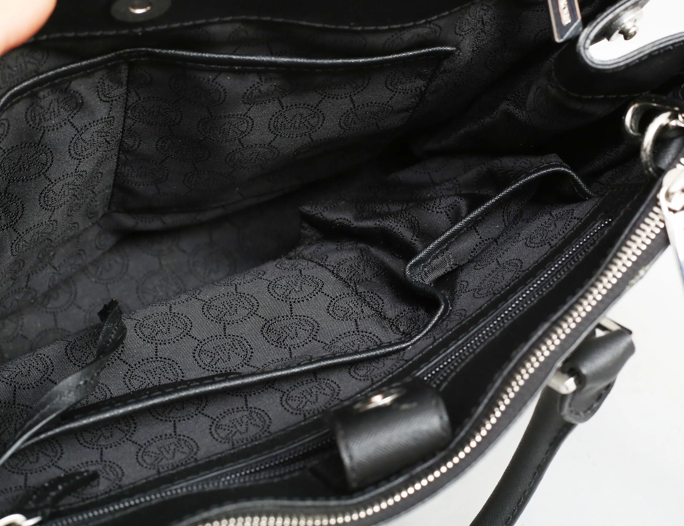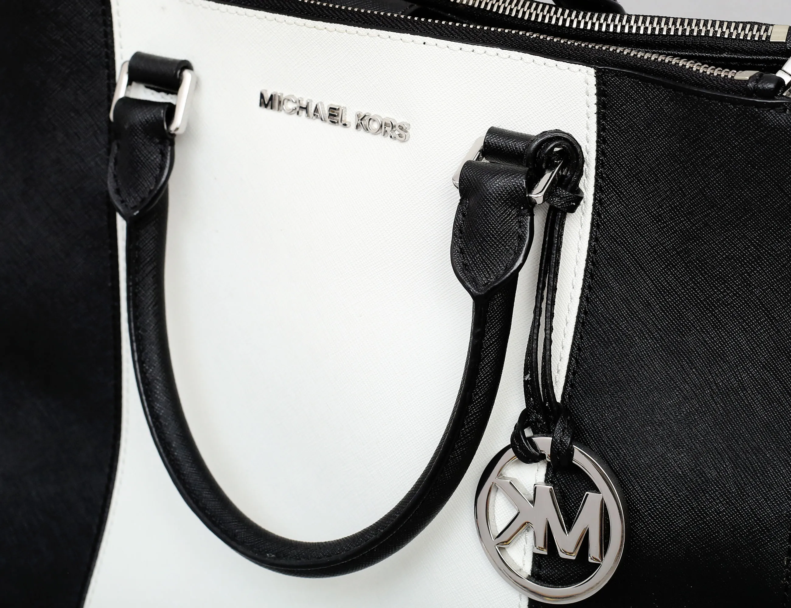 handväska "Jet Set", svart och vitt saffiano läder, huvudfack med fem innerfack varav två med dragkedja, två stora sidofack med dragkedja, dubbla bärhandtag samt justerbar axelrem, dustbag, höjd 26, bredd 34 (obetydligt bruksslitage)