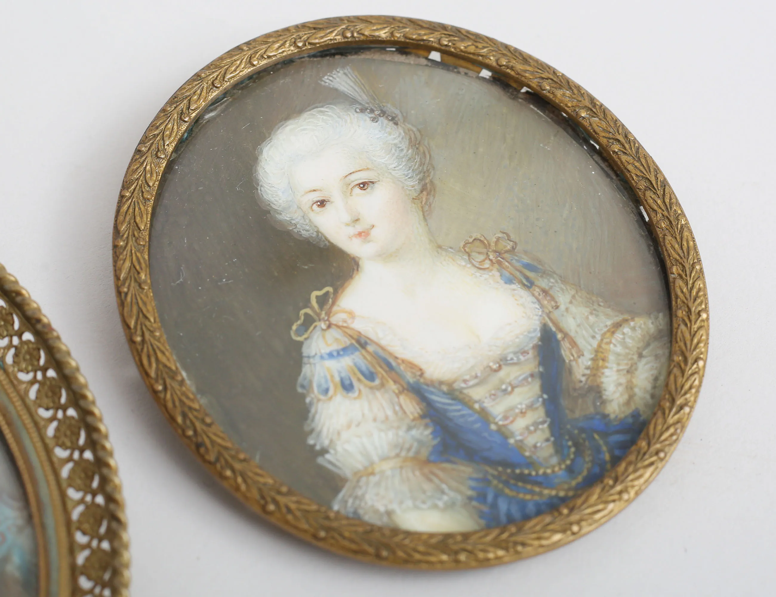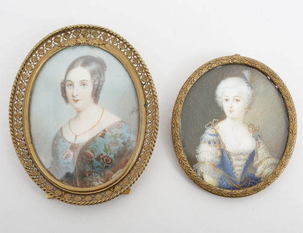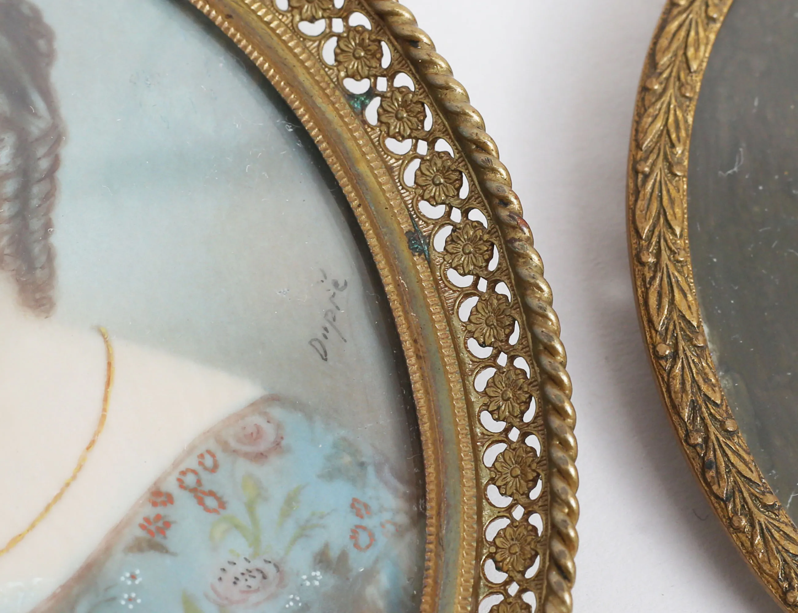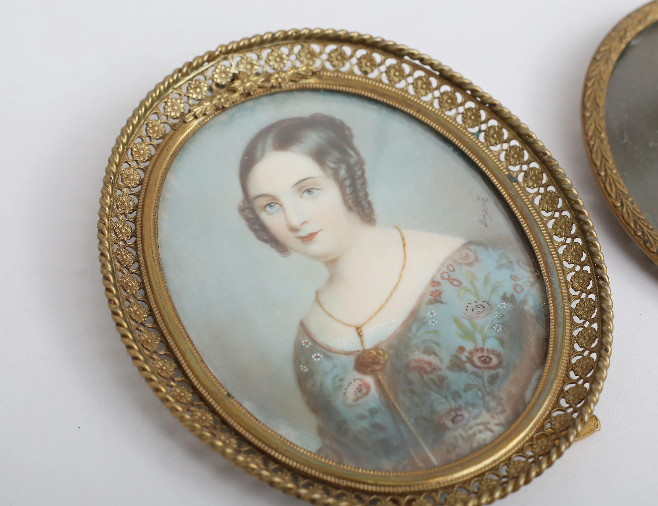 kvinnoporträtt, samtida ramar, ornamenterad mässing, en bär signatur, 8x5 respektive 10x8,5 (en med smärre slitage runt nedre ramkant)