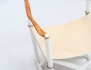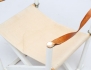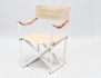 stol så kallad regissör-/safaristol modell MK16, stomme i trä, mässingsbeslag, sits och rygg i canvas, armlän i naturfärgat läder, plakettmärkt MOGENS KOCH INTERNA DANMARK, sitthöjd 40, höjd 87 (senare bemålad, canvas med fläckar)