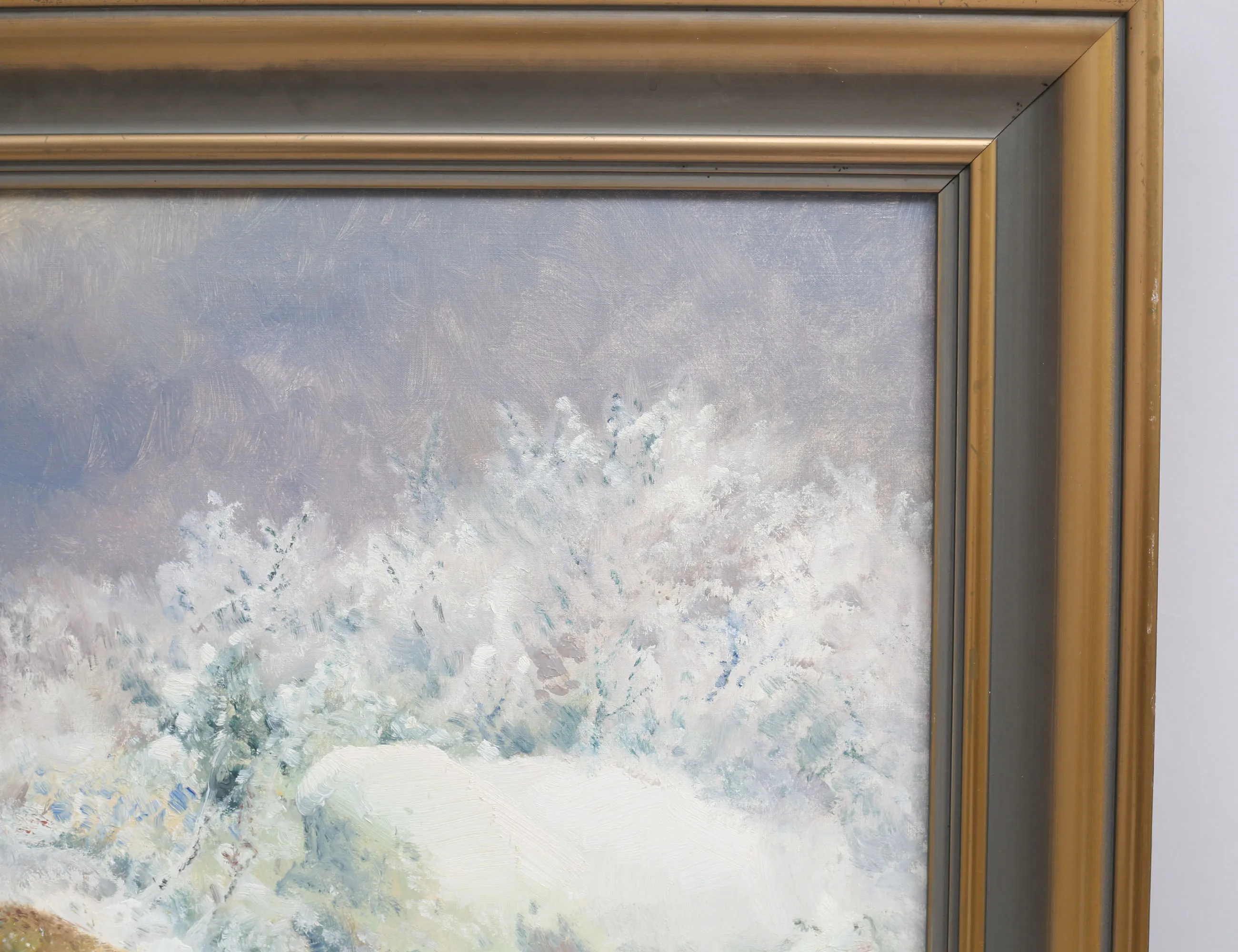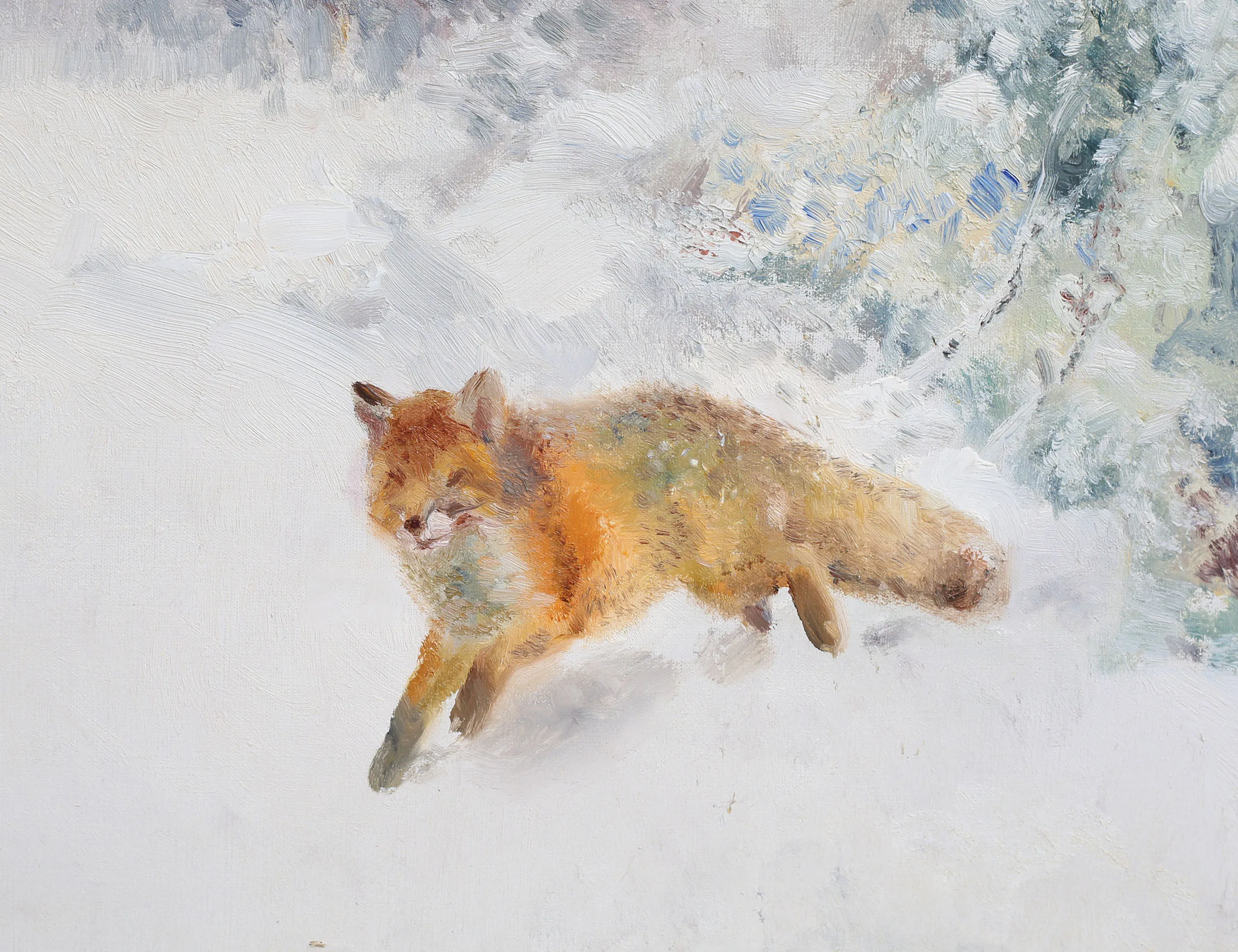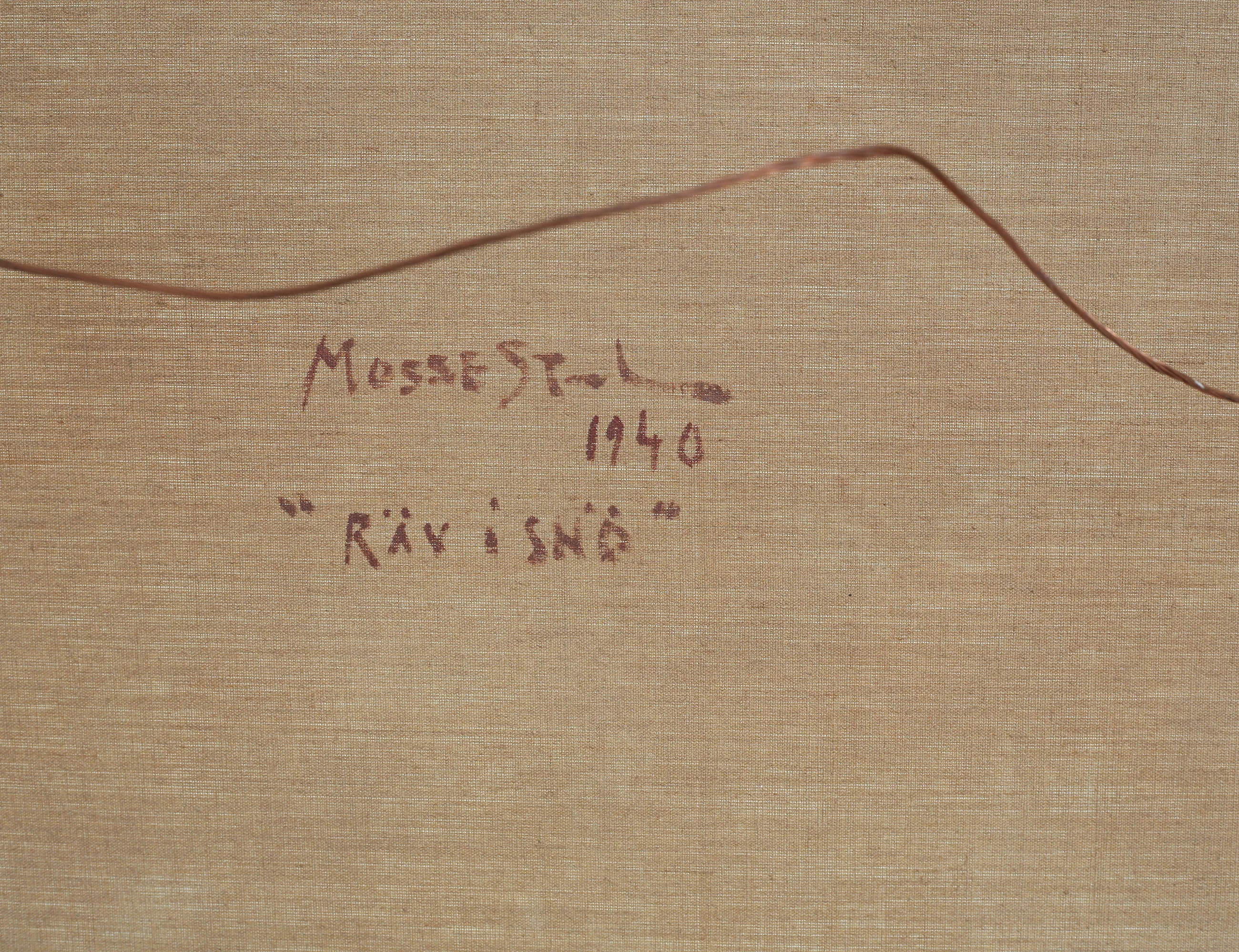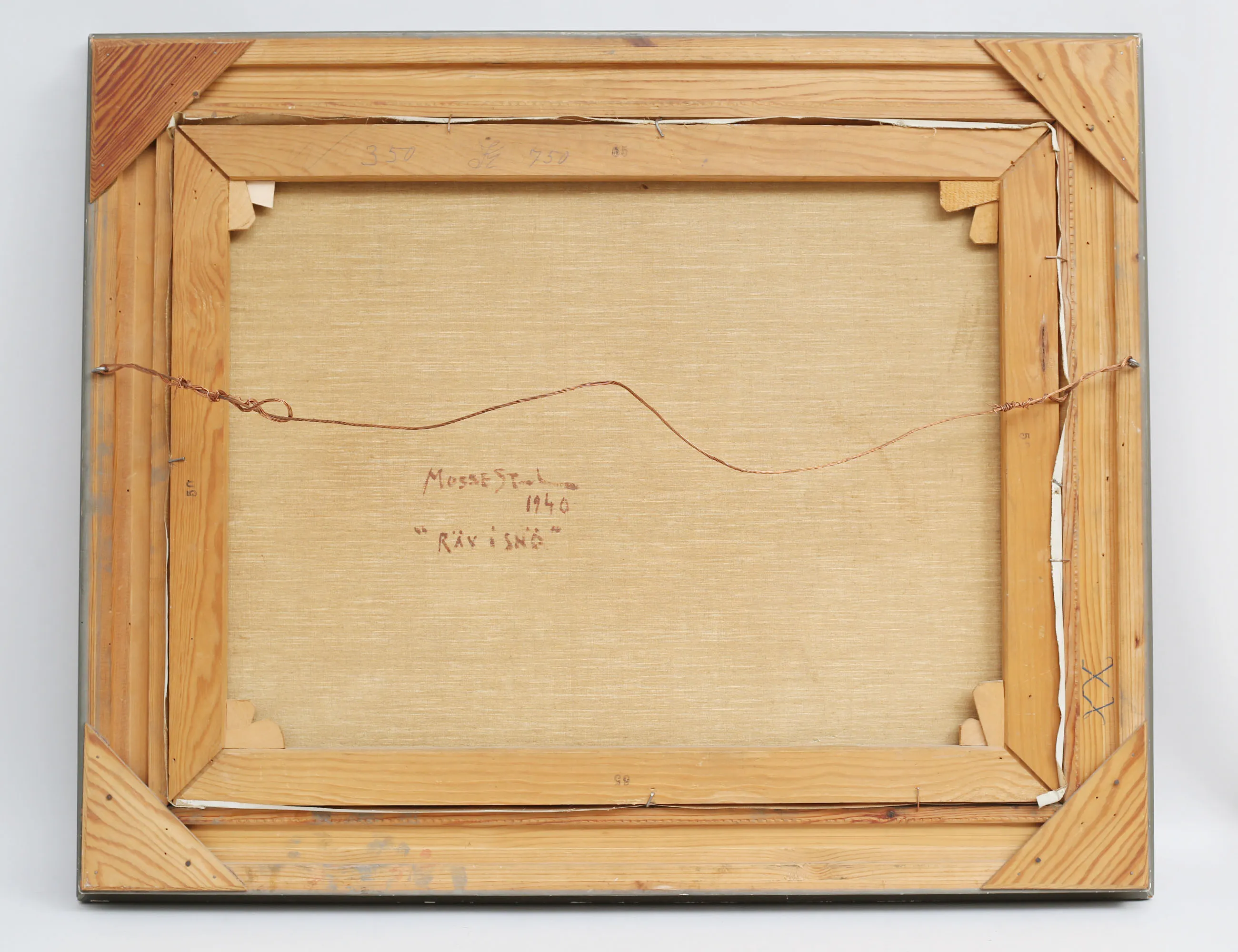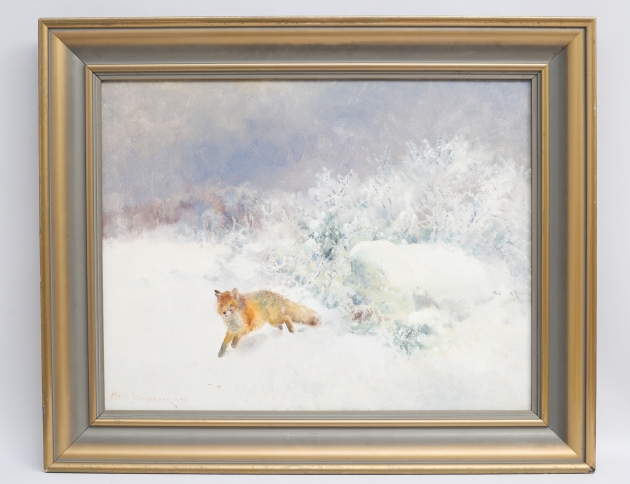 oljemålning på duk, "Räv i snö", signerad -40 även atergo signerad 1940, 51x66, rammått 64x82 (smärre reva vid nedre kant)
