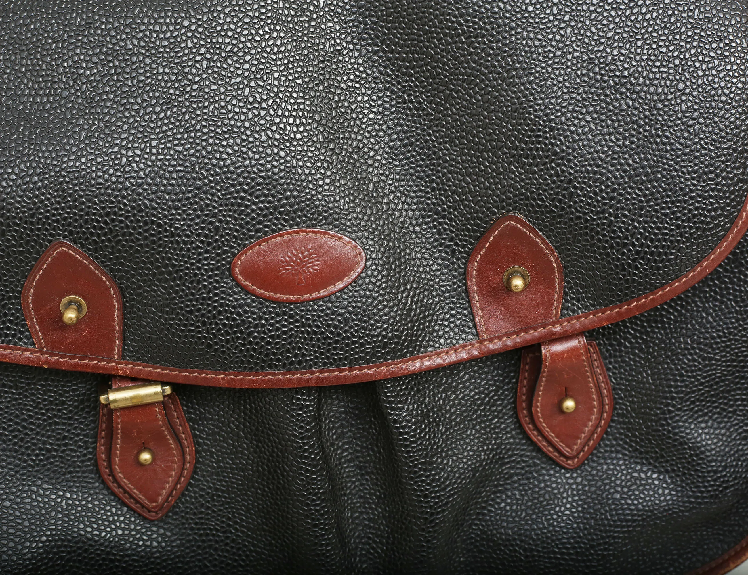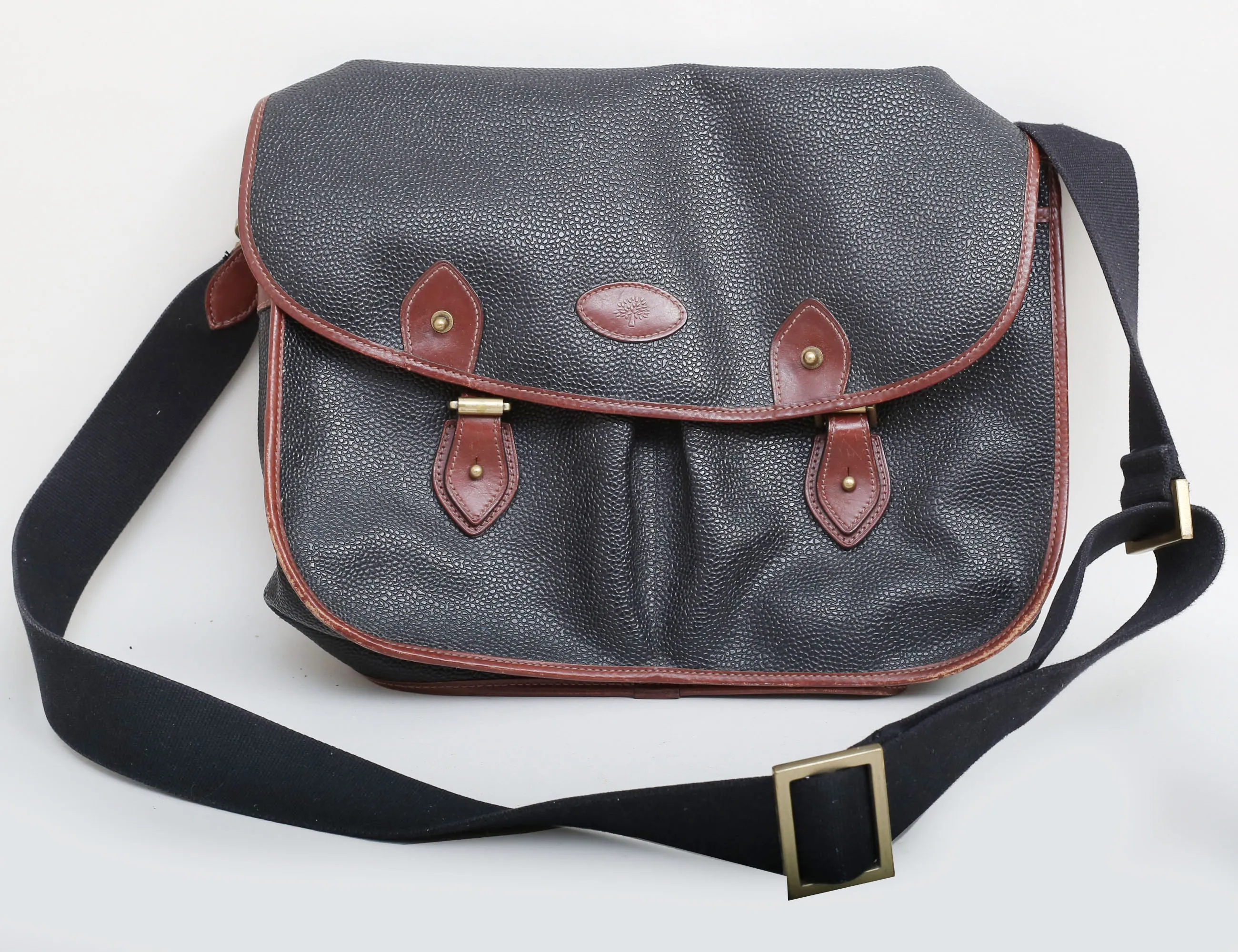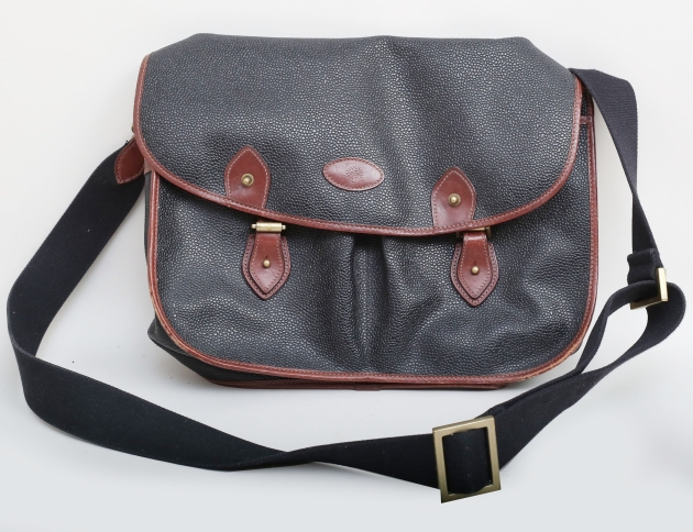 scotchgrå med detaljer i brunt läder, justerbar axelrem i textil, utanpå två fickor med lock, invändigt ett fack samt ett mindre med dragkedja, märkt med serienummer, inköpt på NK Stockholm, höjd 30, bredd 35 (smärre bruksslitage, nötta kanter)