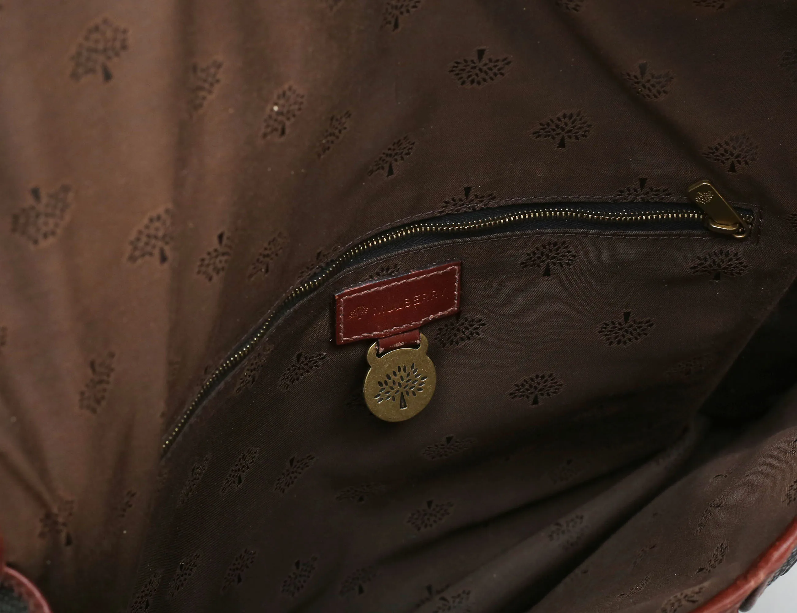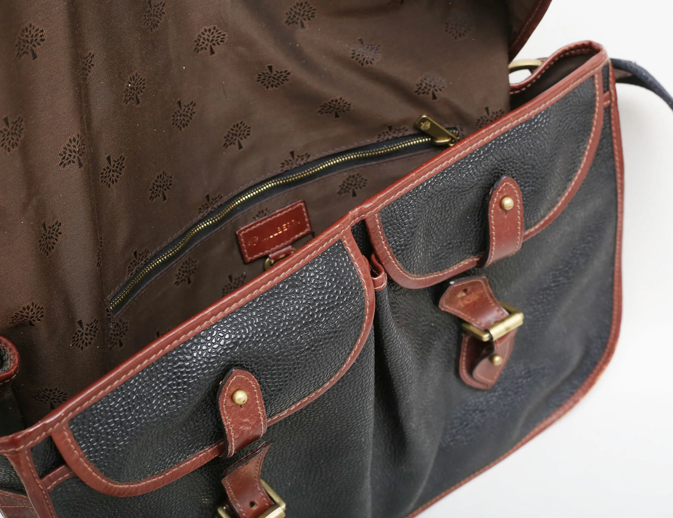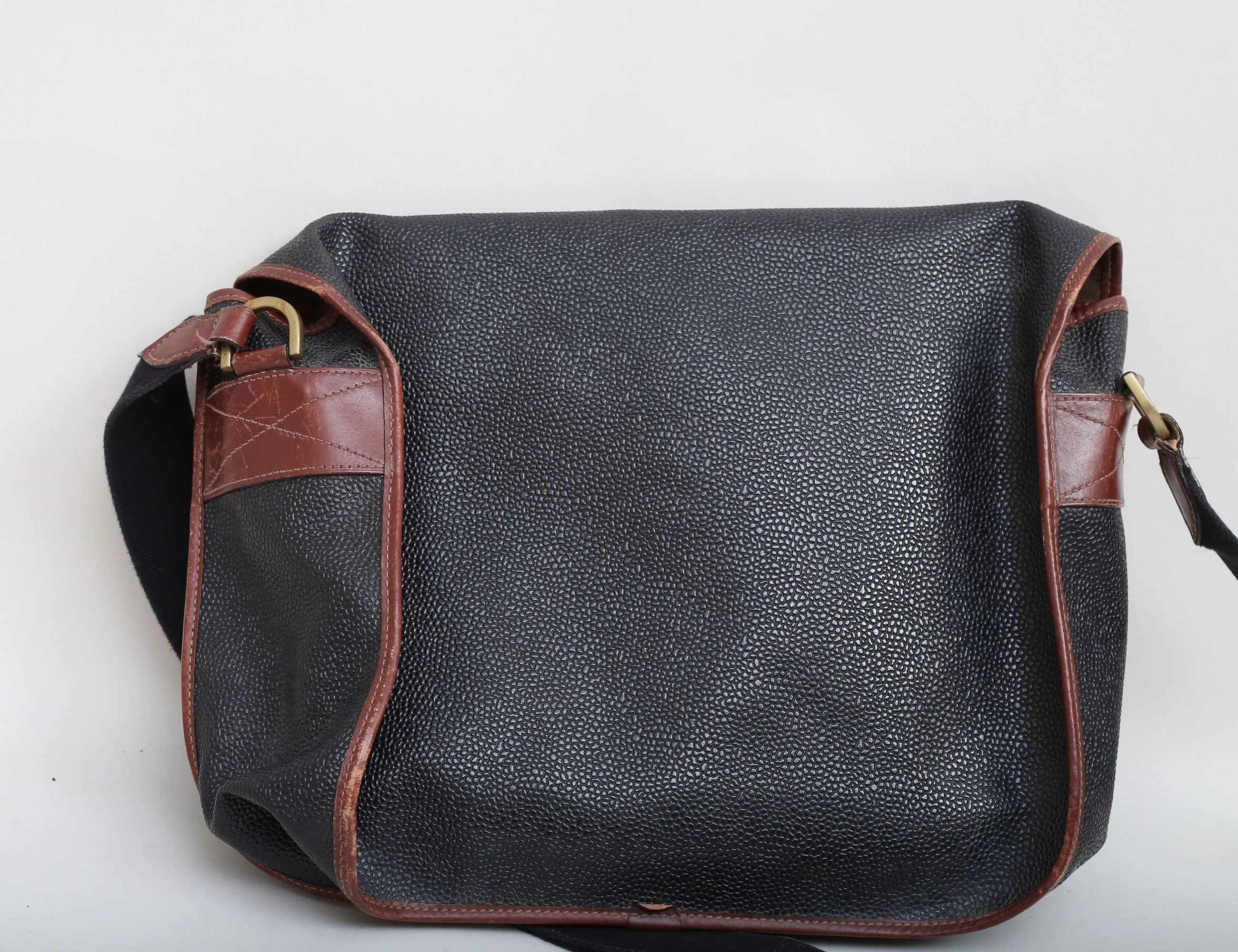 scotchgrå med detaljer i brunt läder, justerbar axelrem i textil, utanpå två fickor med lock, invändigt ett fack samt ett mindre med dragkedja, märkt med serienummer, inköpt på NK Stockholm, höjd 30, bredd 35 (smärre bruksslitage, nötta kanter)