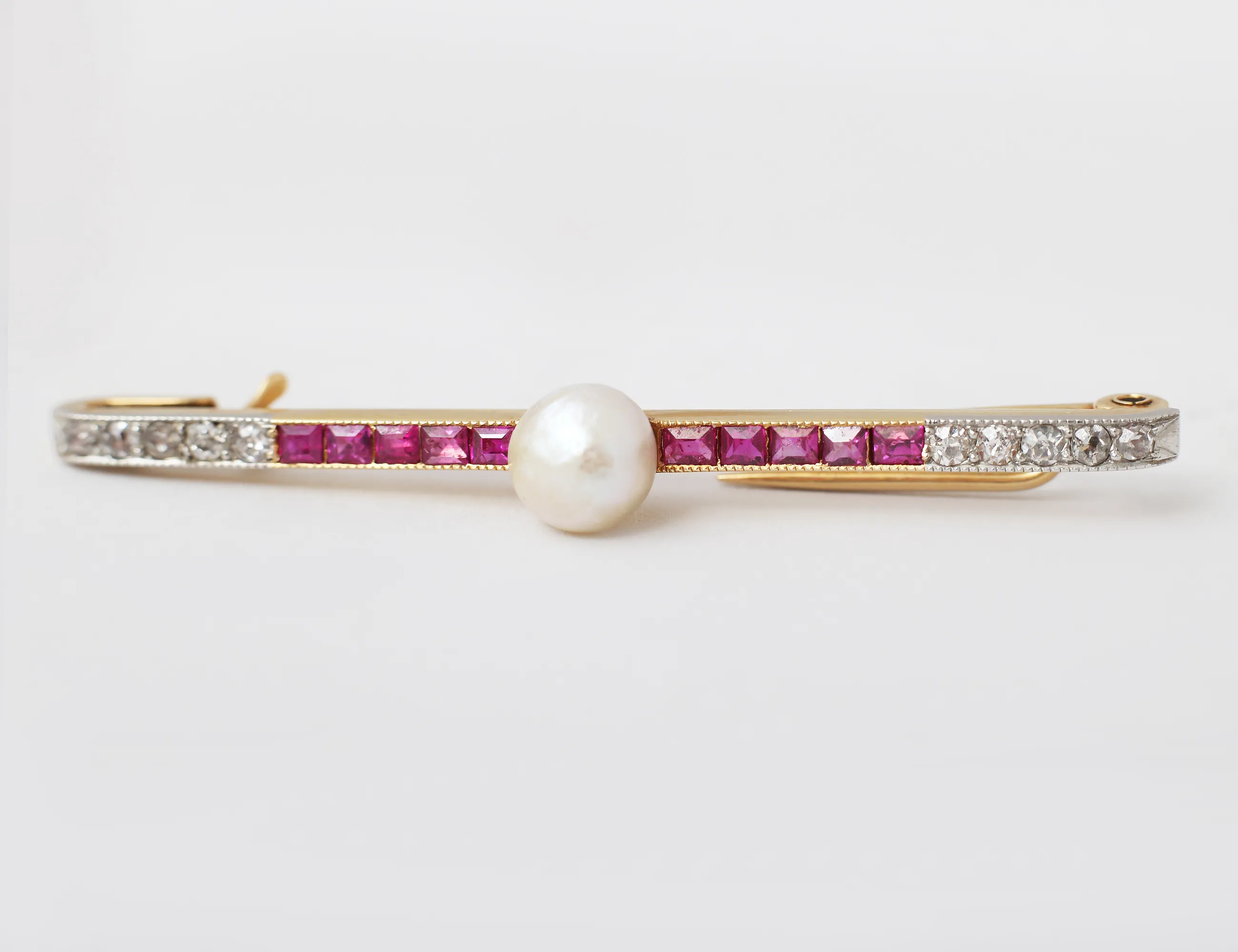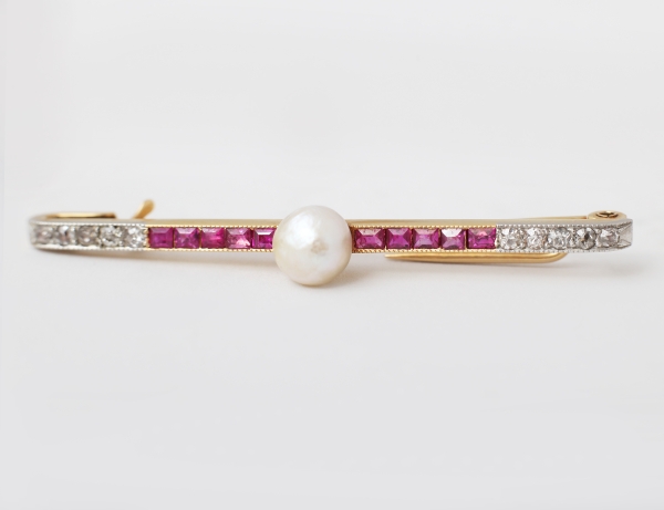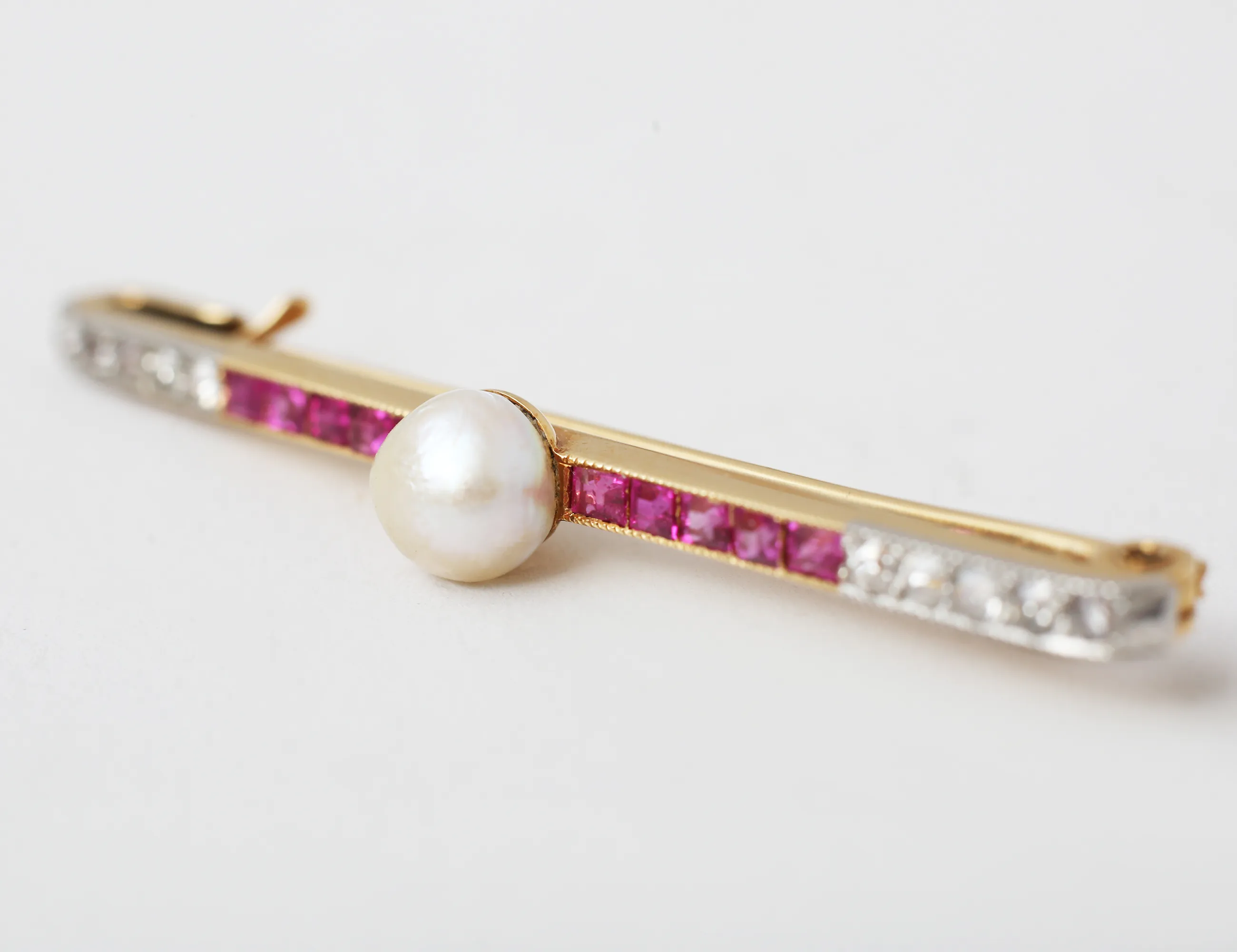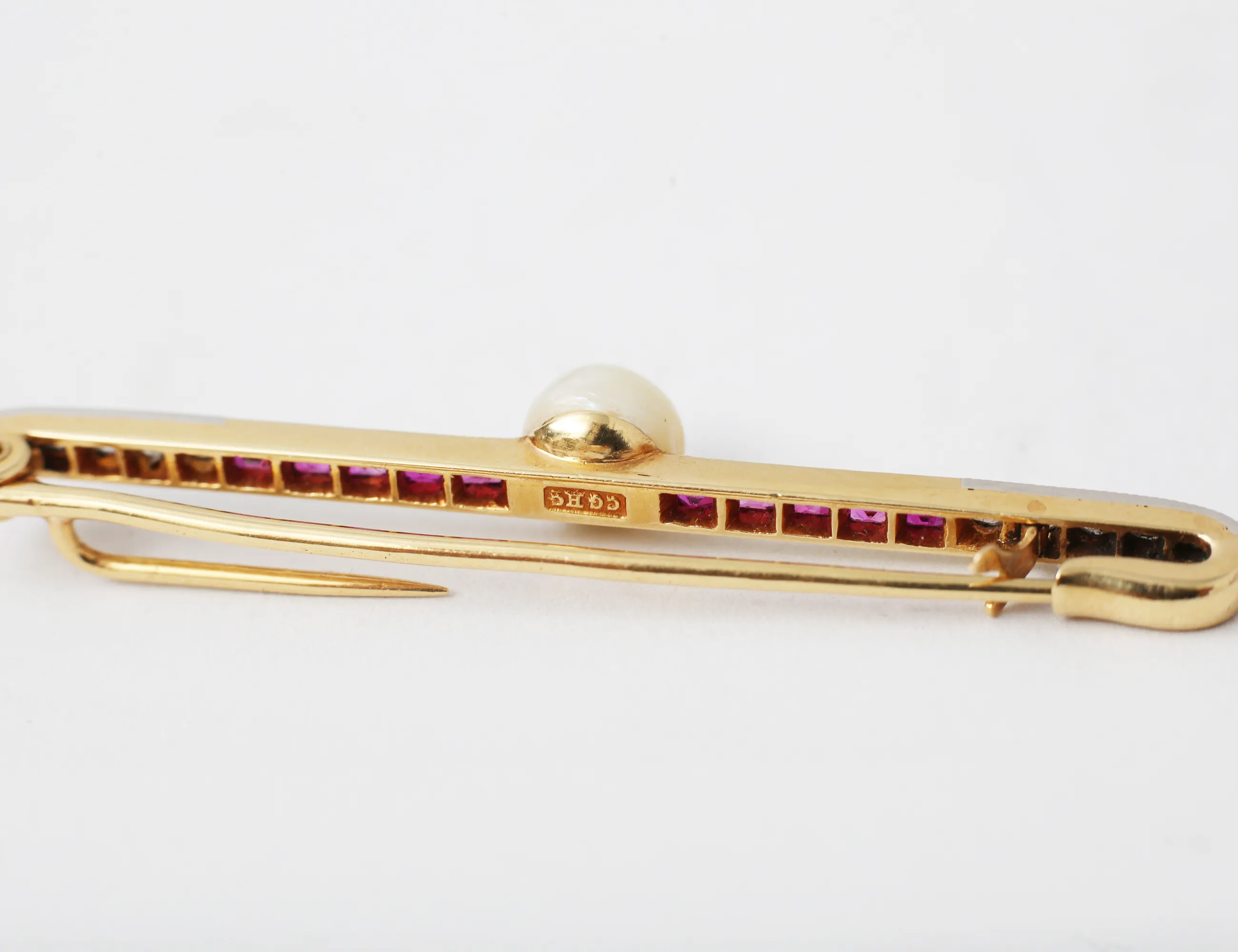 CG Hallberg 1900-talets första hälft, gammalslipade diamanter (10), totalt ca. 0,20ct., trappstegsslipade rubiner (10) samt odlad pärla 7mm., vikt 4,79 gram, längd 5,3