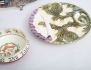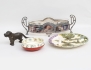i form av hund, patinerad metall, längd 22, jardinjär tidigt 1900-tal, nysilver och glas, CG Hallberg, längd 39x15, sparrisfat c.1900, majolika, skål Porsgrund Norge, diameter 13
