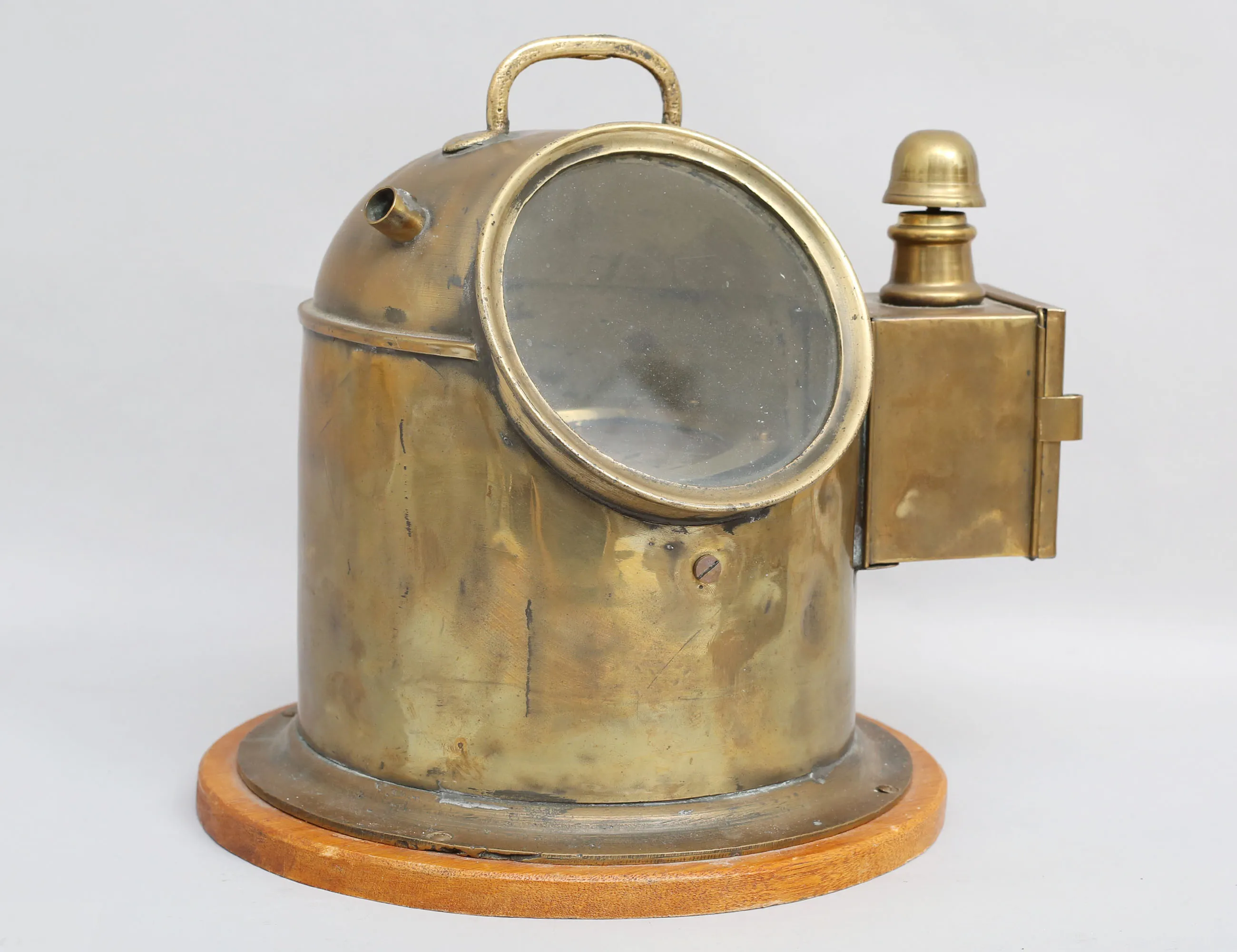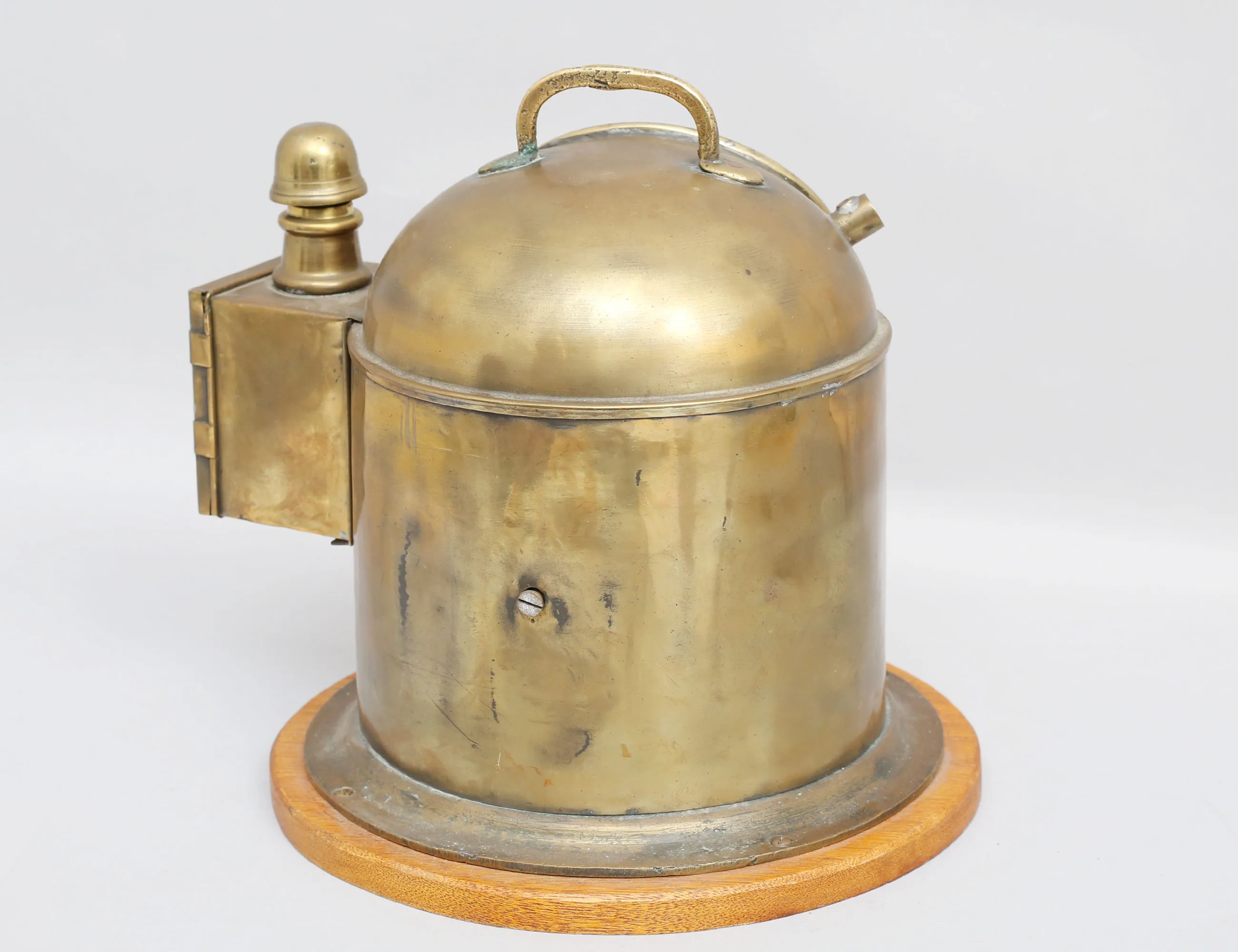 kraftig mässing monterat på träsockel, invändig vattenkompass, belysning på sidan i form av löstagbar fotogenlampa, höjd 28, diameter 28