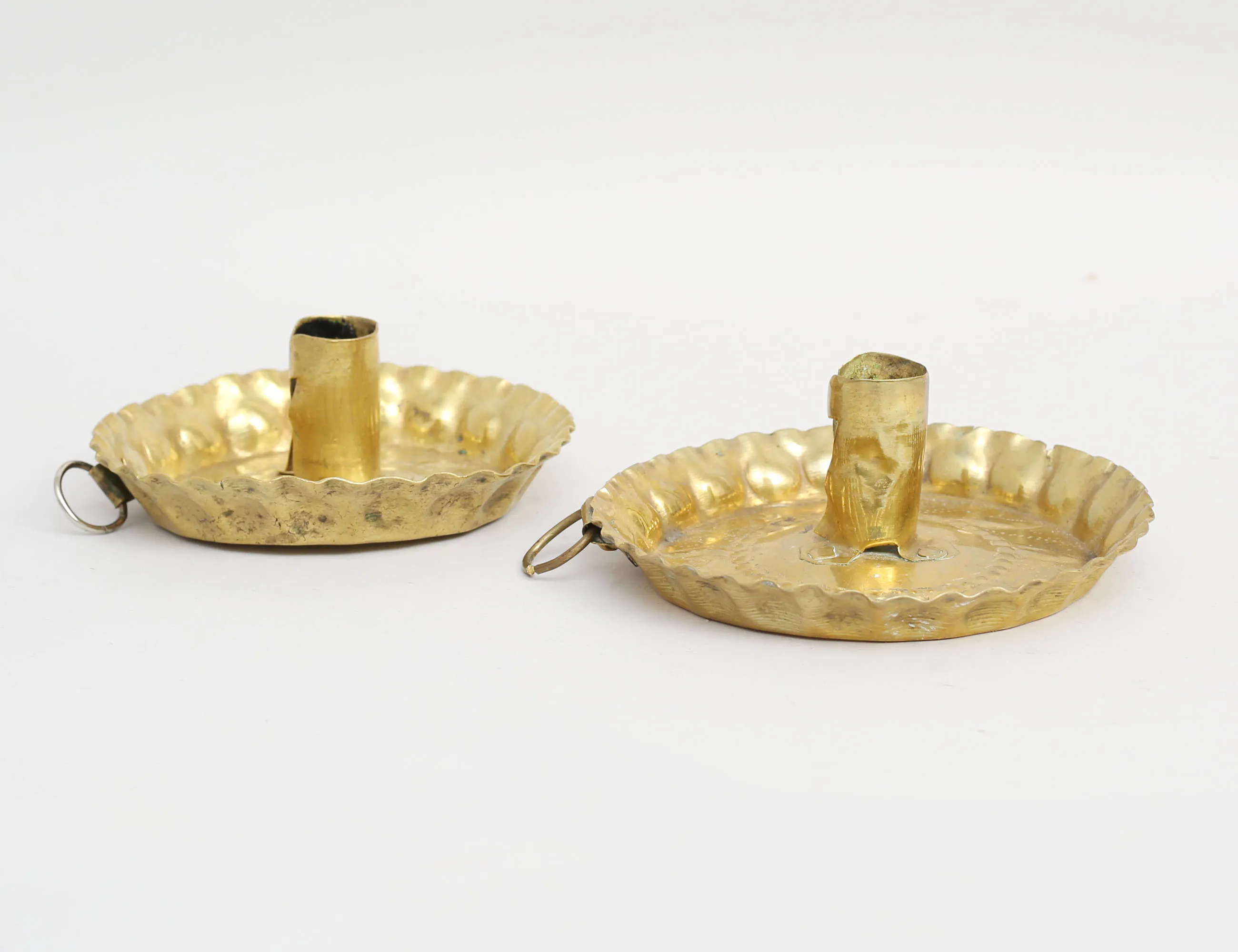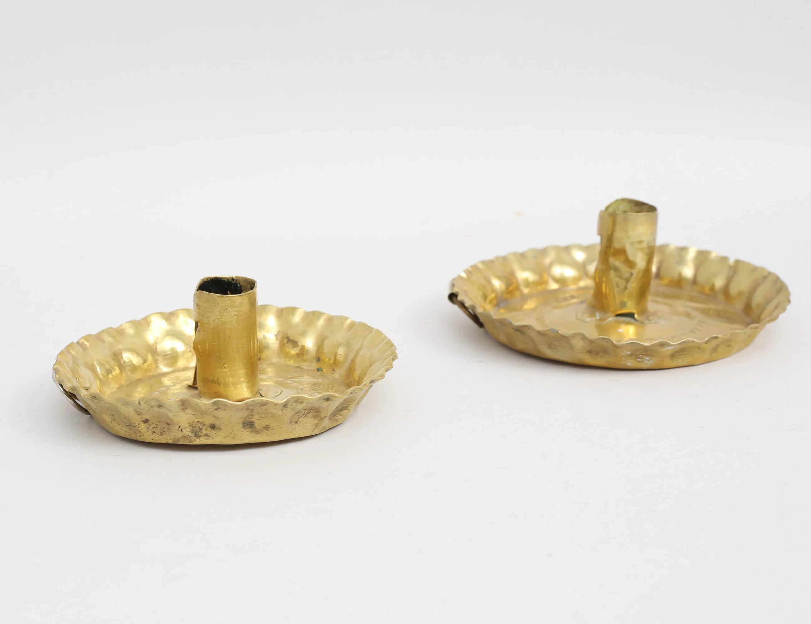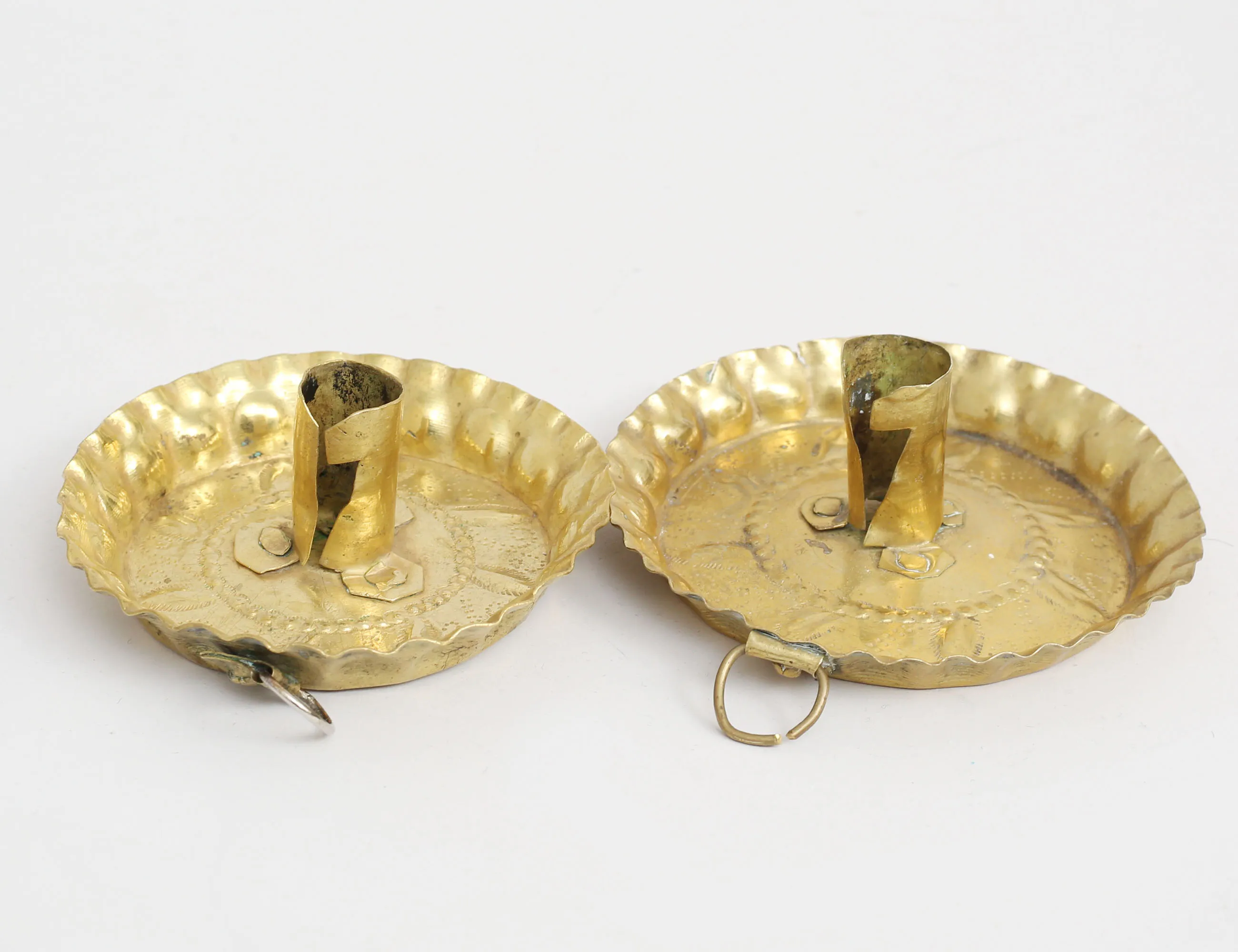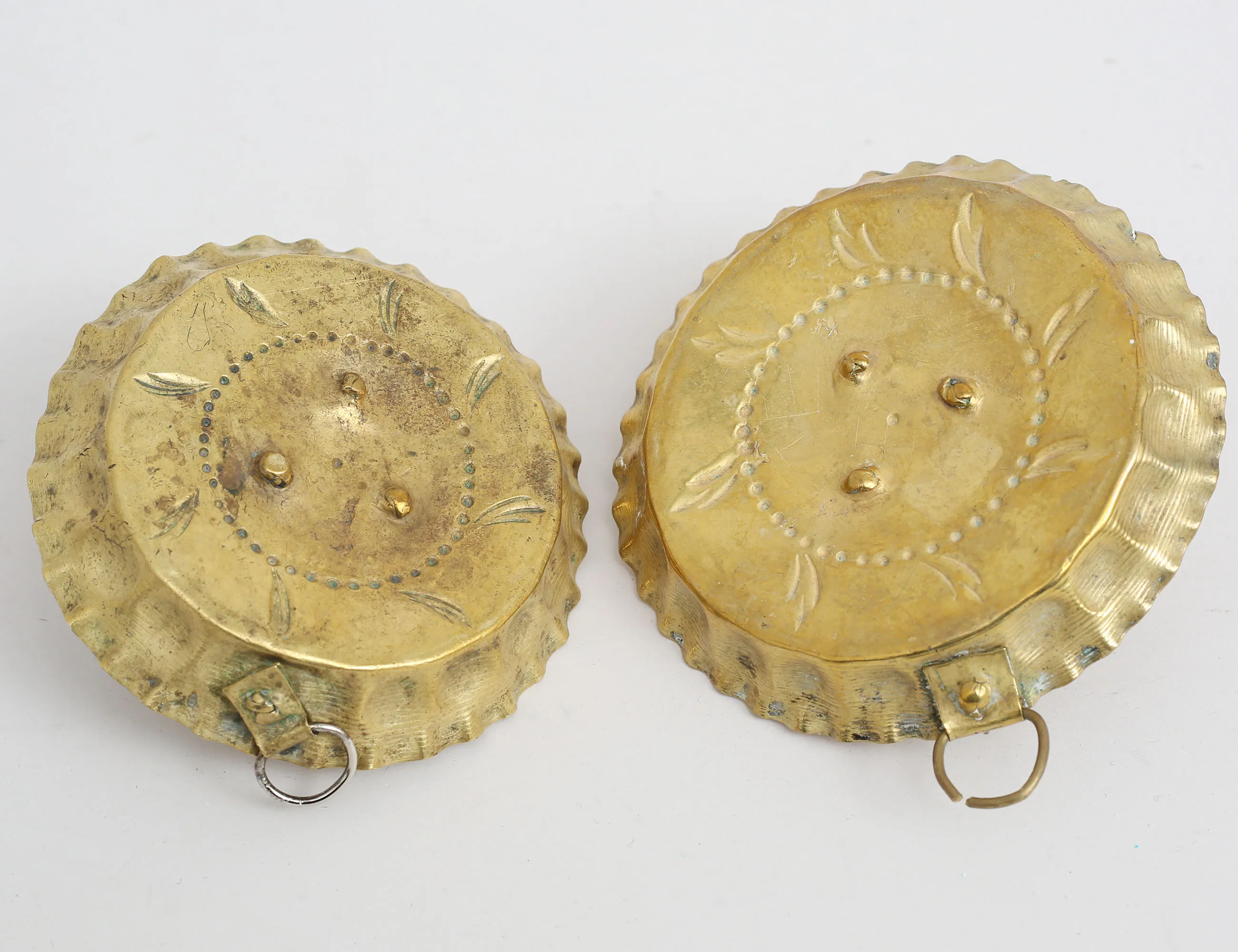 kraftig mässingsplåt, veckad kant, ciselerad och punsad dekor, höjd 5, diameter 11/12 (en med obetydlig kantbristning, öglor för upphängning senare)