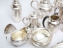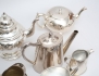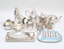 sockerskål och gräddkanna samt 2 brickor tidigt till sent 1800-tal, England, shaker Elkington Plate, höjd 22, kaffeservis 3 delar, 3 tekannor, mjölkkanna, 6 bägare, m.m.