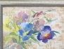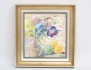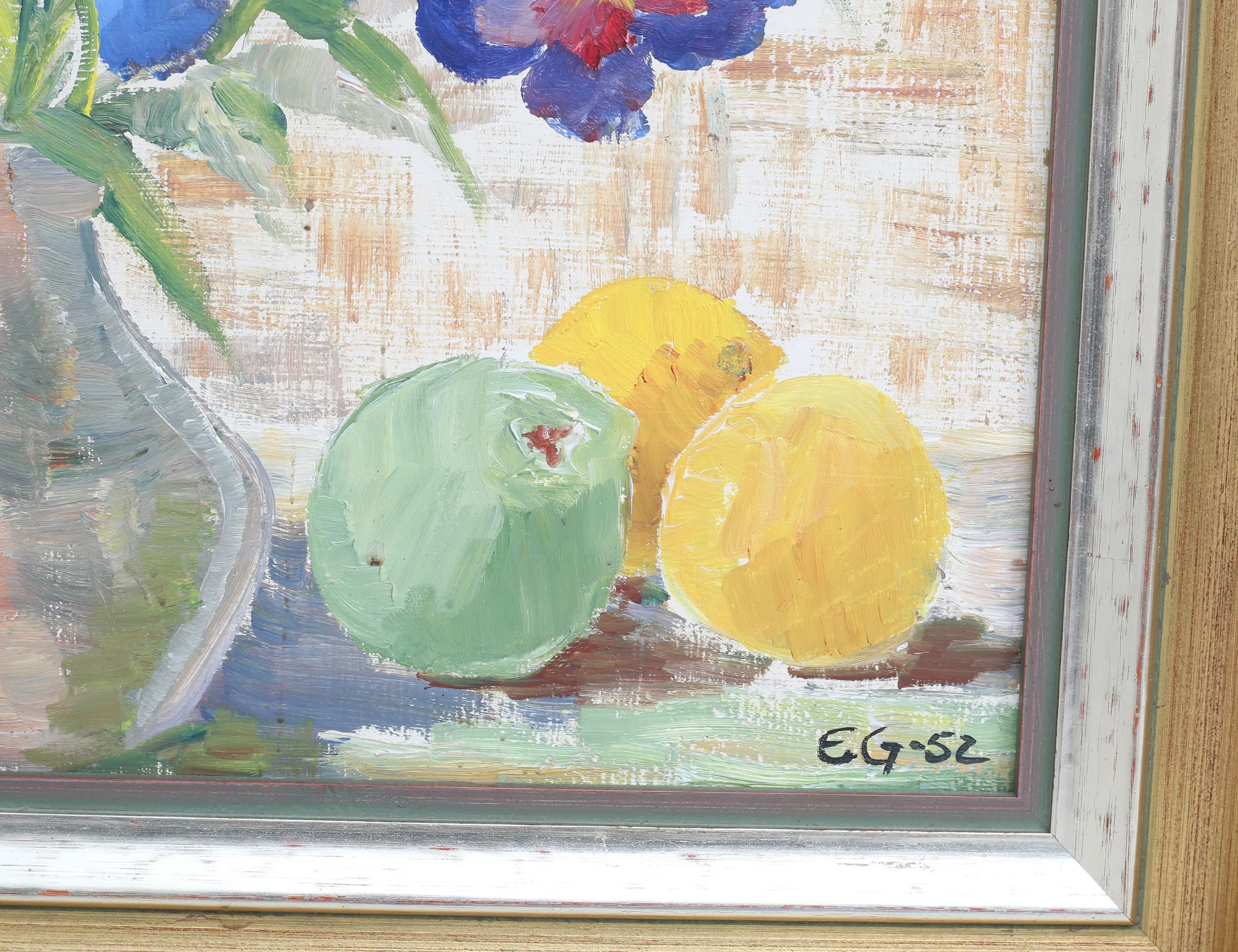 oljemålning på pannå, blomsterstilleben med violer och äpplen, monogramsignerad EG-52, 33x31, rammått 45x43