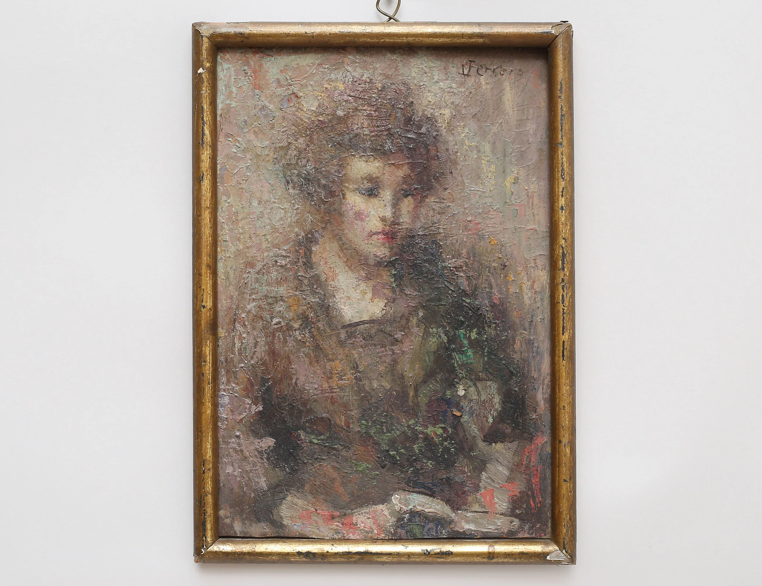 oljemålning på pannå, kvinnoporträtt, signerad, atergo anteckningar, 24x17