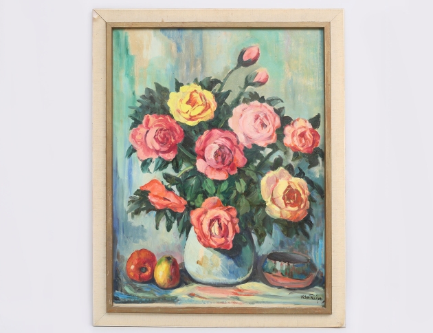 oljemålning på duk, blomsterstilleben med rosor och äpplen, signerad Van Rijn, 80x60,rammått 90x70