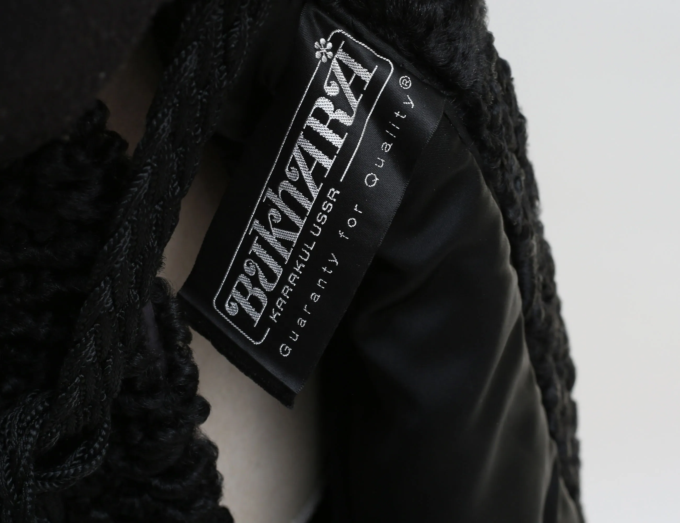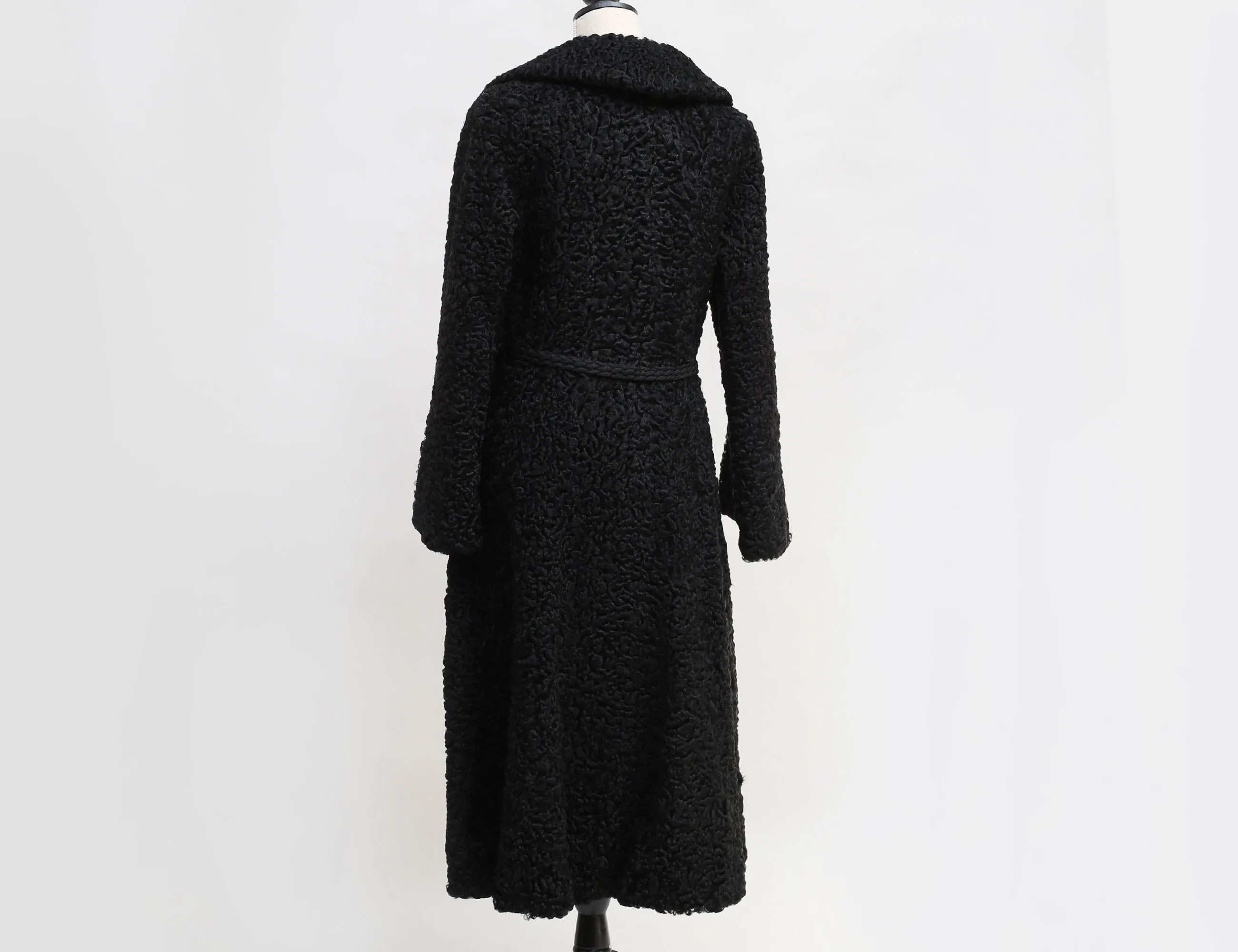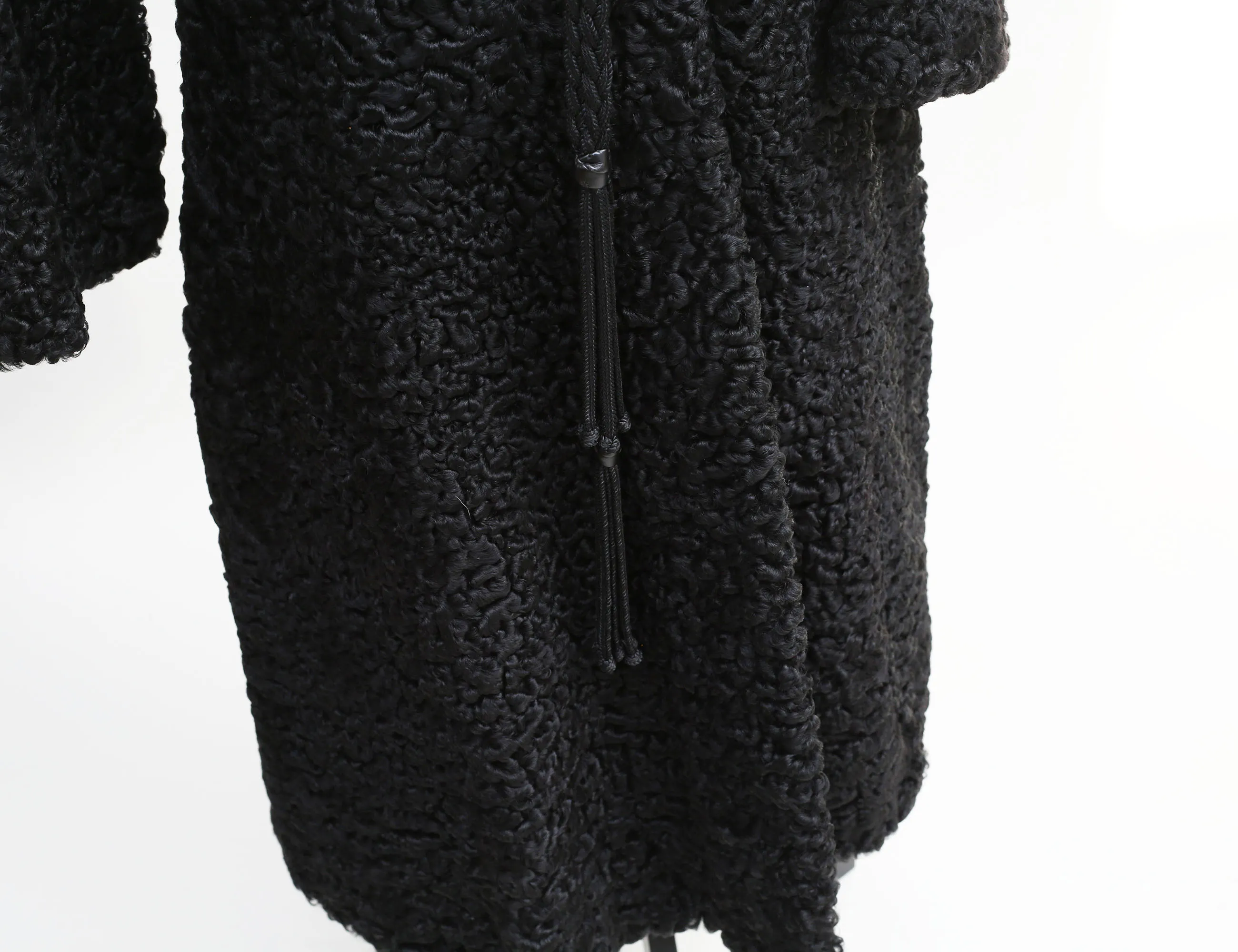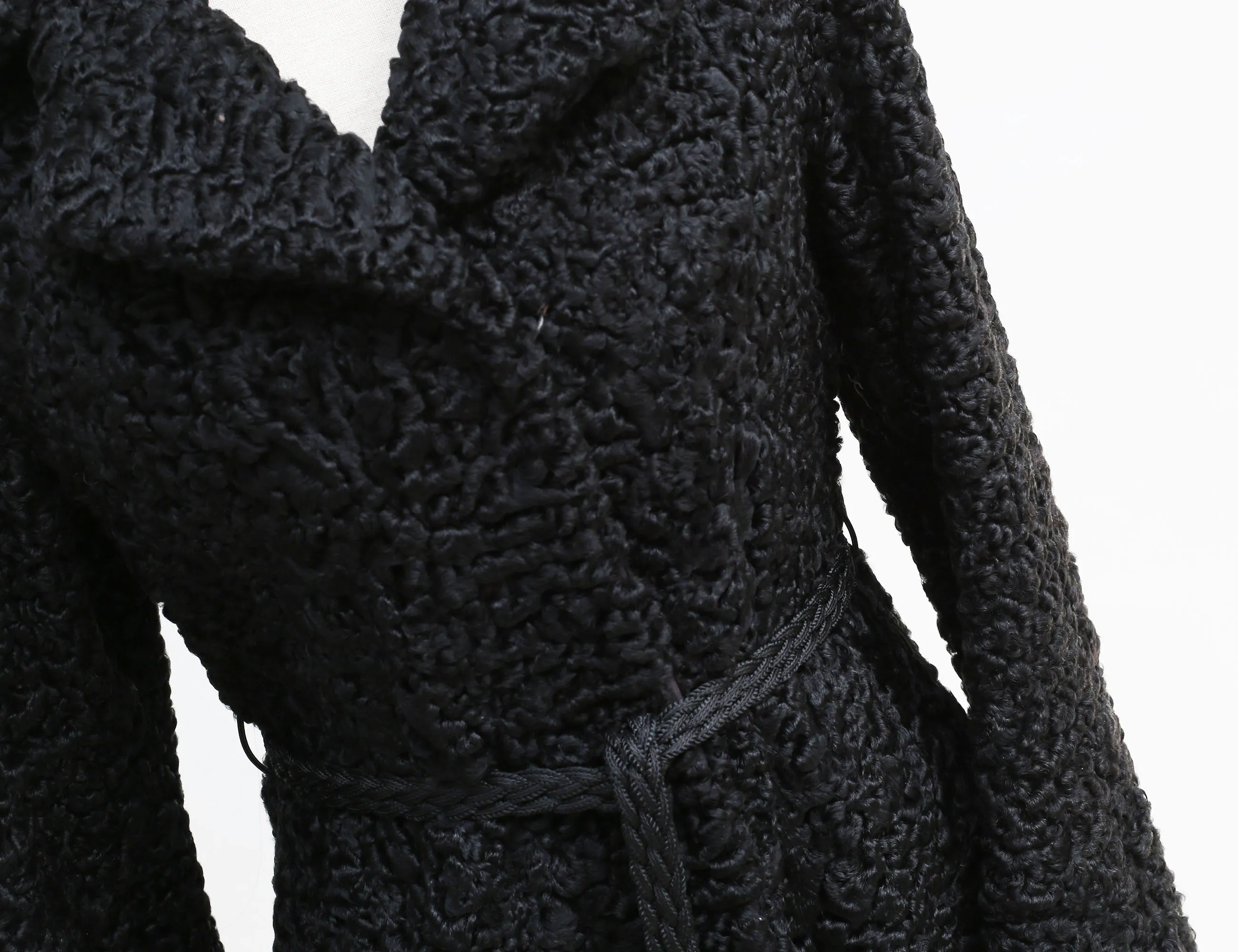 svart karakul-lammull, klockad insvängd modell, trumpetformade armar, flätat skärp, etikettmärkt, storlek S/M, armlängd 62, rygglängd 118, hatt medföljer