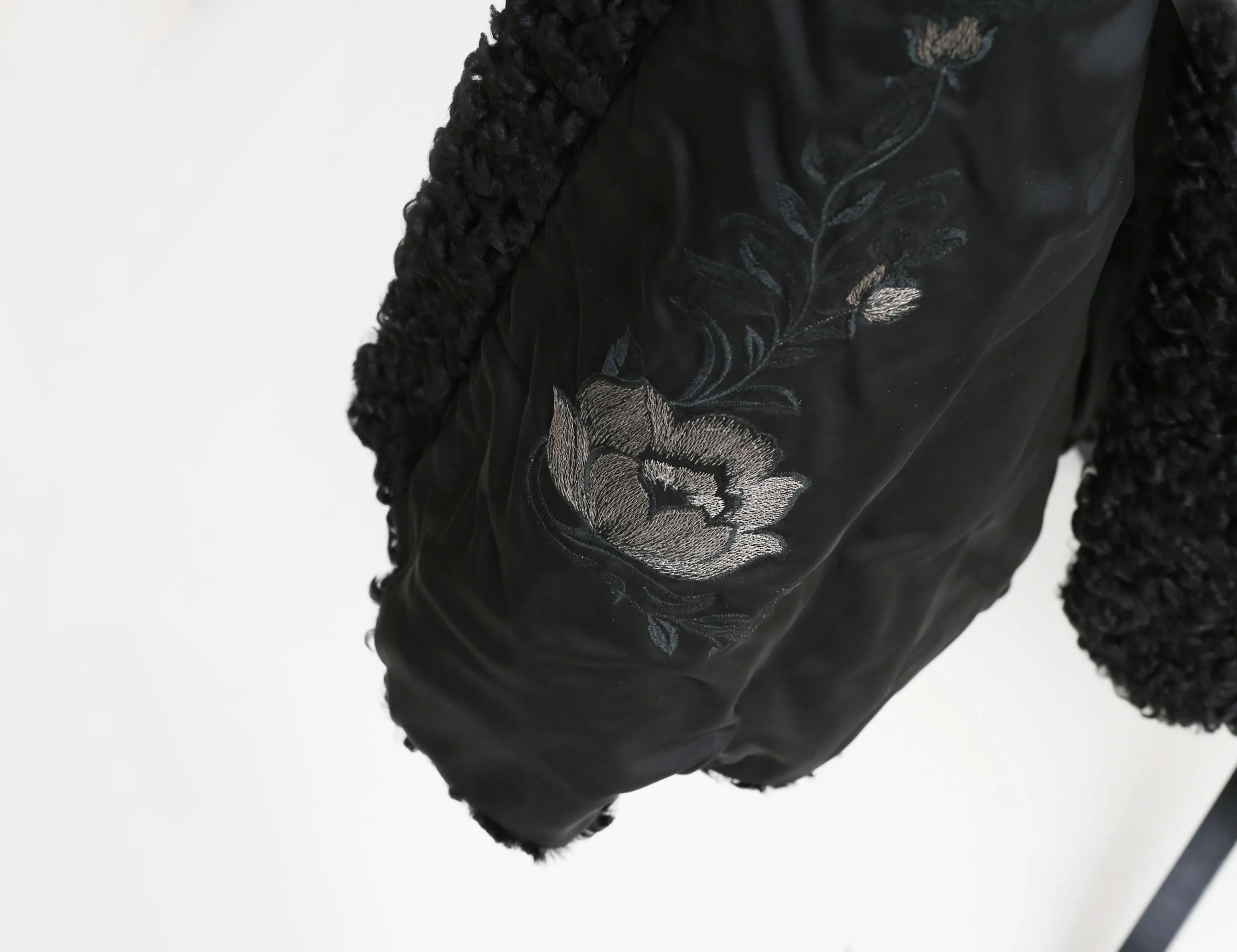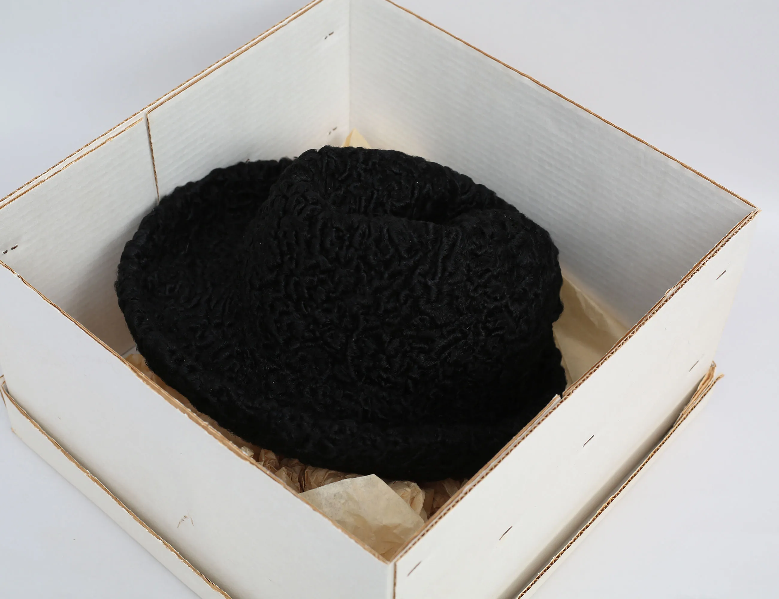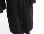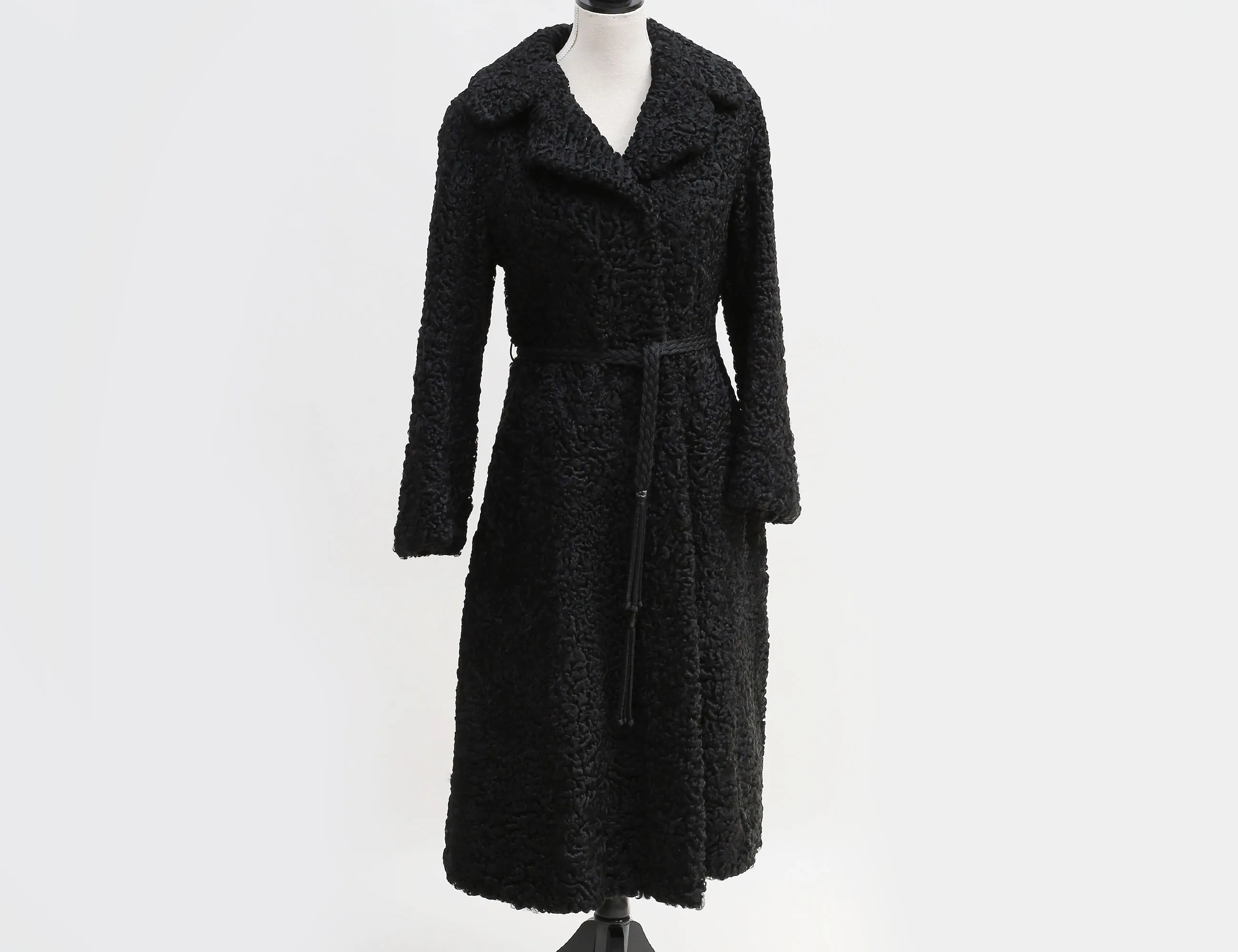 svart karakul-lammull, klockad insvängd modell, trumpetformade armar, flätat skärp, etikettmärkt, storlek S/M, armlängd 62, rygglängd 118, hatt medföljer