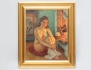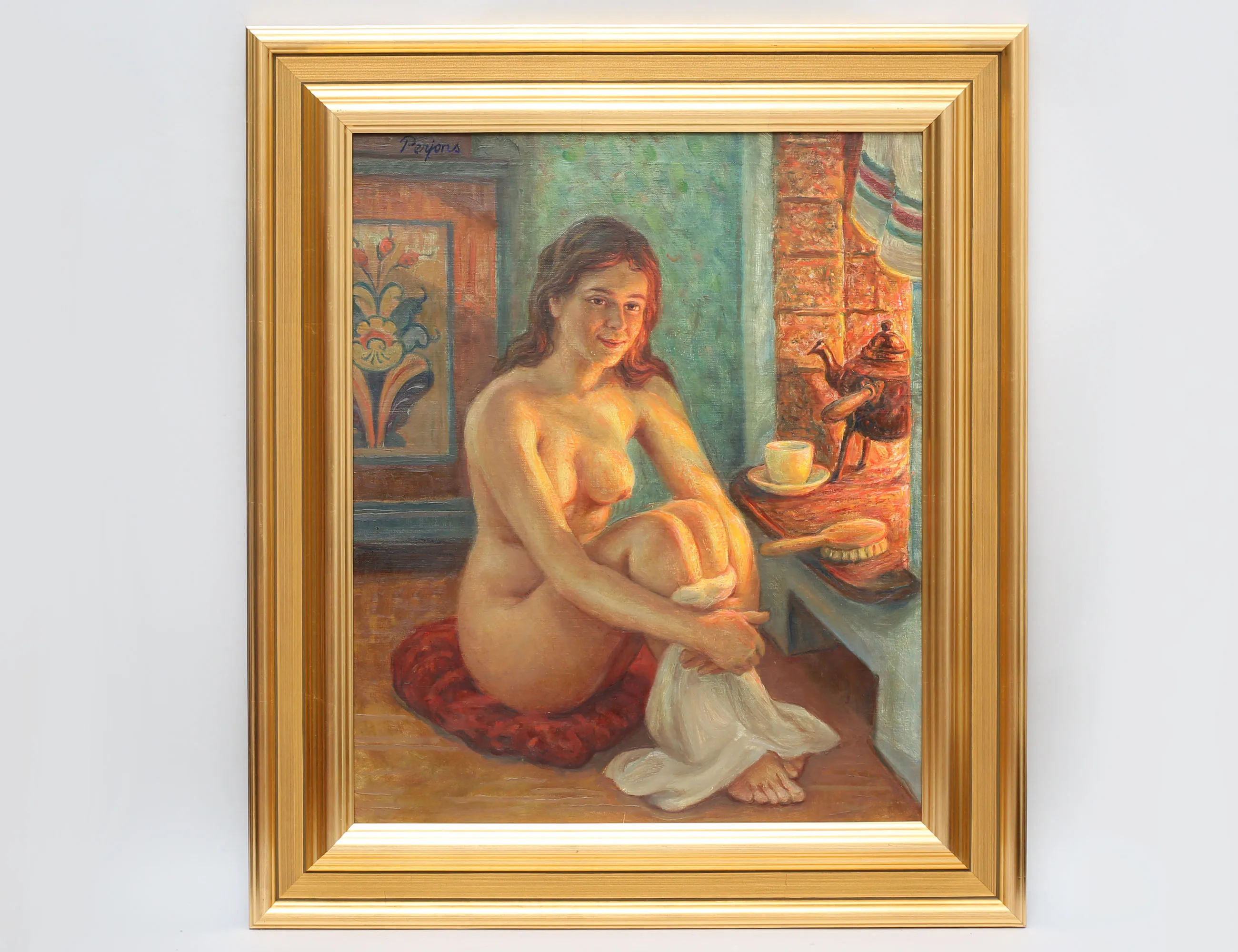 oljemålning på duk, sittande naken kvinna framför brasan, signerad även atergo nr. 11-87 Dala-Floda, 55x46, rammått 70x61
