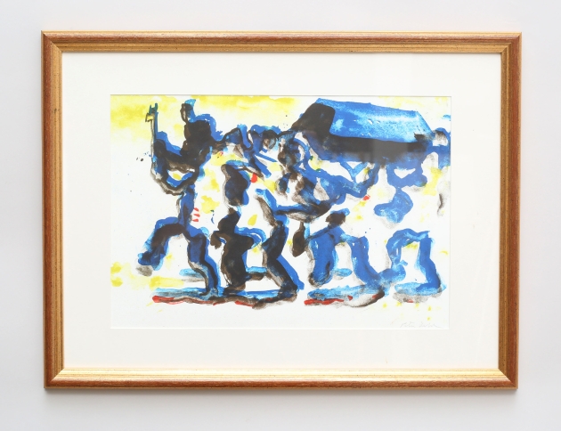 färglitografi ur Fredmans epistlar, Epistel nr. 38 "Rörande Mollbergs Paradering vid Corporal Bromans graf", signerad, 28,5x41, rammått 44x59