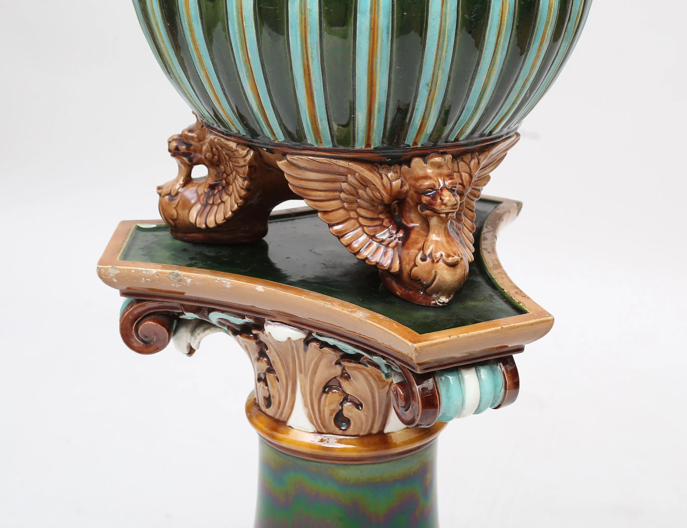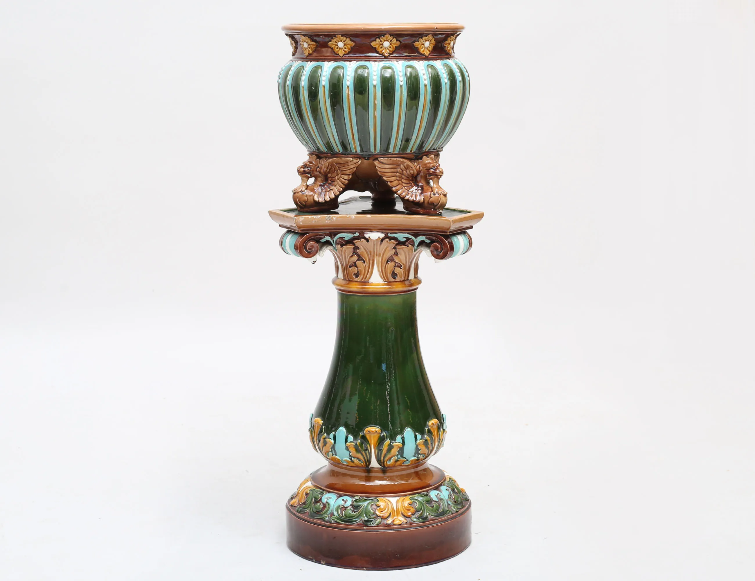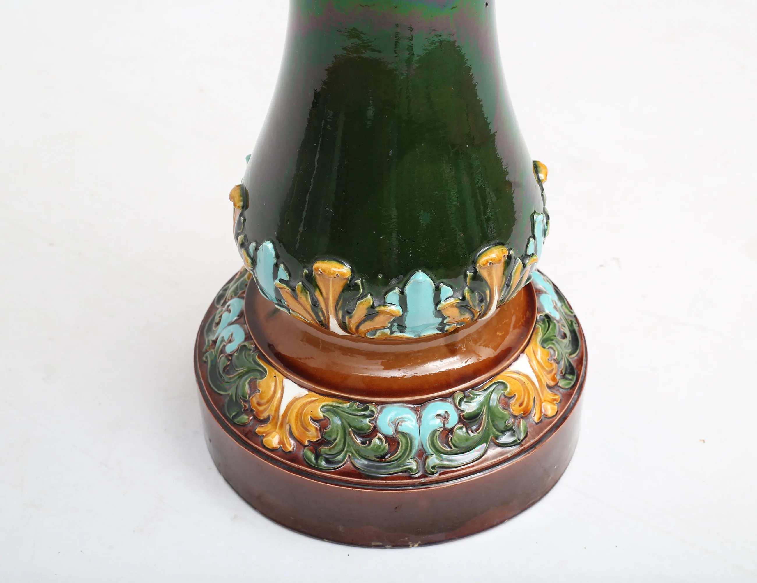 Doulton Lambeth England 1800-tal, stengods, polykromt glaserad i relief, rund fot, trepassformad skiva, fågelformade tassfötter, höjd 94, diameter 33 (smärre nagg, slitage)