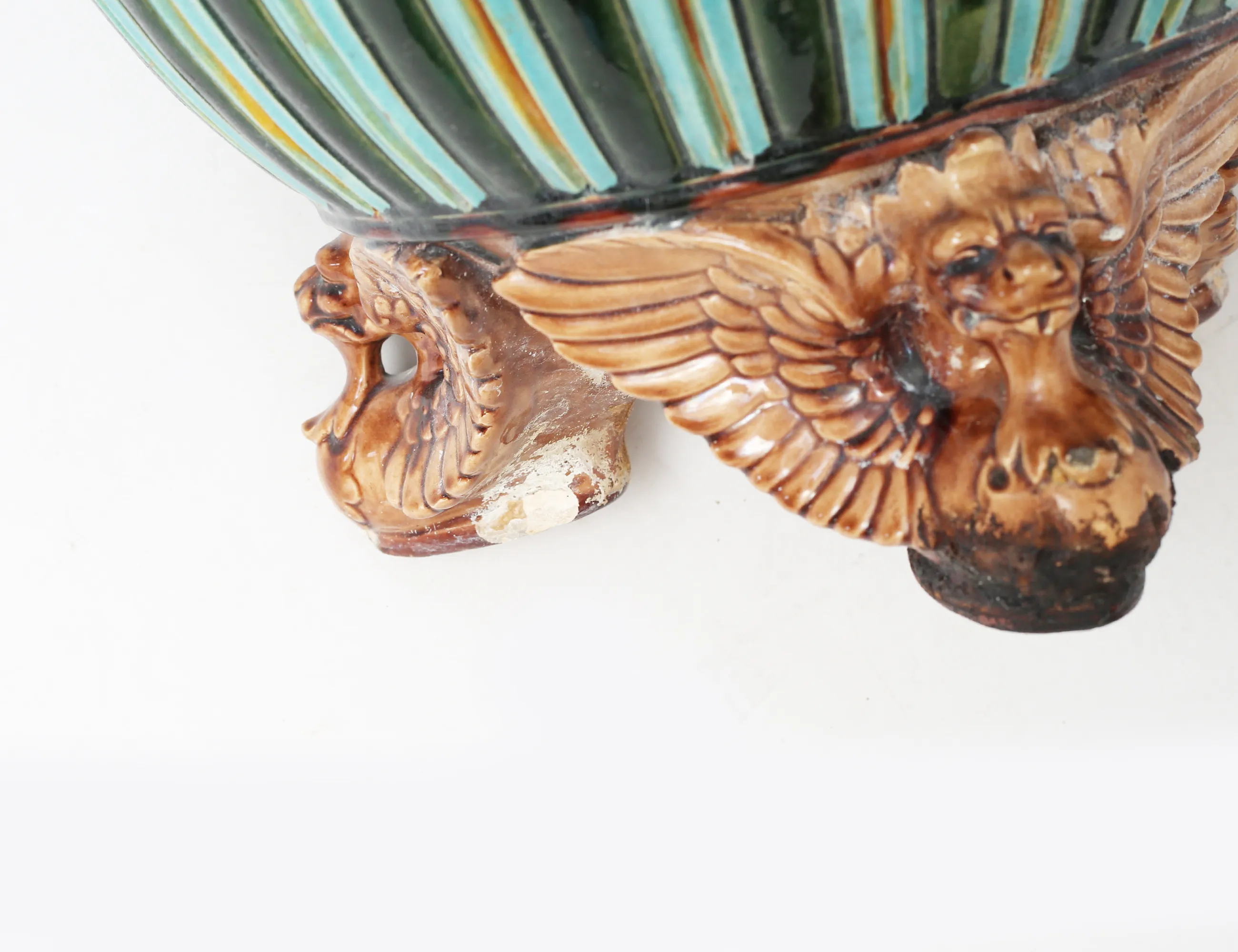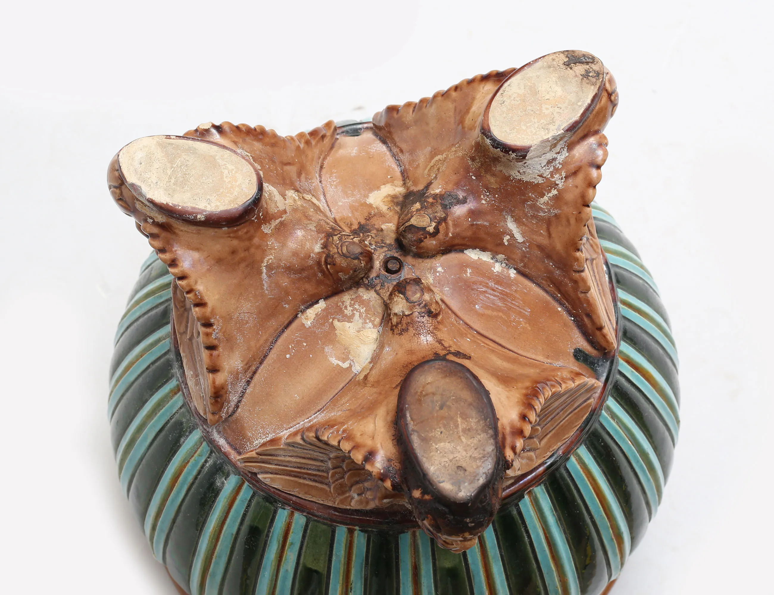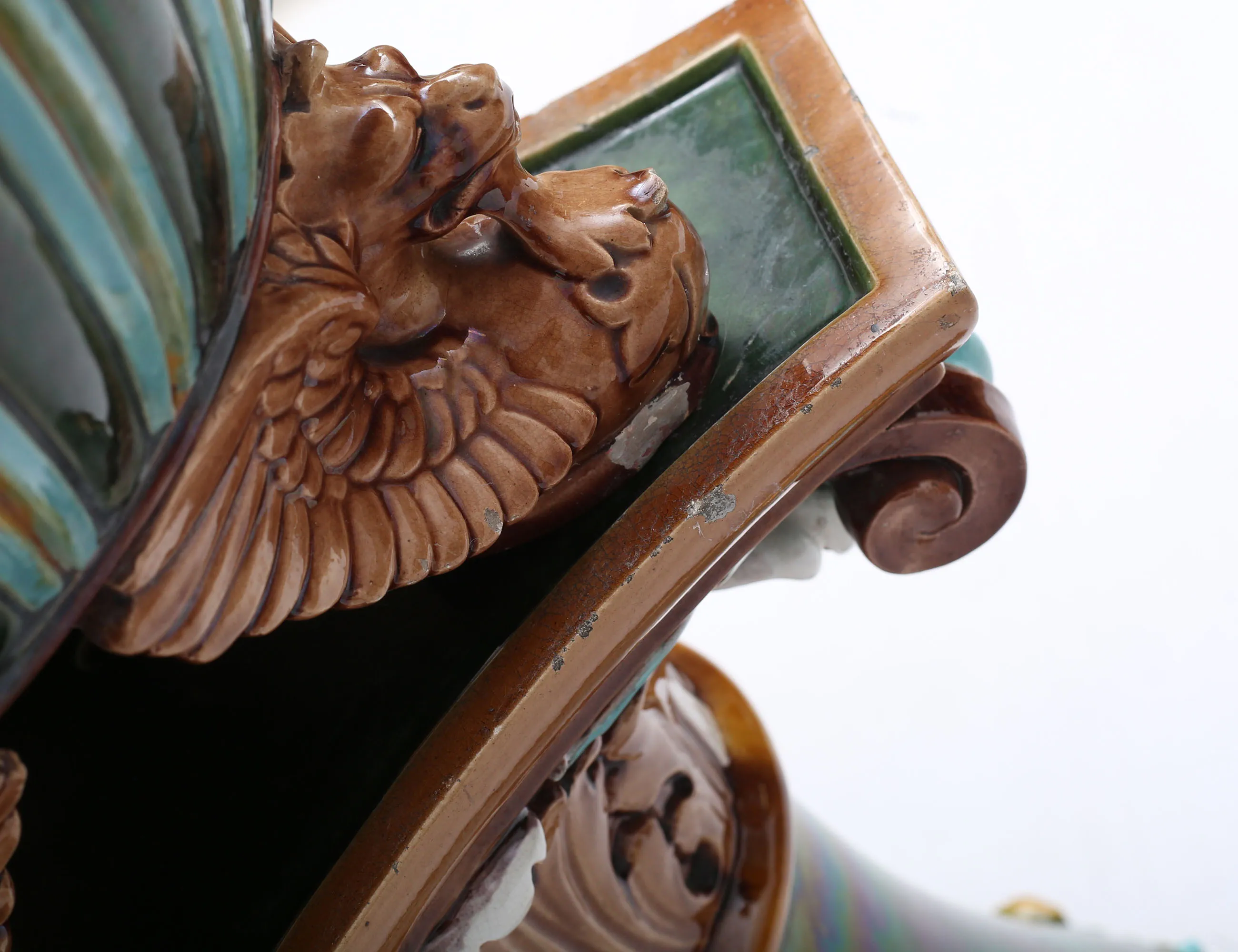 Doulton Lambeth England 1800-tal, stengods, polykromt glaserad i relief, rund fot, trepassformad skiva, fågelformade tassfötter, höjd 94, diameter 33 (smärre nagg, slitage)
