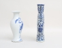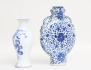1800-tal, sen Qingdynasti, blåvit underglasyrdekor, hänklar i form av drakar, vas med figurdekor, höjd 26/21 (båda med mynningsnagg, vas med glasyrslitage runt fotringen) (2)