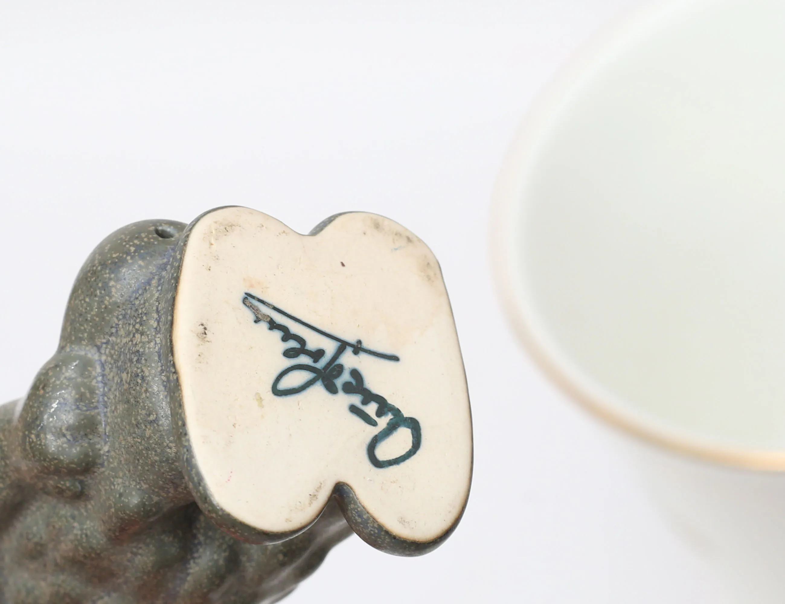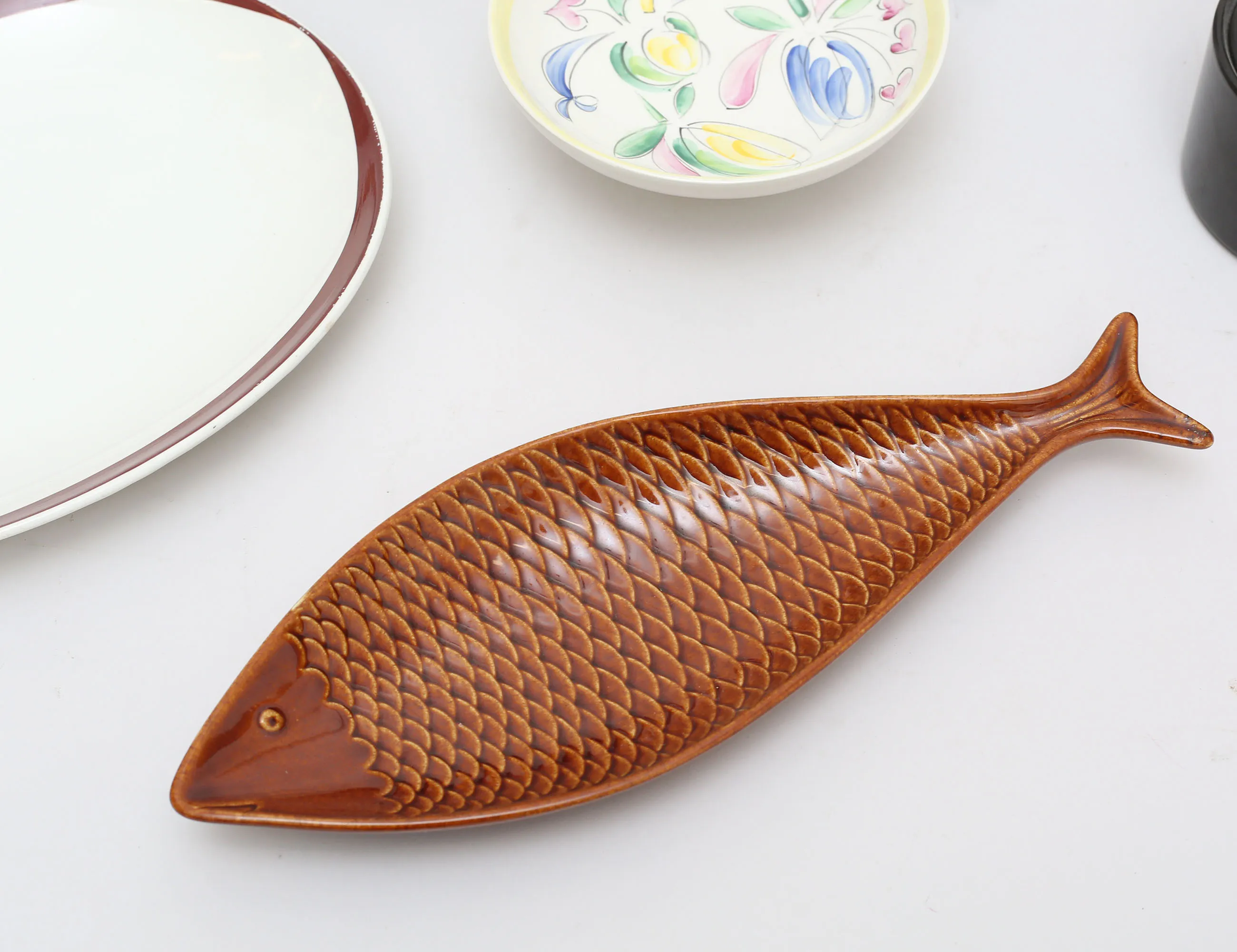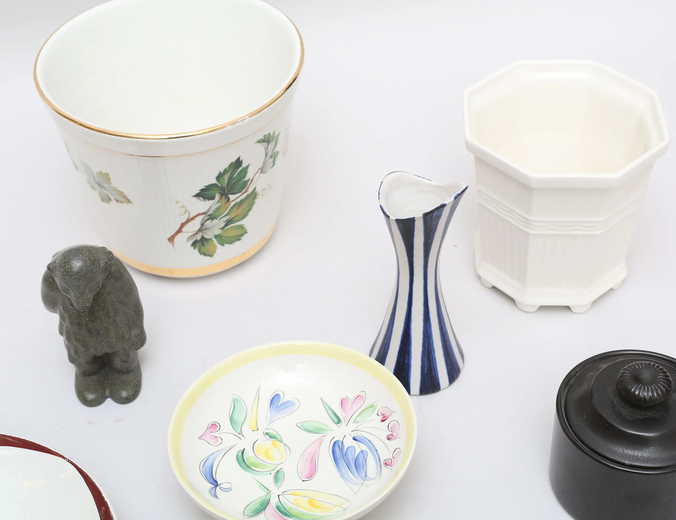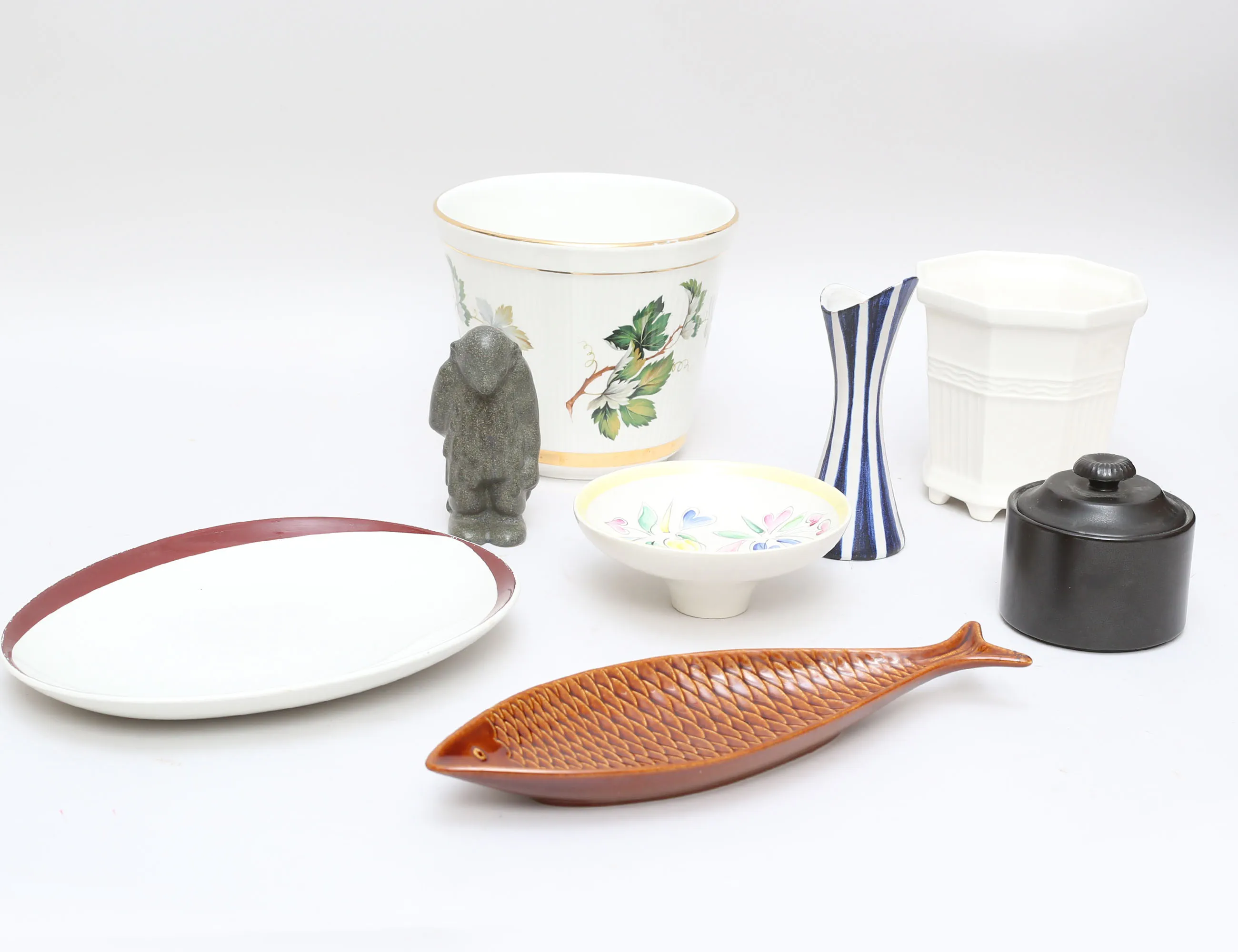 fat i form av fisk Stig Lindberg längd 32, fat "Elips brun" längd 26,5, ytterfoder Prins Eugen höjd 13, skål med lock "Mangan" Lillemor Mannerheim höjd 9, ytterfoder höjd 15, skål Gefle/UE diameter 14, vas AJ Höganäs höjd 15,5, figurin oidentifierad höjd 11,5