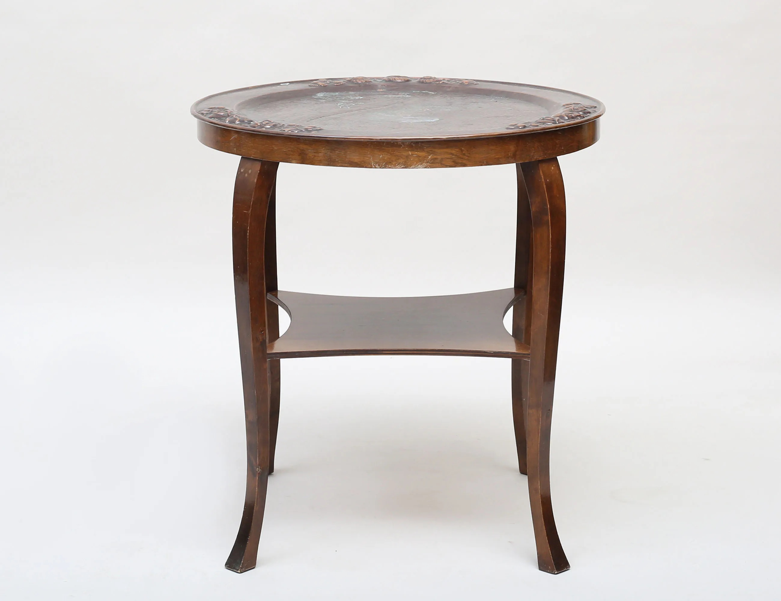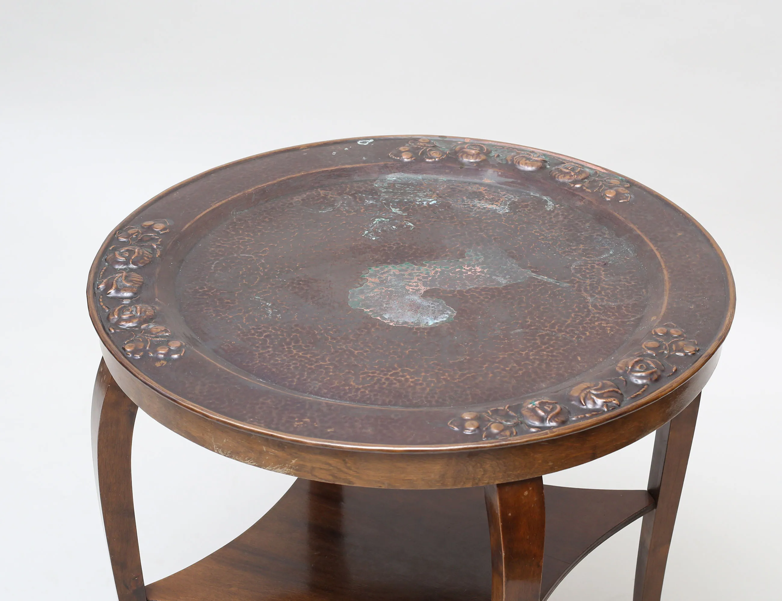 skiva i patinerad hamrad koppar, blommor i relief, bord i mörkpolerad björk, ett hyllplan, höjd 63, diameter 60 (fläckar)
