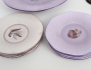 vas Ilse Claesson, höjd 20,5, fruktfat med 4 assietter, samt 4 assietter 1920/30-tal, Louise Adelborg, diameter 29/18 (en assiett med undersidsnagg)