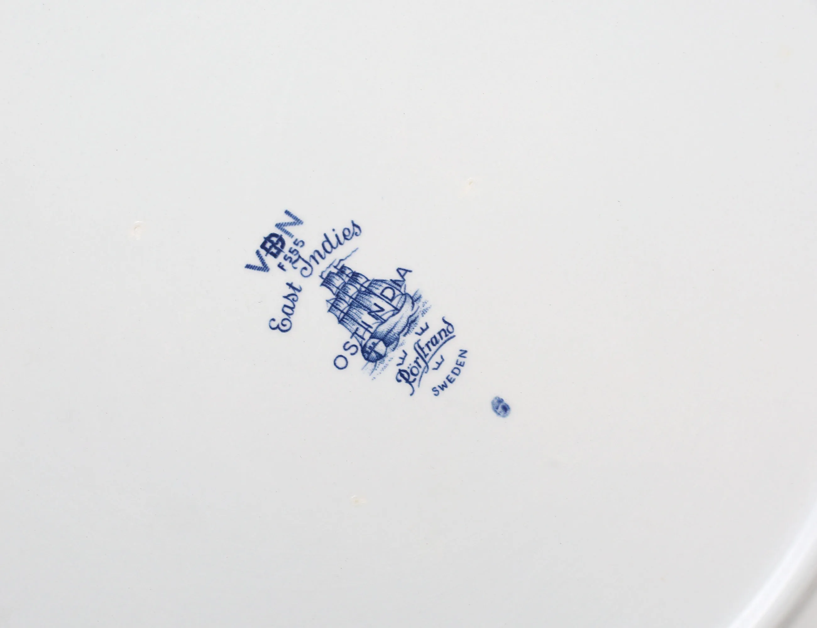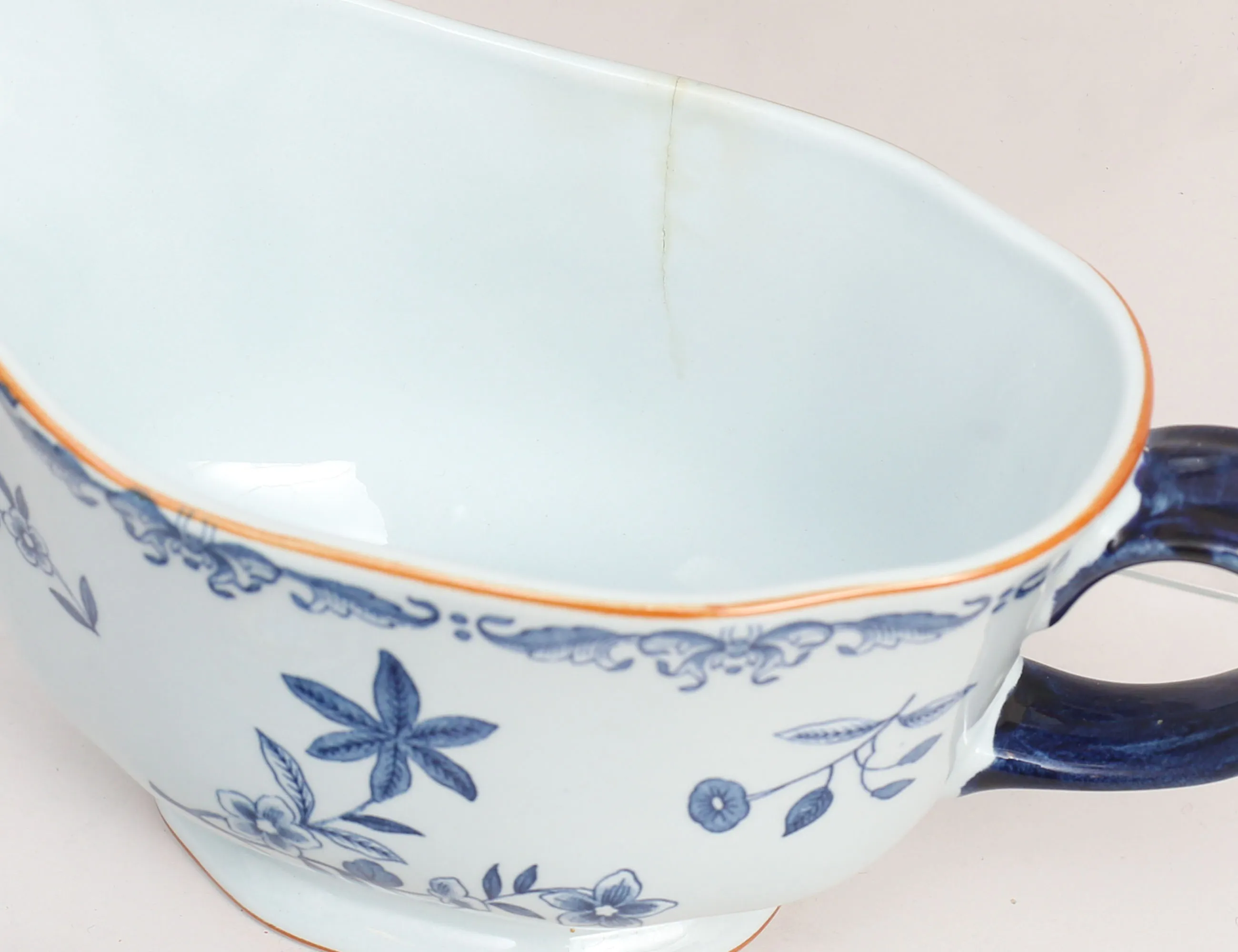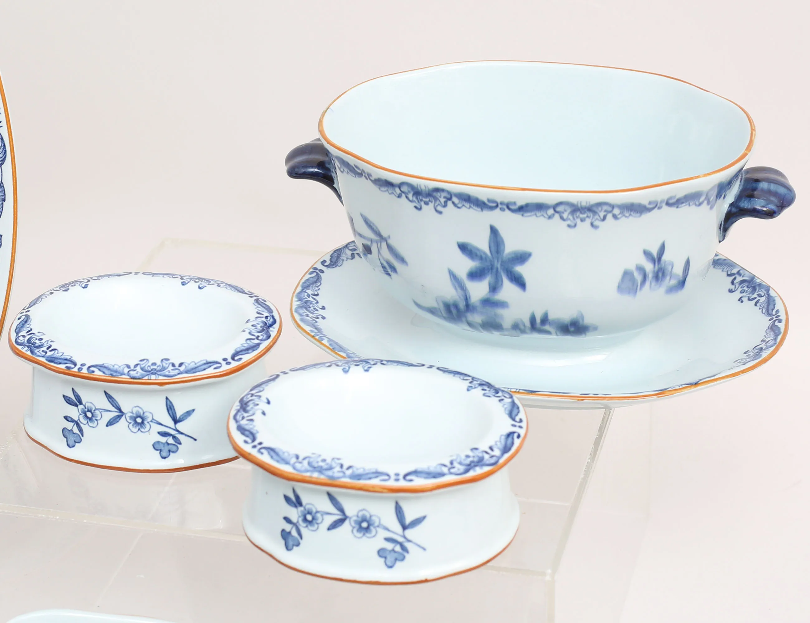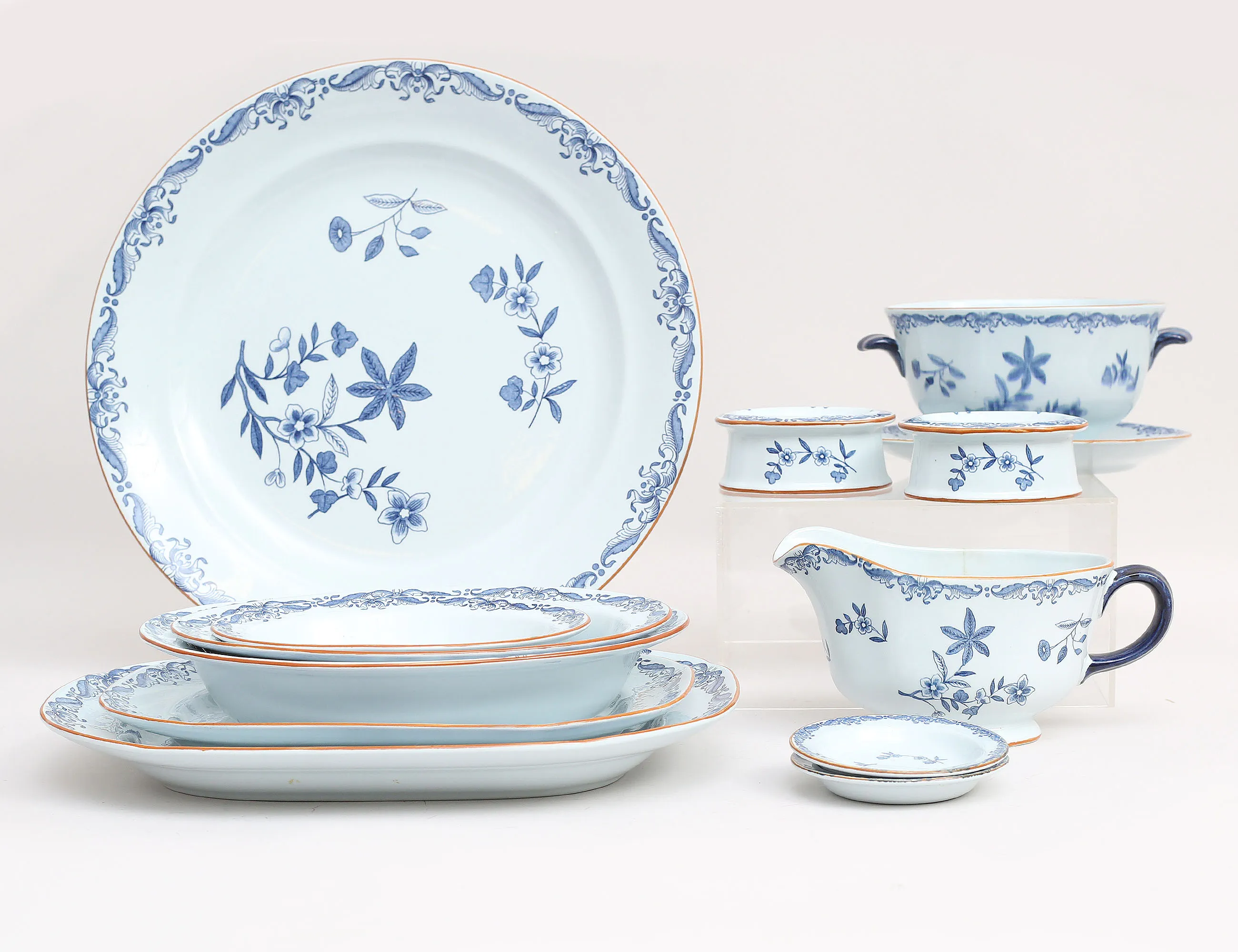servisdelar 12 stycken bla. runt uppläggningsfat, 1 par saltkar, såsskål, längd 17-31, diameter 33 (såssnipa med spricka)