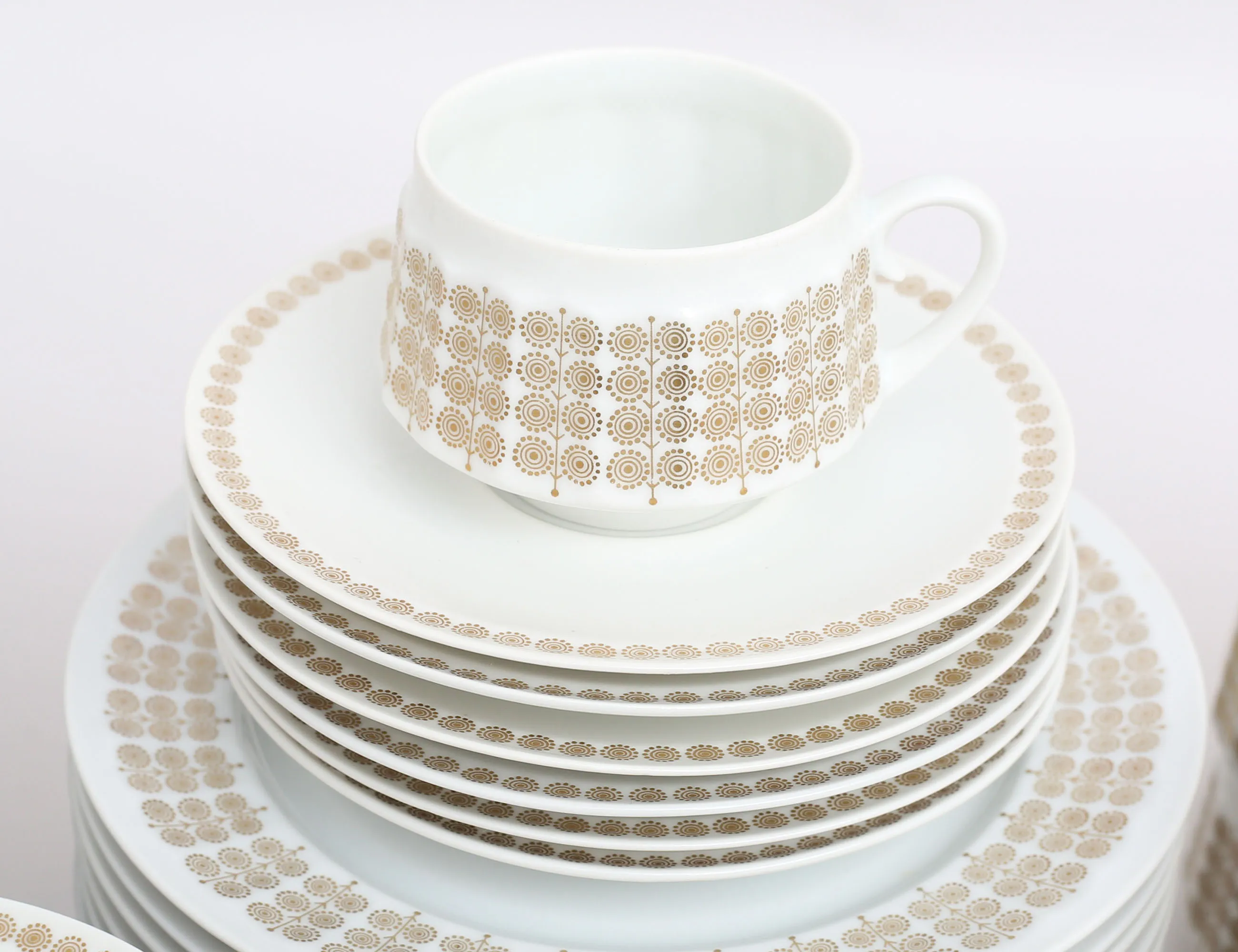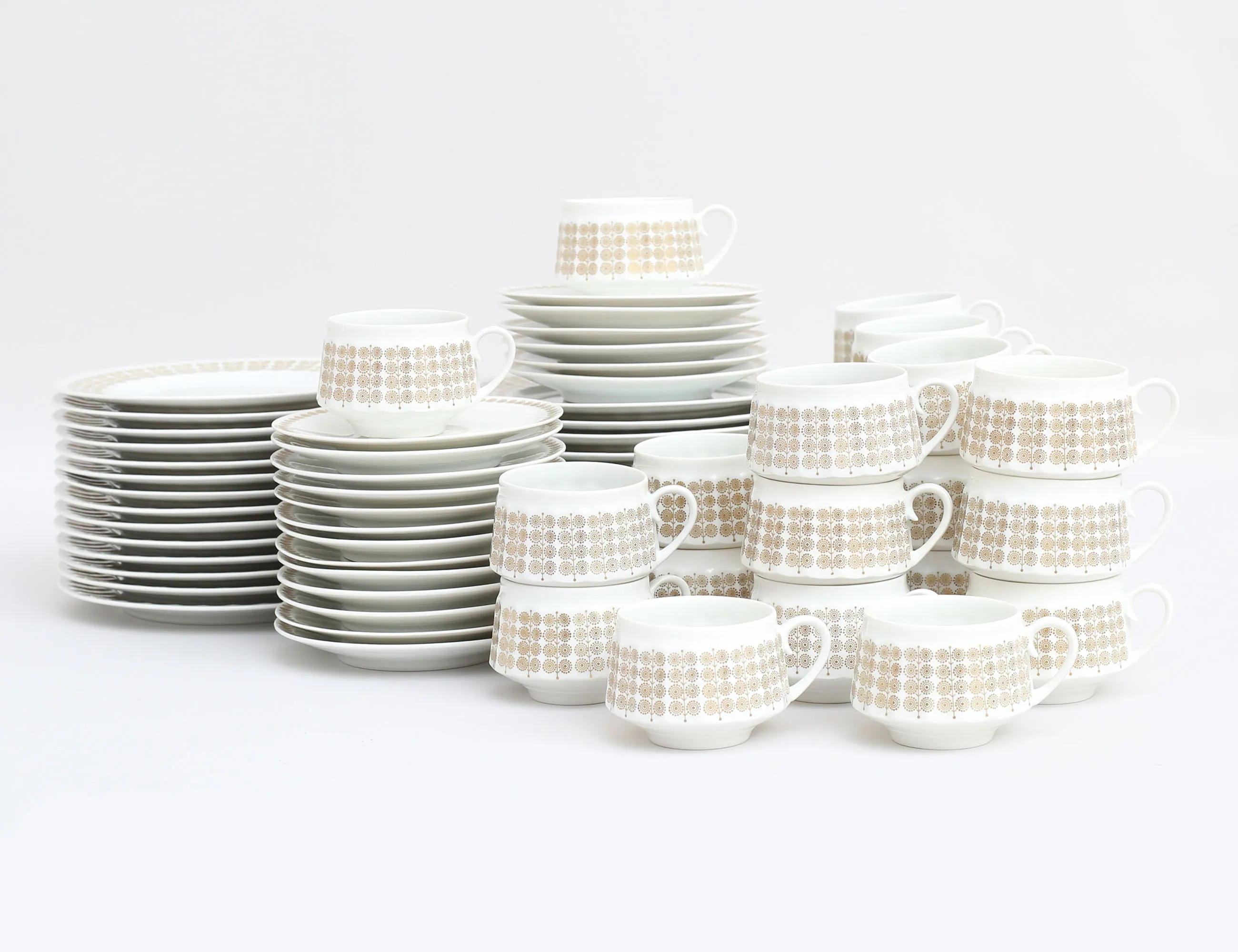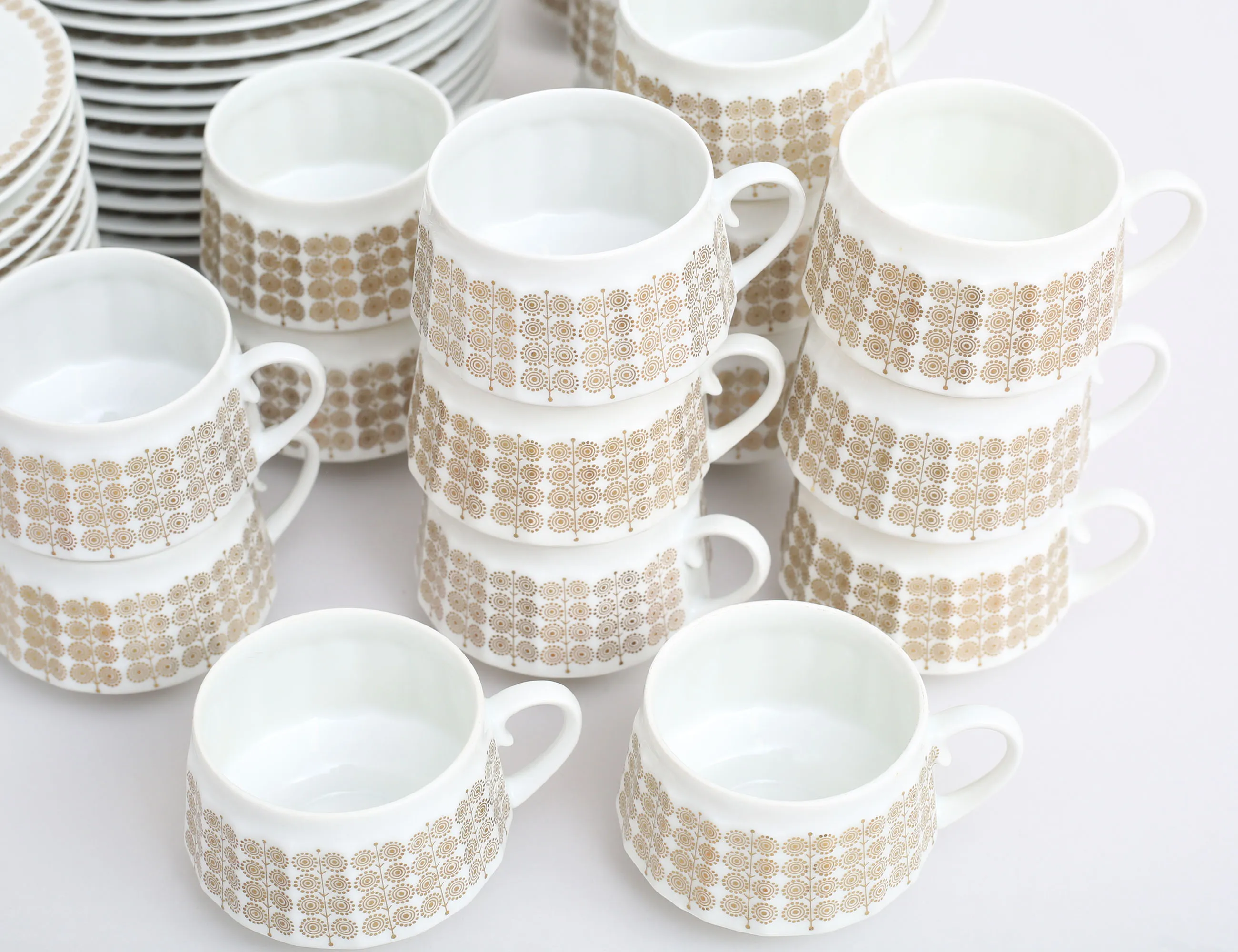 kaffeservis 46 delar "Pallas", Arabia Finland, tillverkad 1965-1970, 19 koppar med fat, 27 assietter, 4 extra koppar medföljer, höjd 5,5