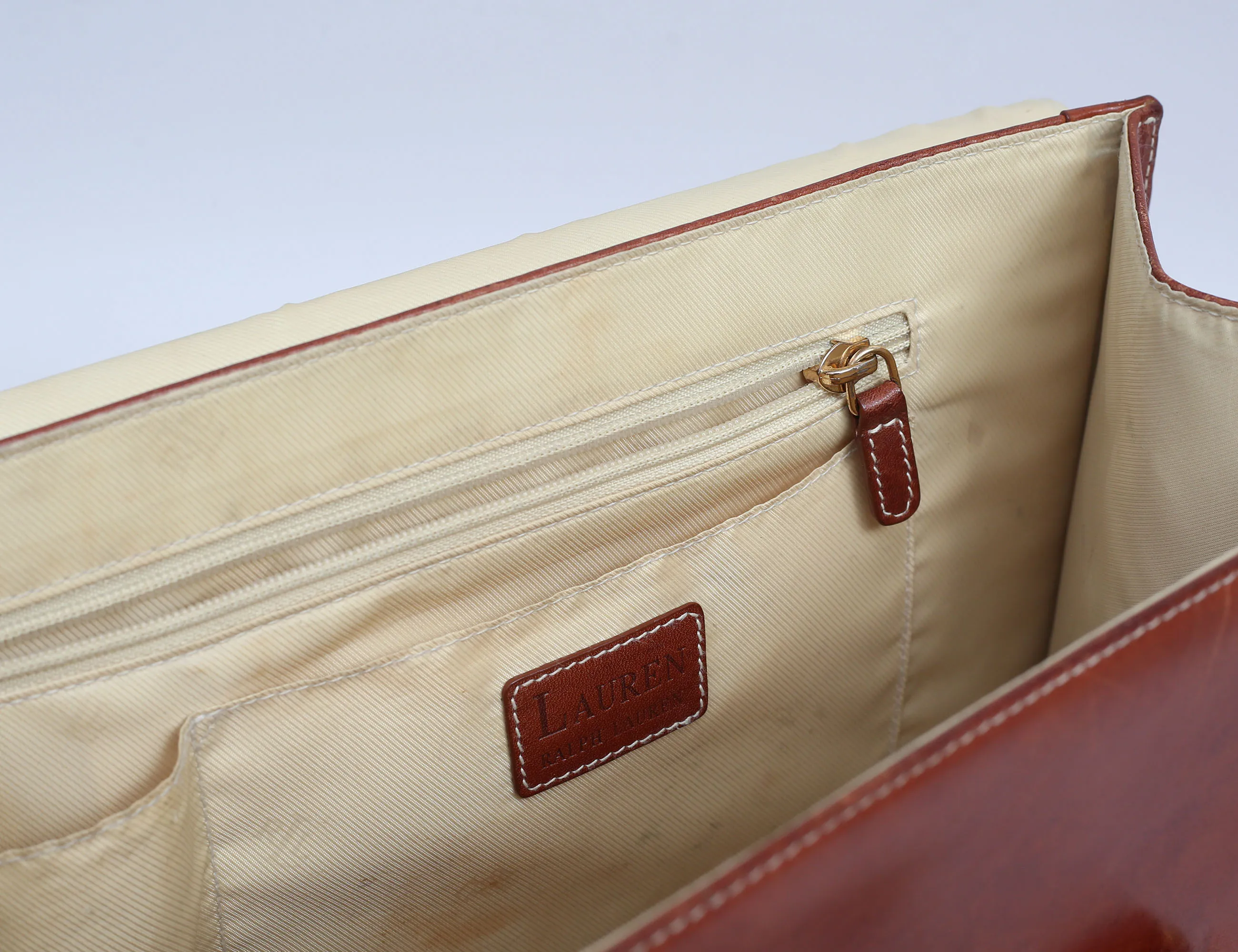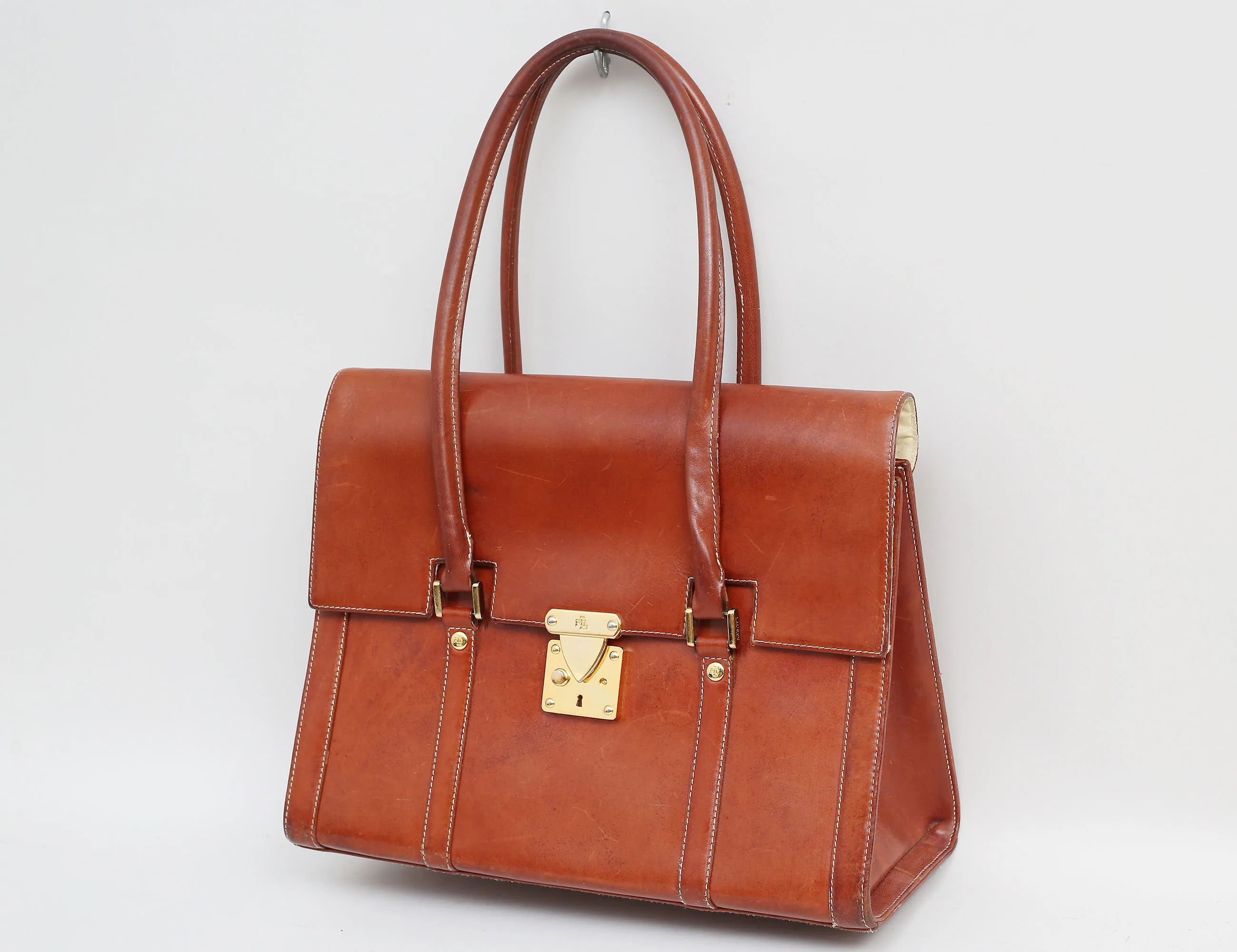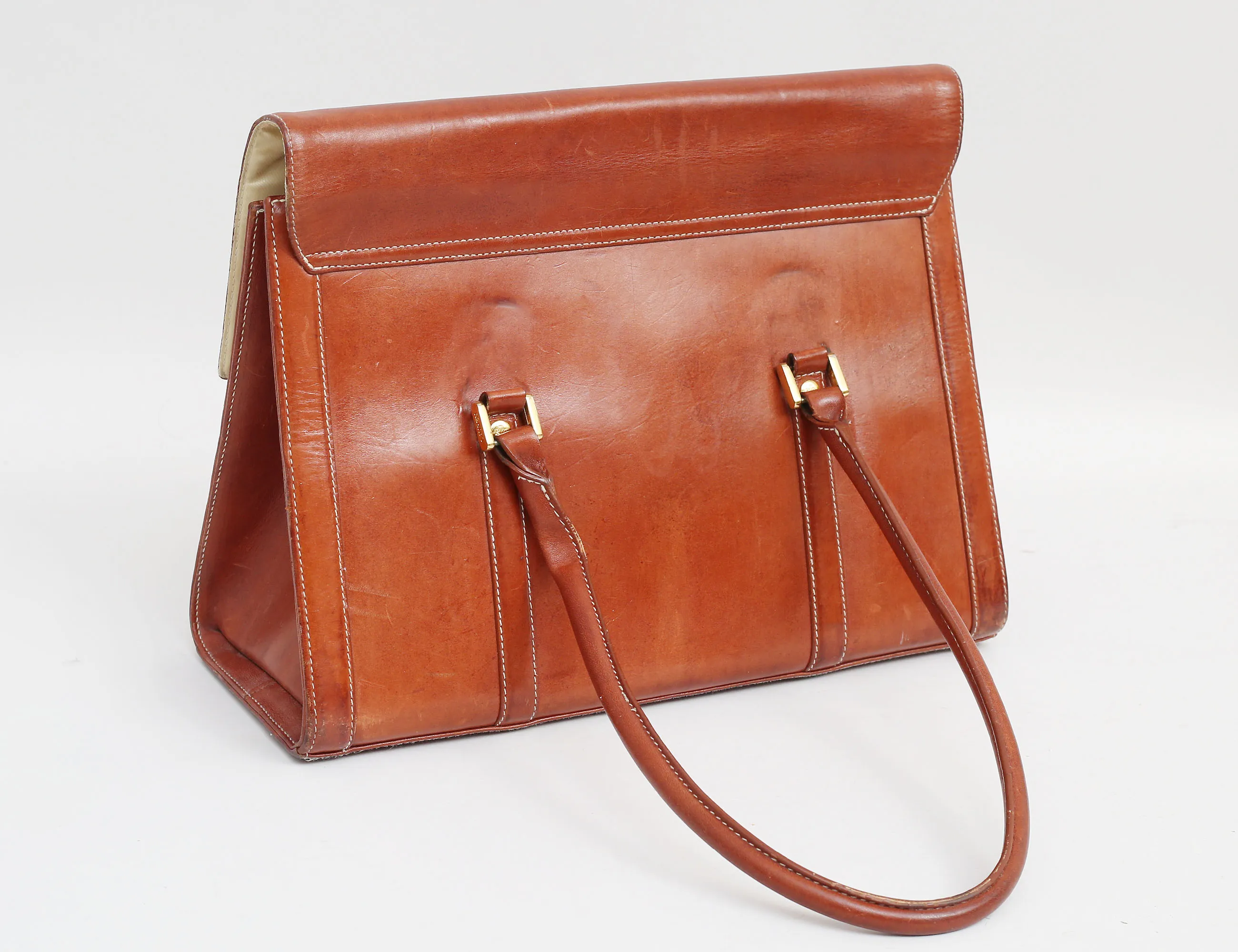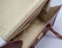 brunt läder, guldfärgade detaljer, invändigt ett fack med dragkedja, etikettmärkt, höjd 26, bredd 34 (bruksslitage, invändigt fläckar)