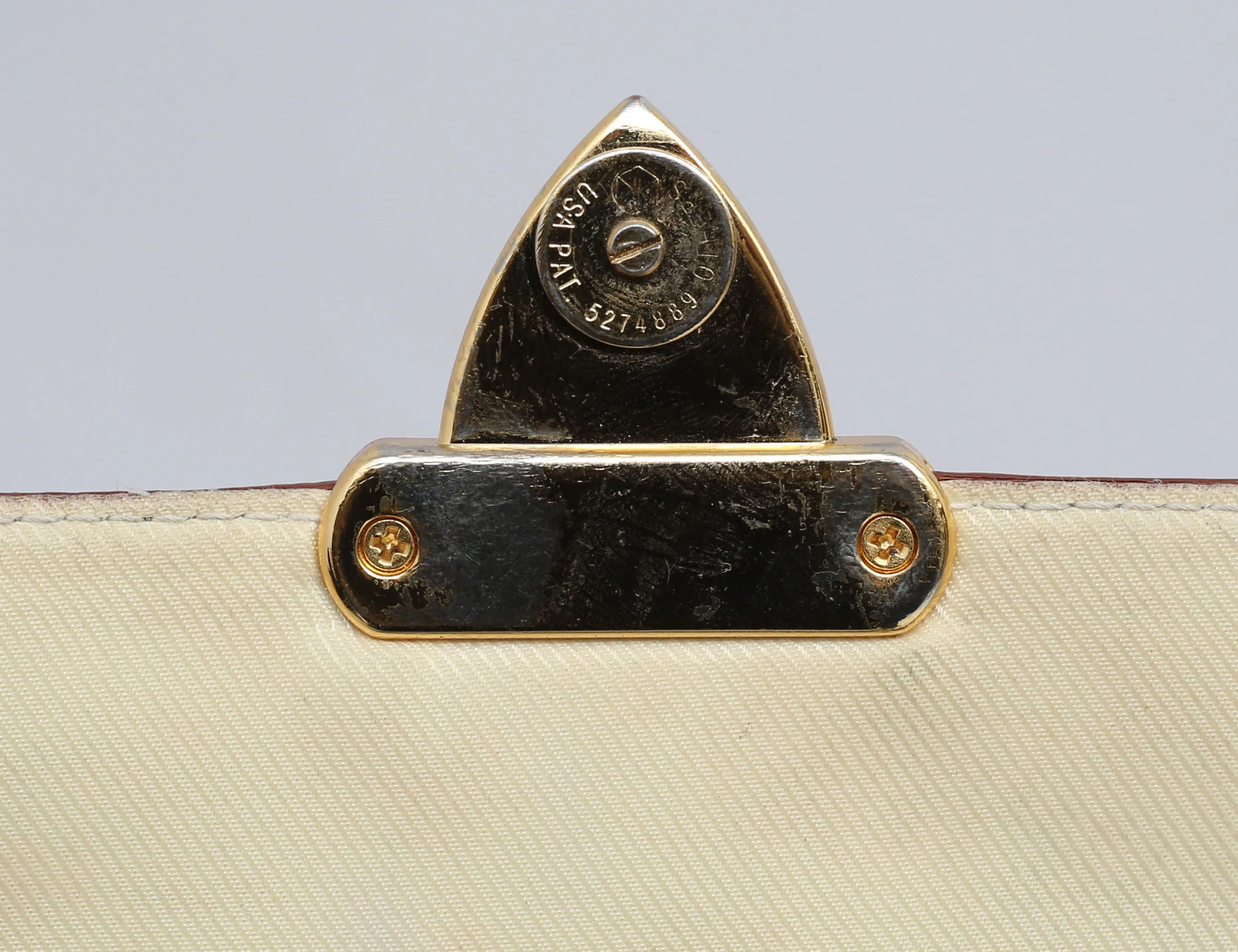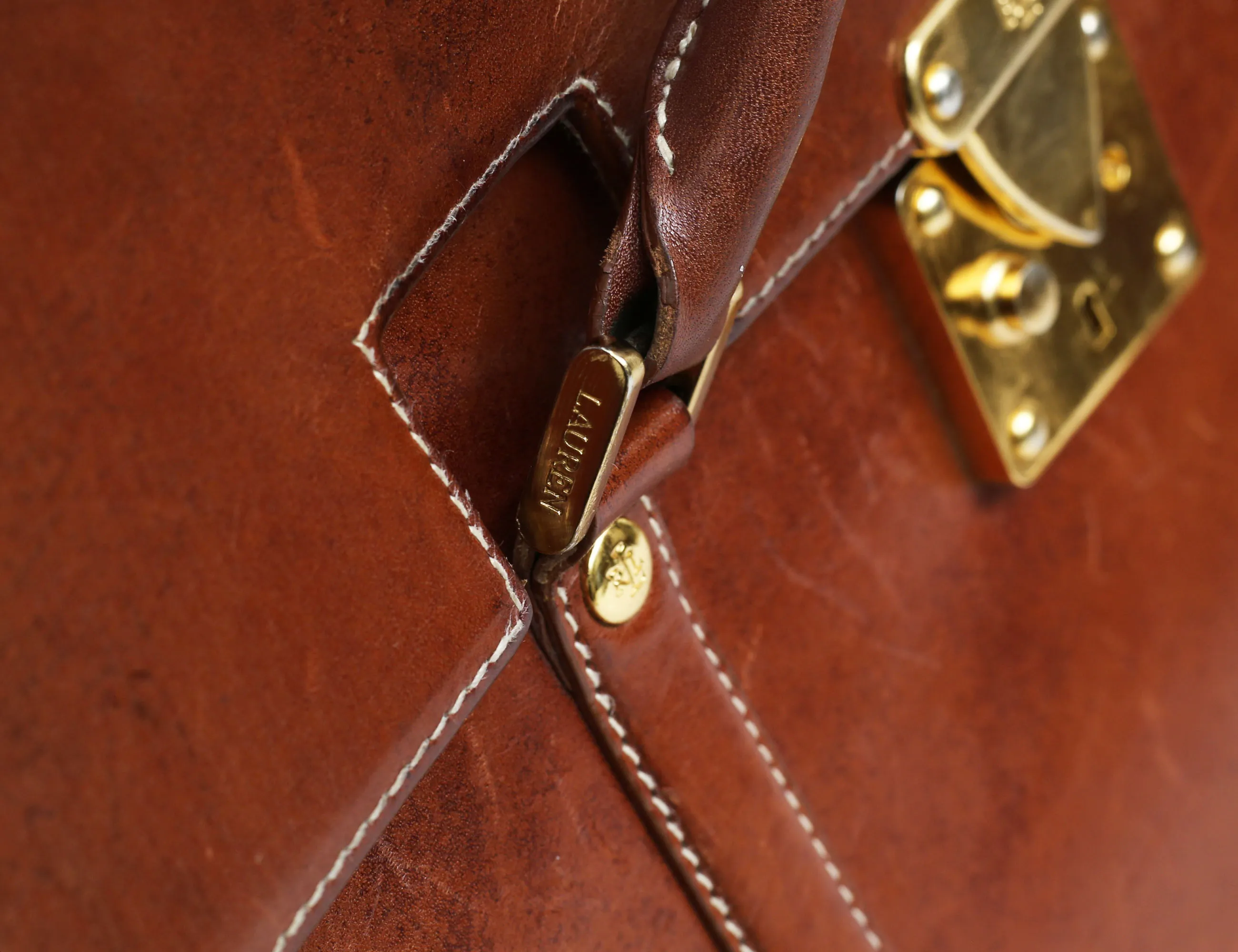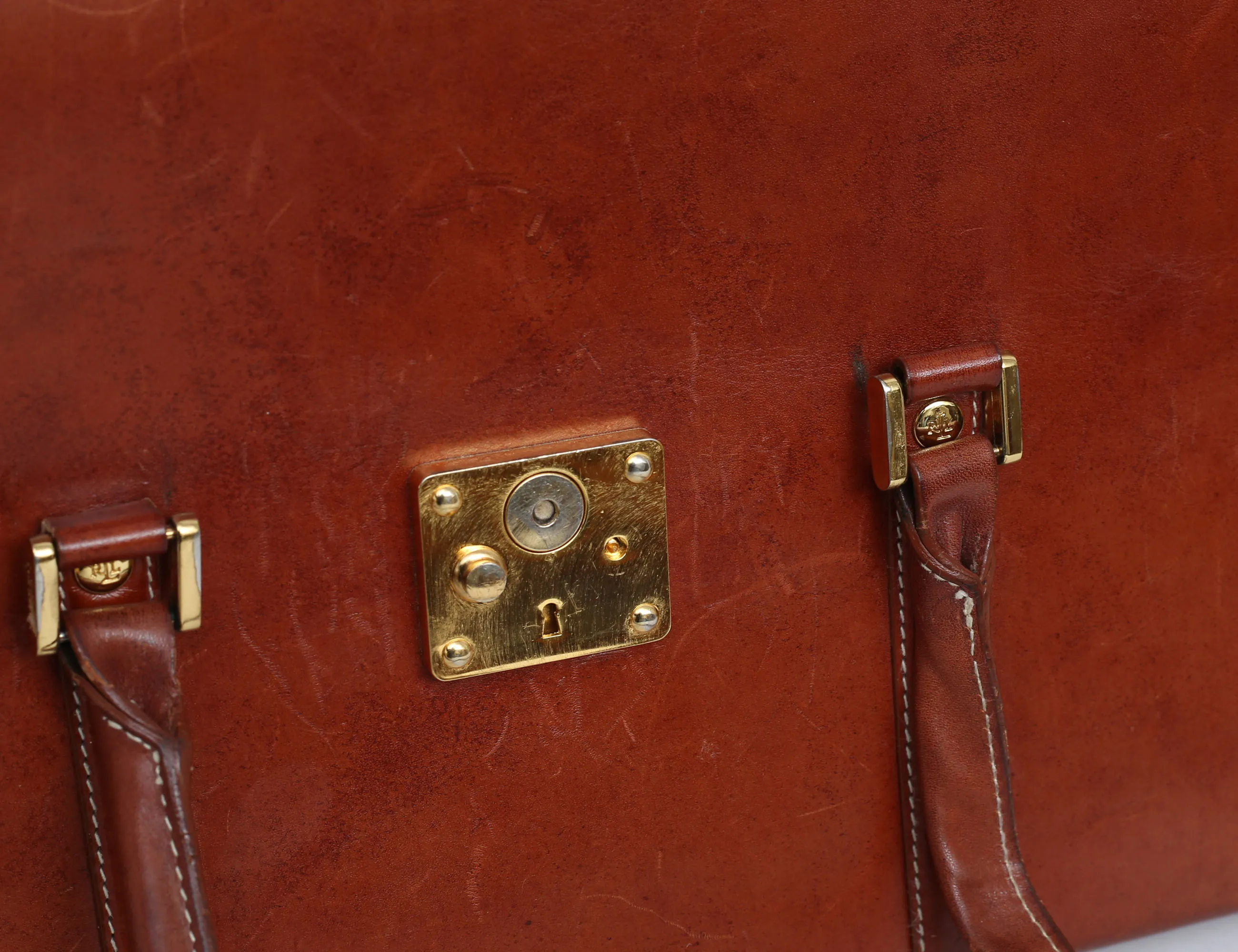 brunt läder, guldfärgade detaljer, invändigt ett fack med dragkedja, etikettmärkt, höjd 26, bredd 34 (bruksslitage, invändigt fläckar)