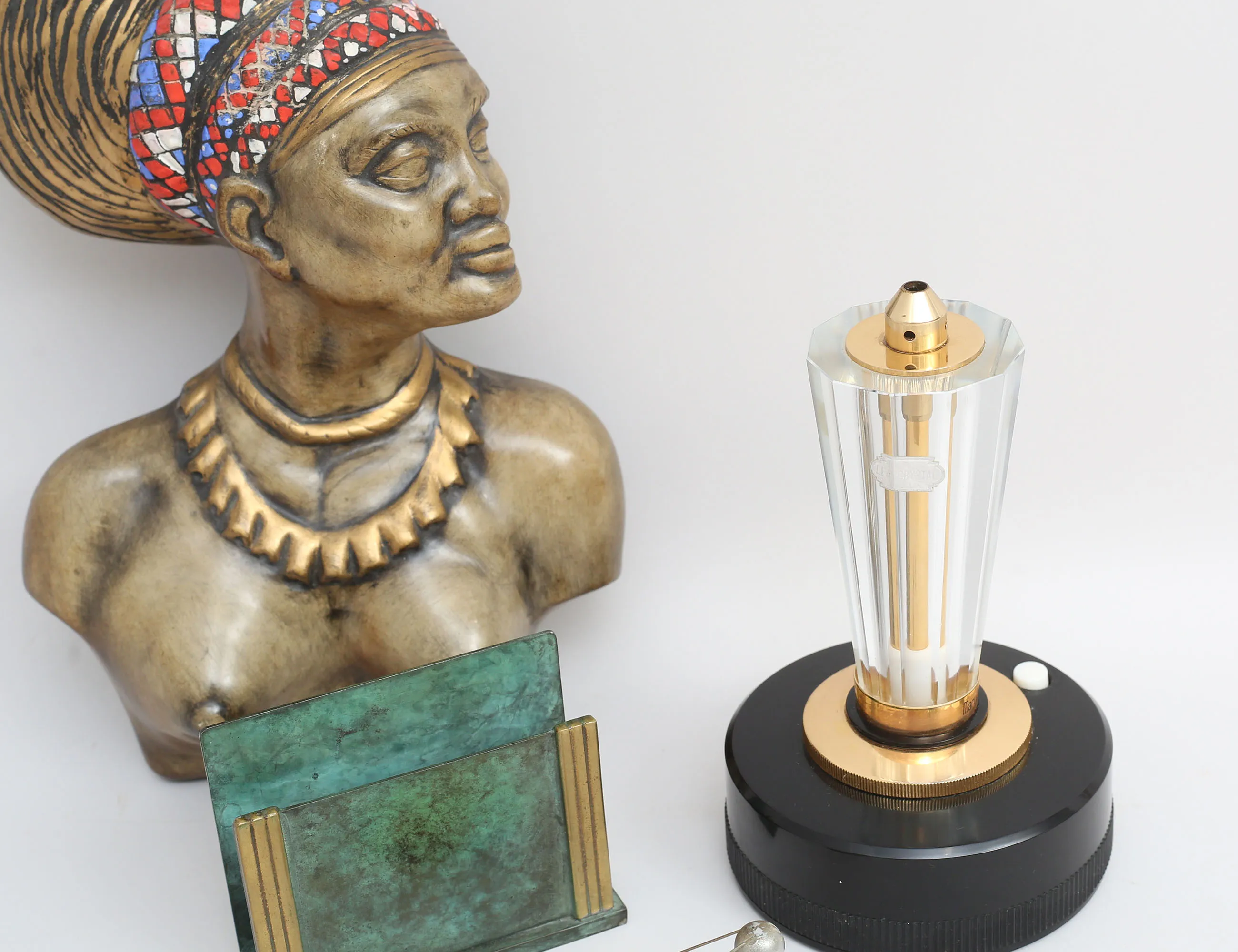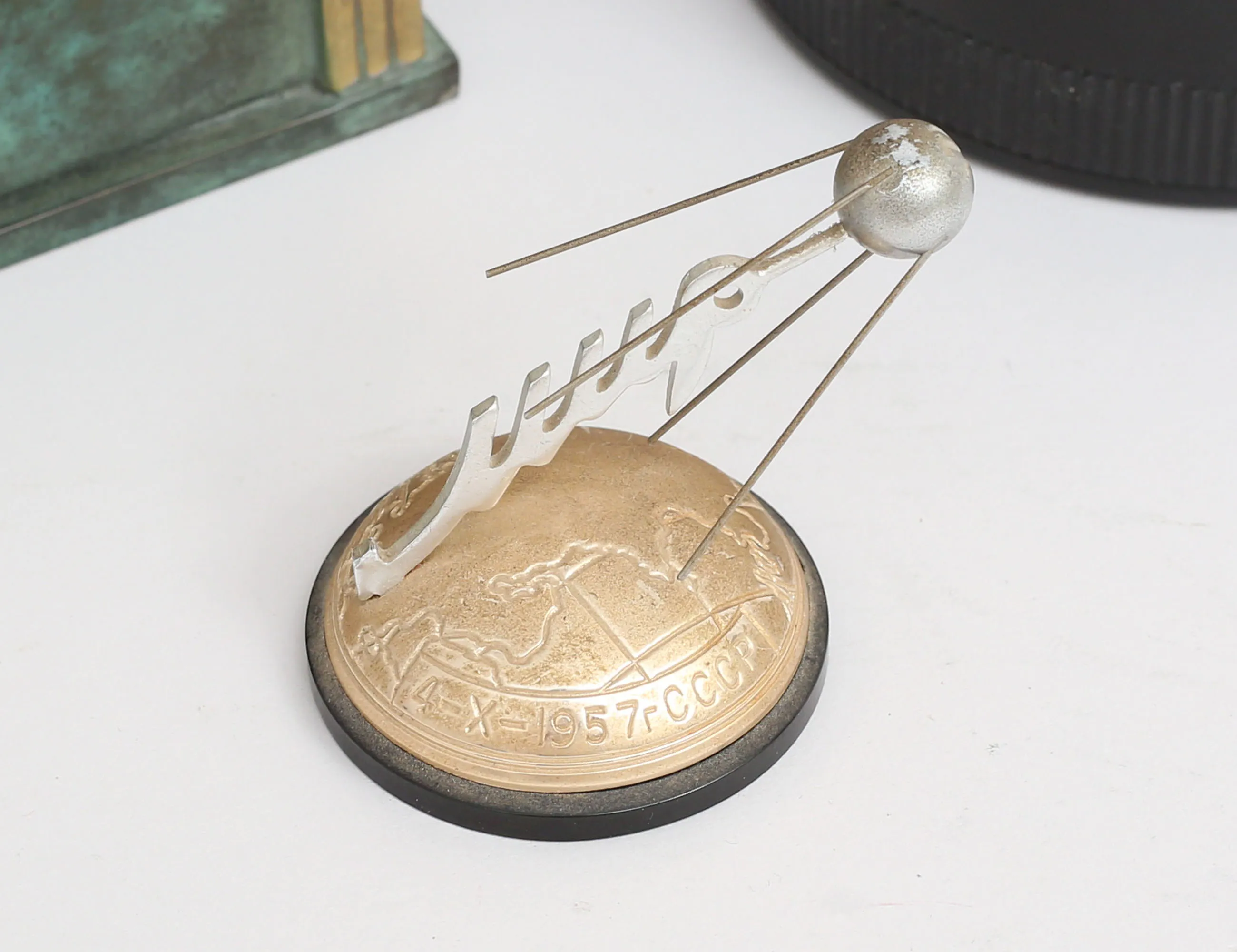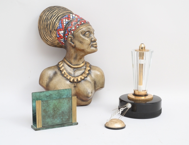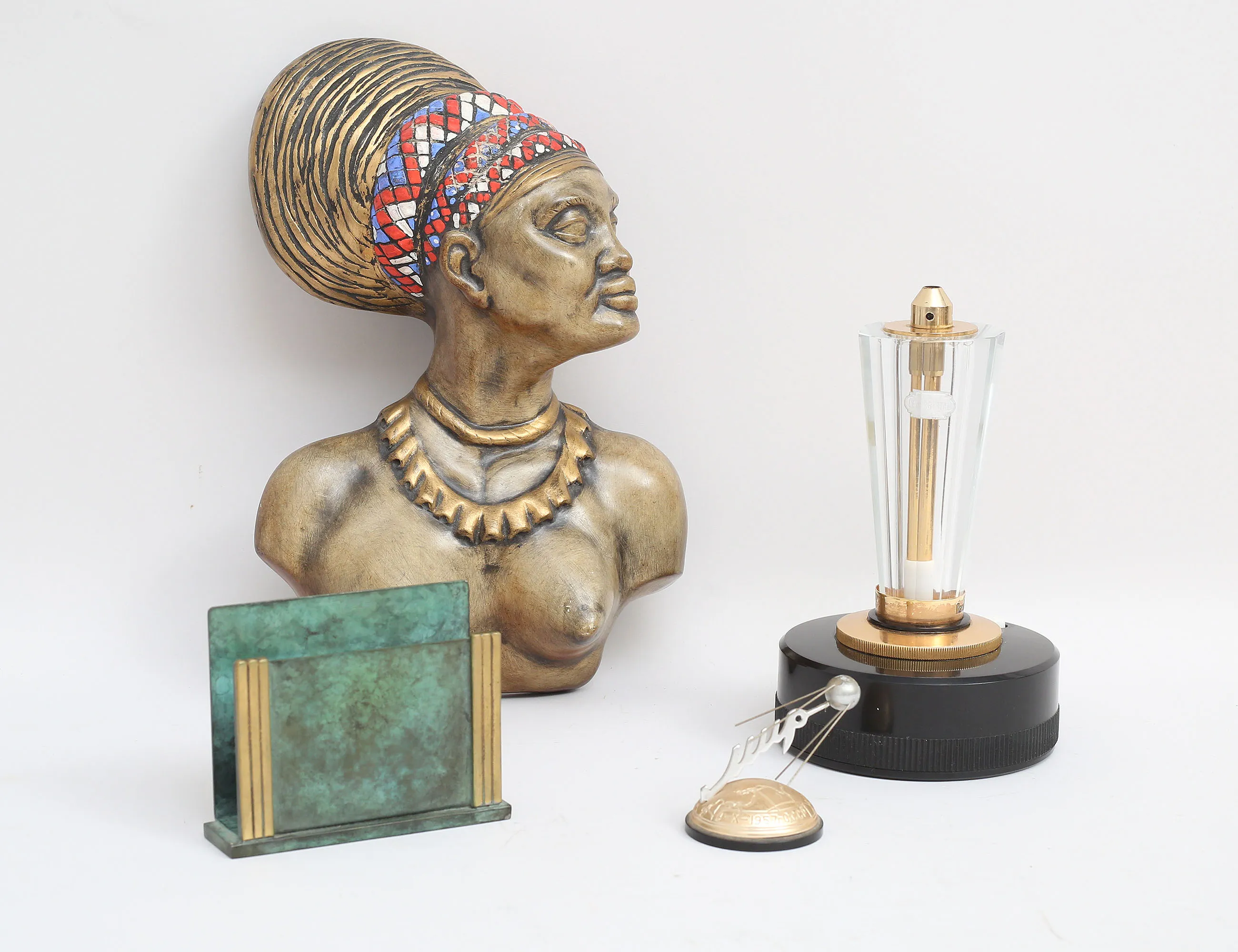 bordständare märkt Maruman Electric Table Gas Lighter, höjd 18, bordsdekoration "Sputnik", märkt 4-X1957 CCCP, höjd 5,5, väggmask Achatit Tyskland 1950-tal, höjd 26, brevställ 1930/40-tal patinerad brons, höjd 8