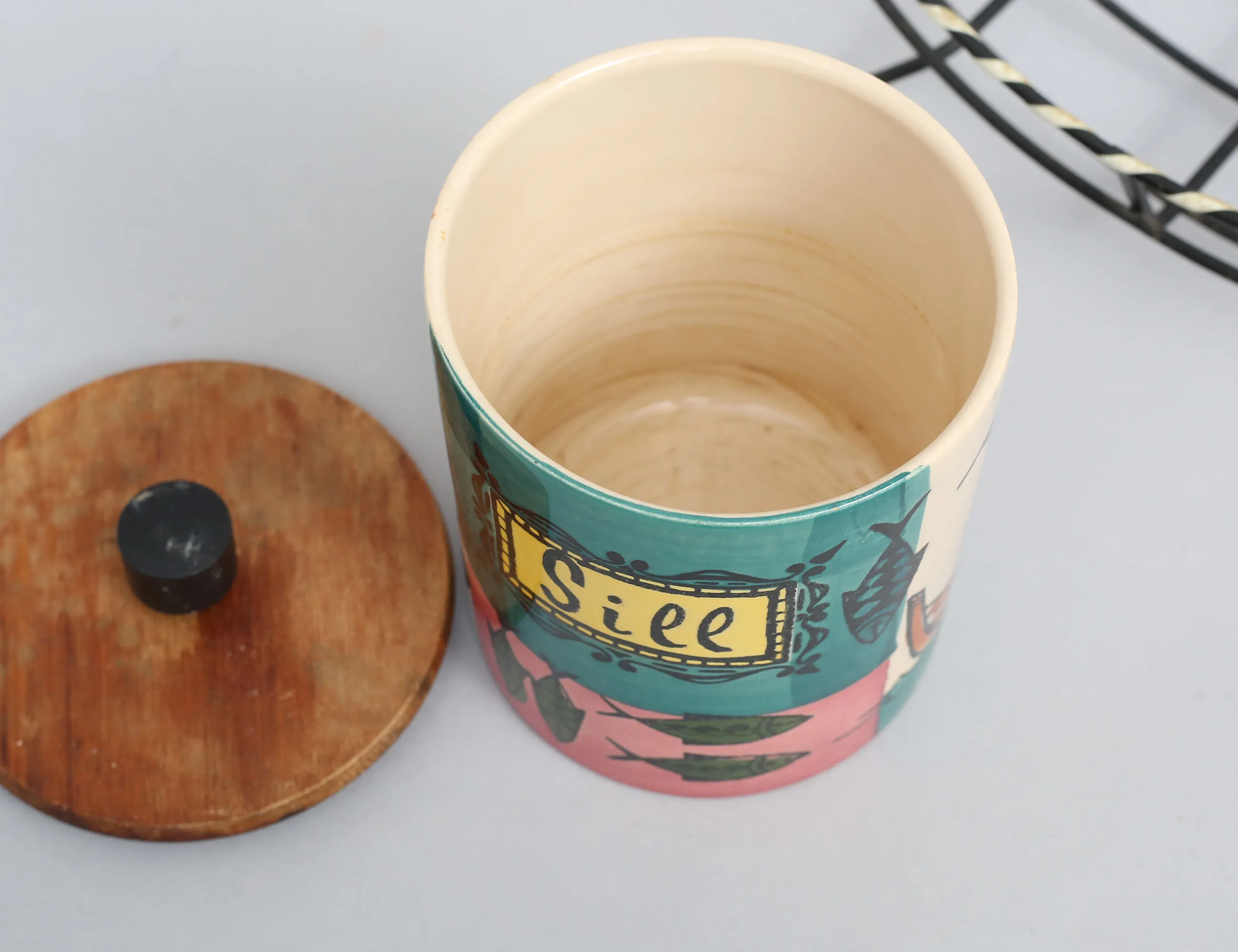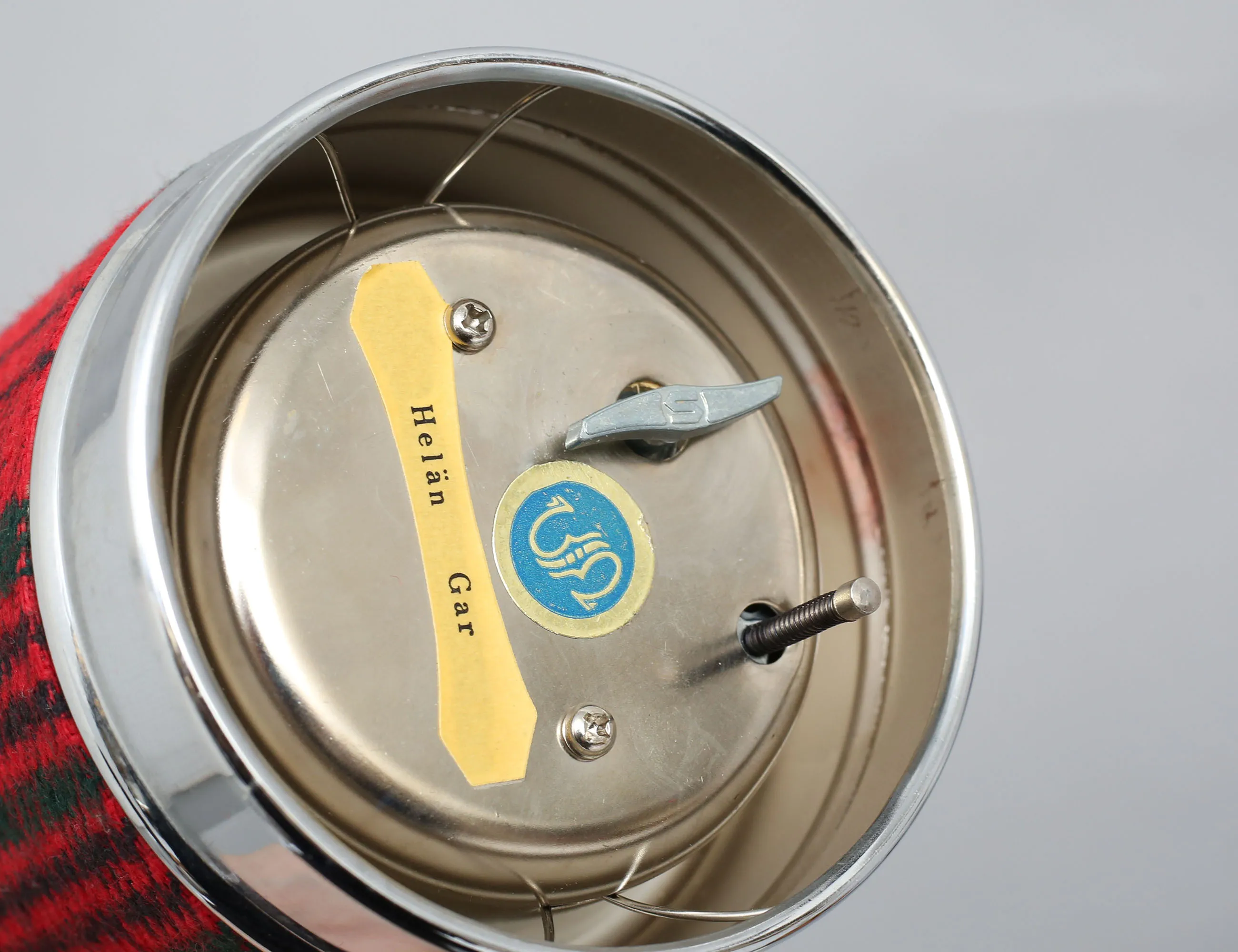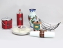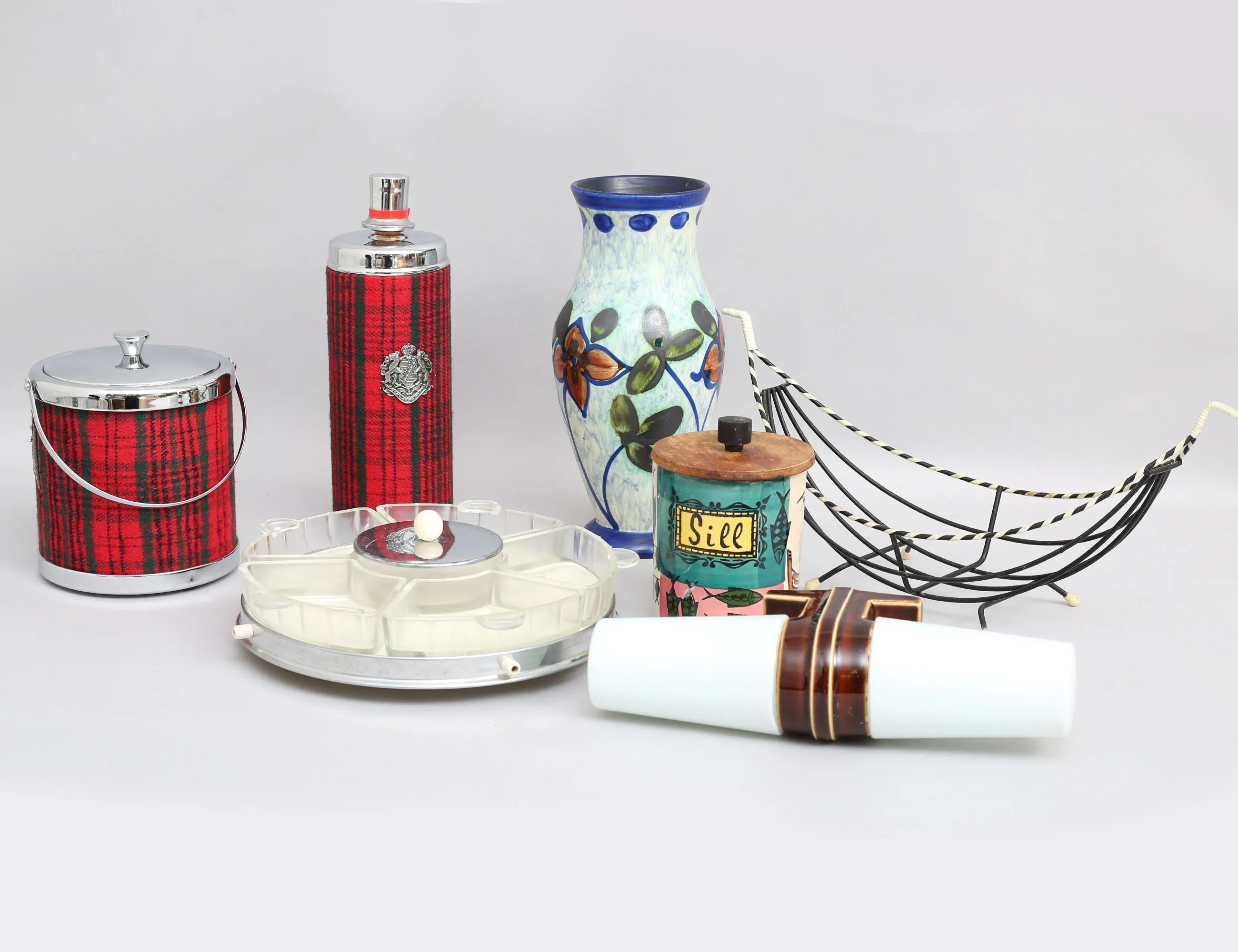 badrumsarmatur design Sigvard Bernadotte, keramik och glas, längd 30, cabaret glas och metall, snurrbar, diameter 27, korg plastöverdragen metall, längd 43, vas U-E höjd 28, ishink och plunta båda med speldosa, som spelar "Helan går" när man lyfter dom, kromad metall och textil, höjd 17/28, sillbruk Deco (missfärgning)