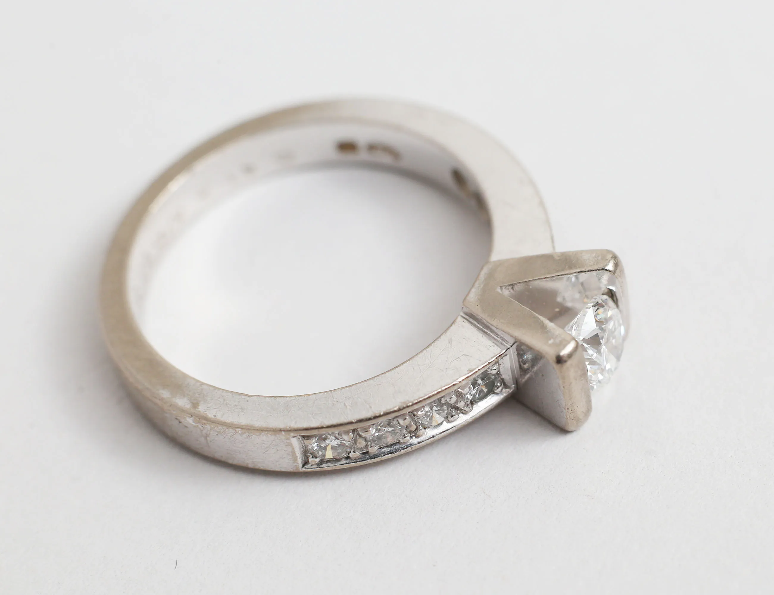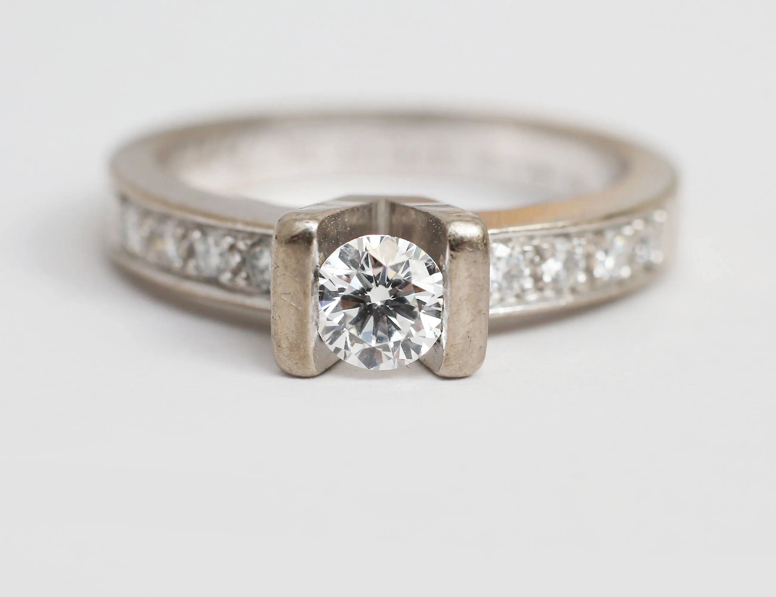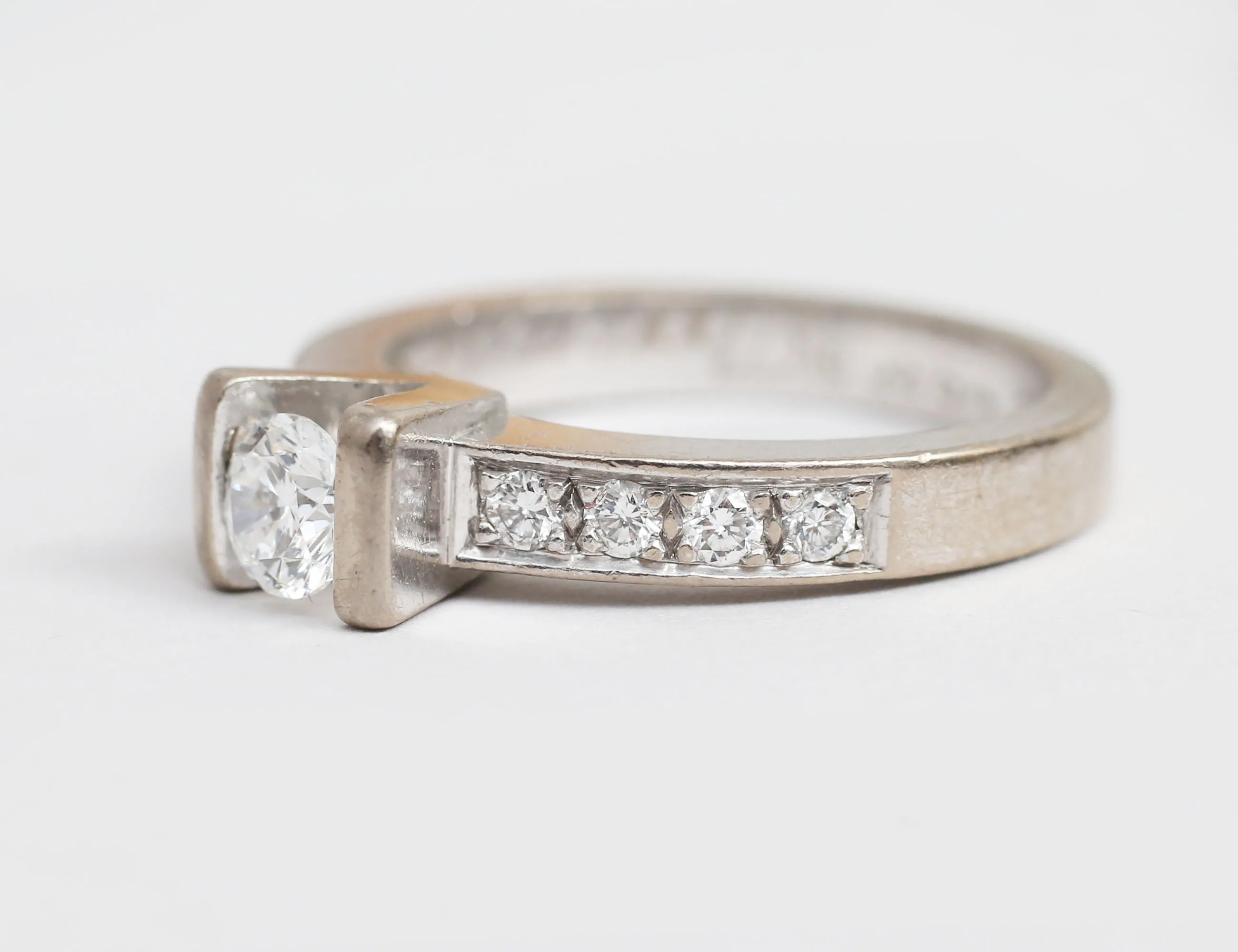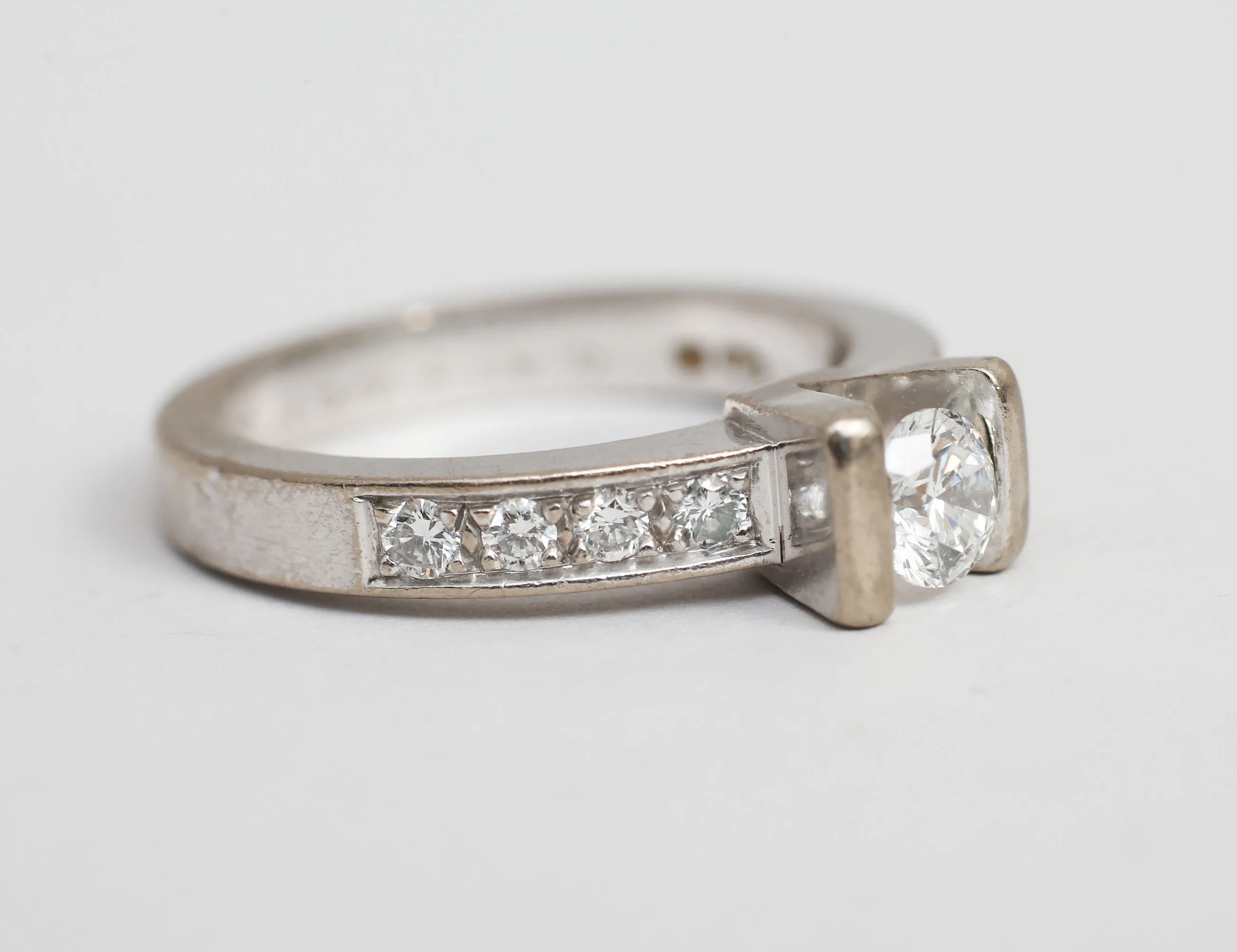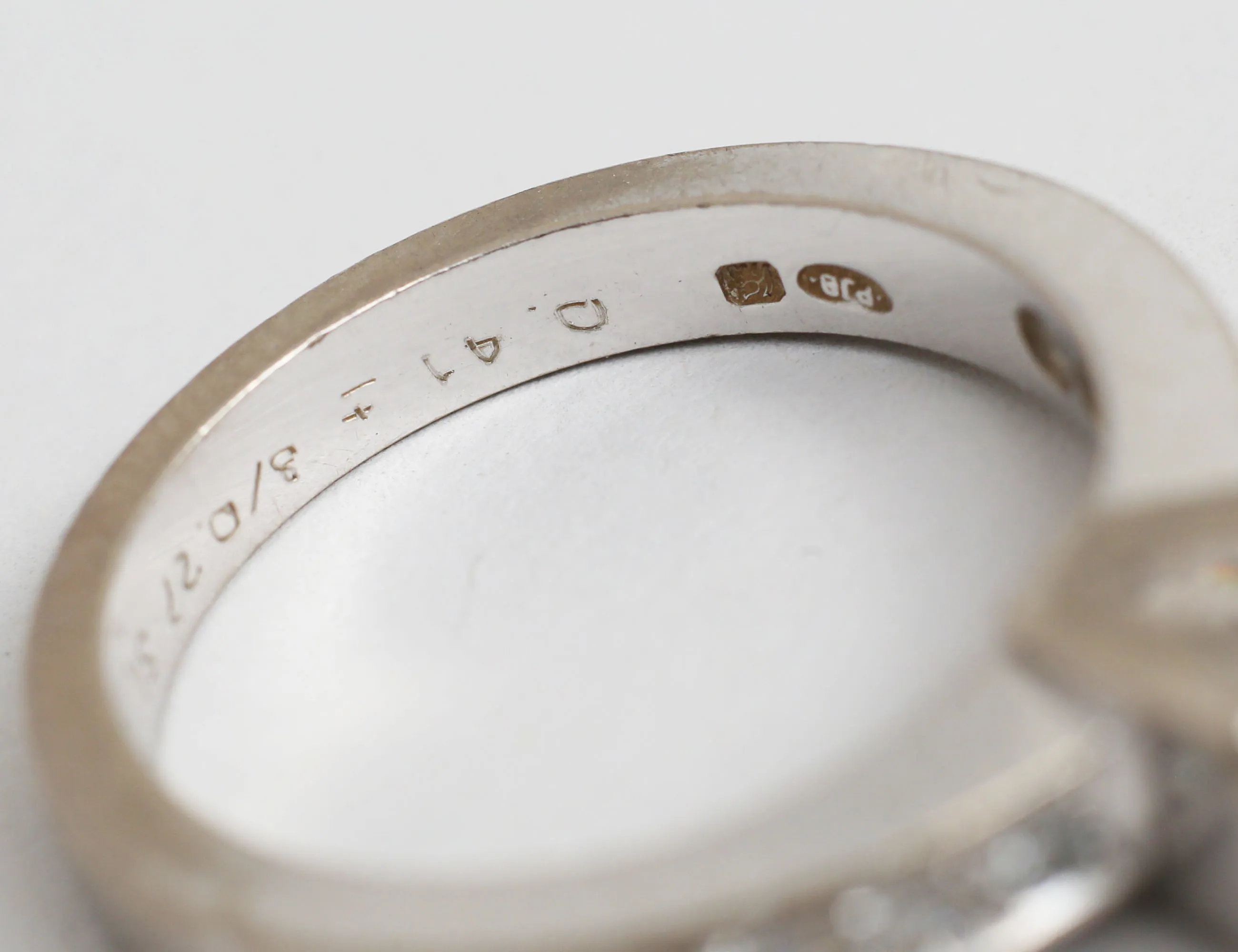 briljantslipade diamanter totalt 0,68ct., den större 0,41ct., samt 8 stycken 0,27ct., enligt gravyr, vikt 7,91 gram, storlek (smärre bruksslitage, invändig gravyr)