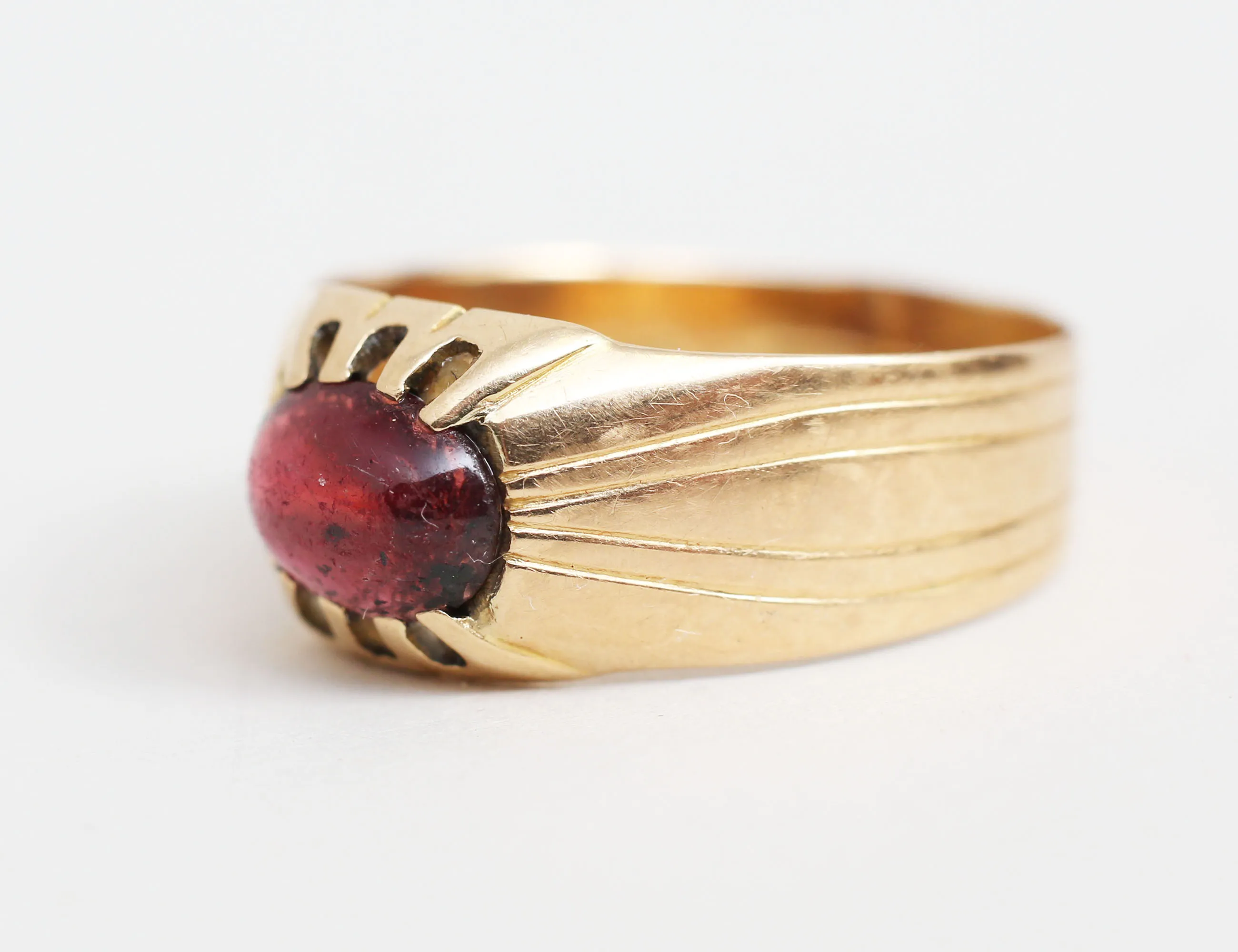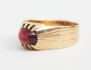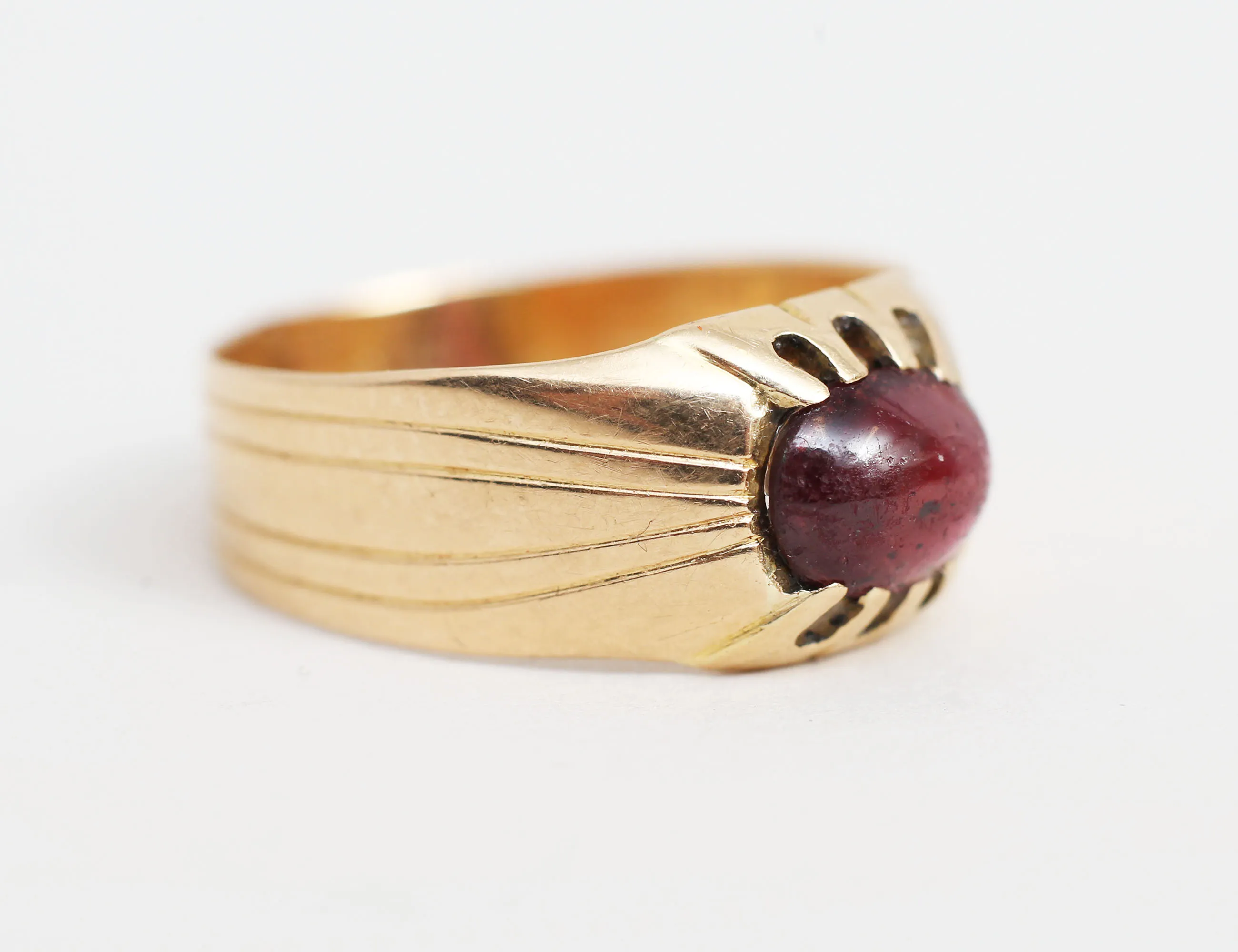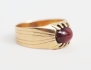 med cabuchonslipad möjlig rubin, Juvelerare Martin Elmblad Stockholm 1950, vikt 2,62 gram, storlek 18/56 (skenan med slitage)