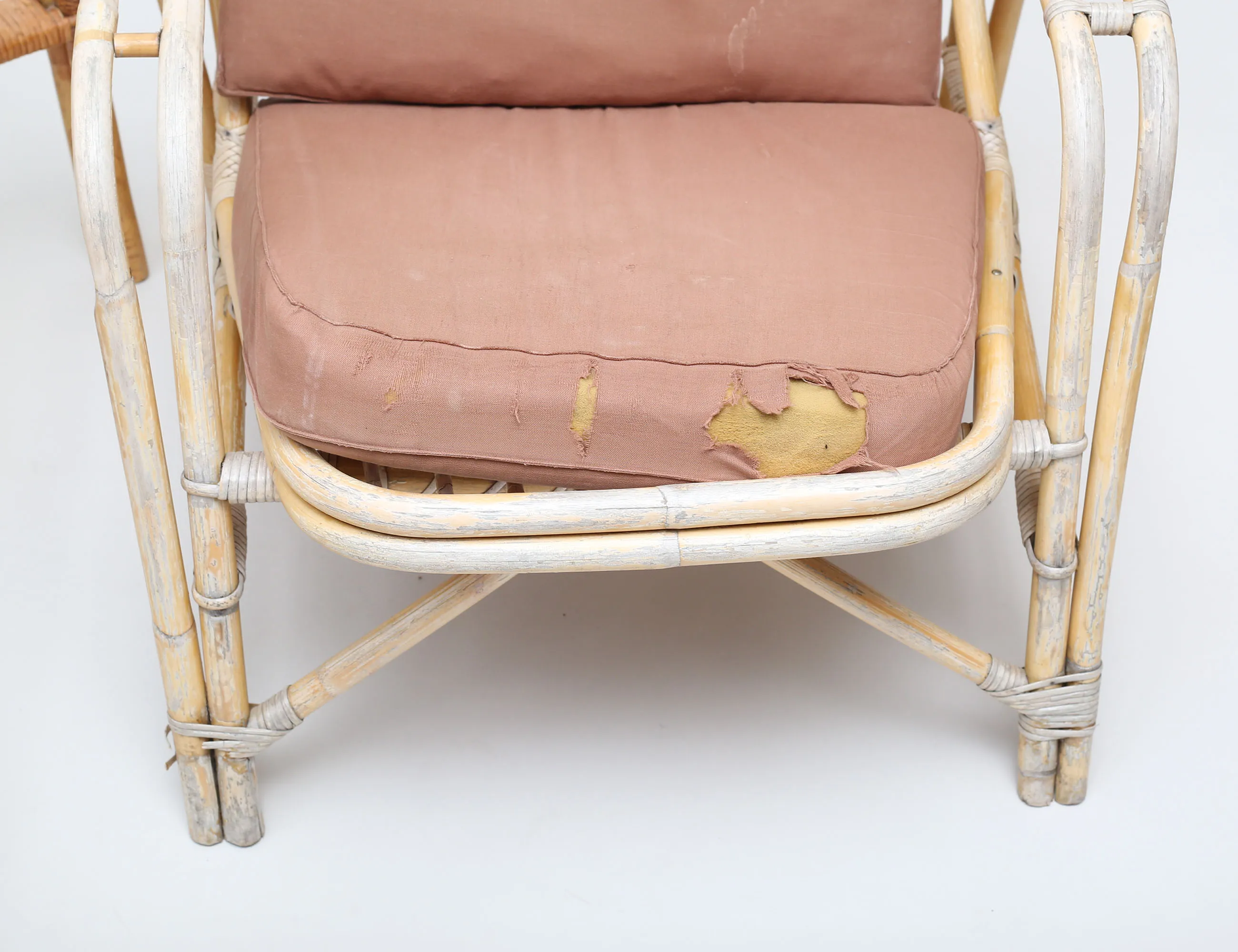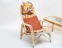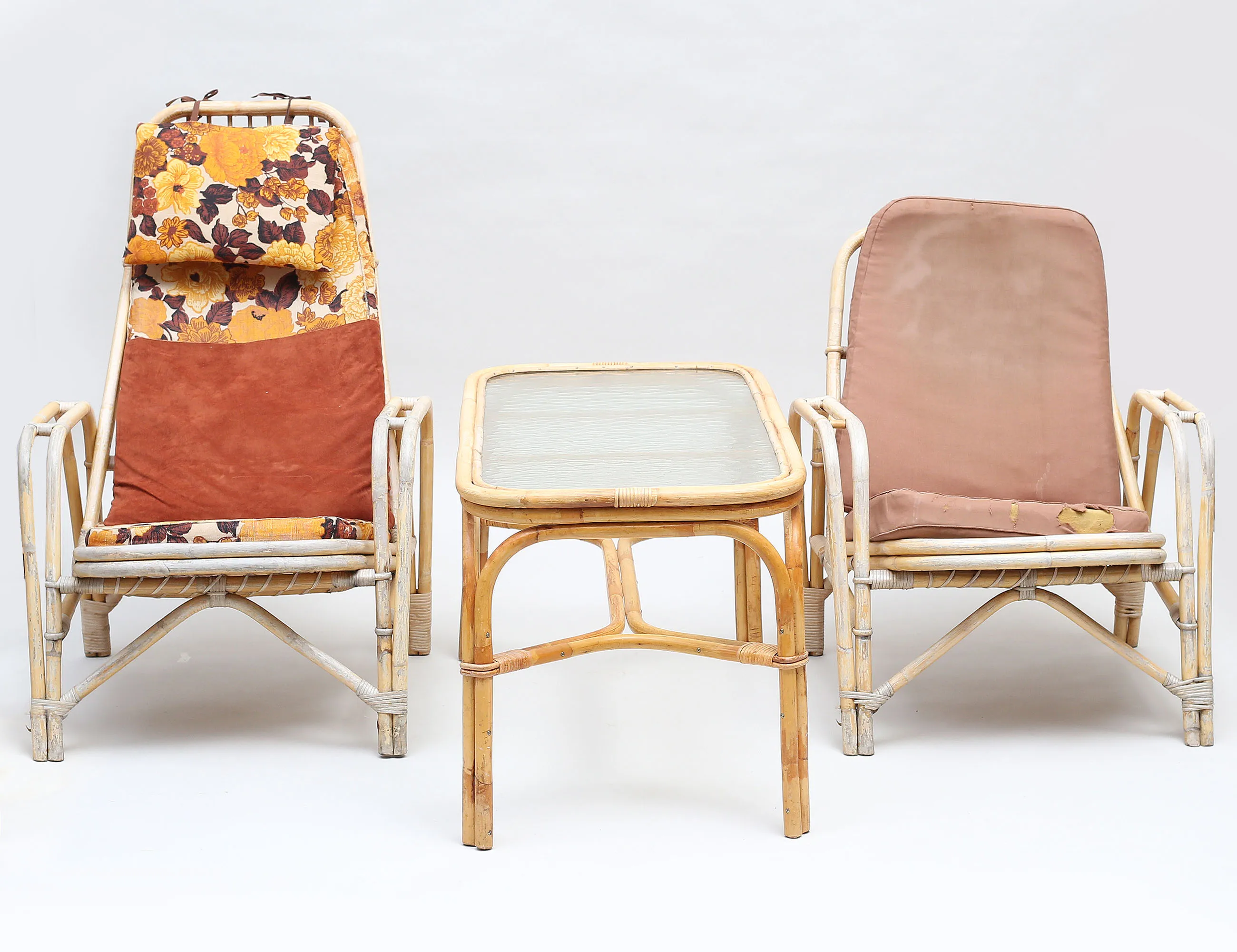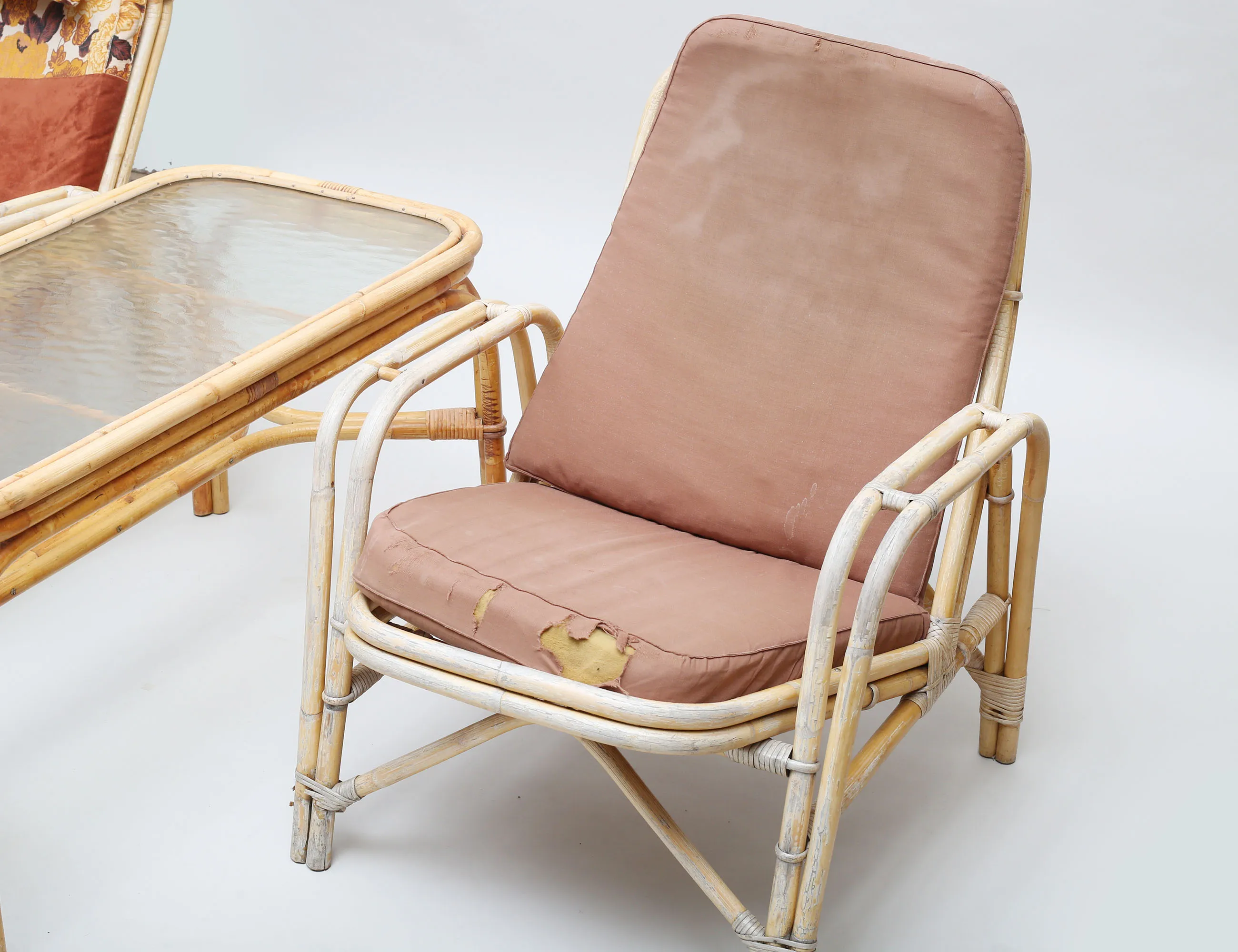 2 fåtöljer höjd 75/98, samt bord med gjuten glasskiva, bredd 98x53, bambu/rotting, lösa dynor (bruksslitage, tyg med hål och fläckar)