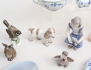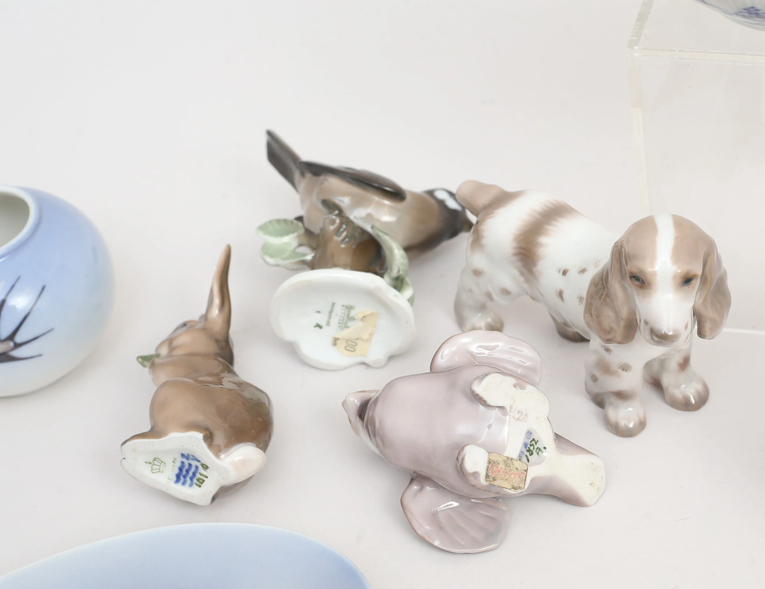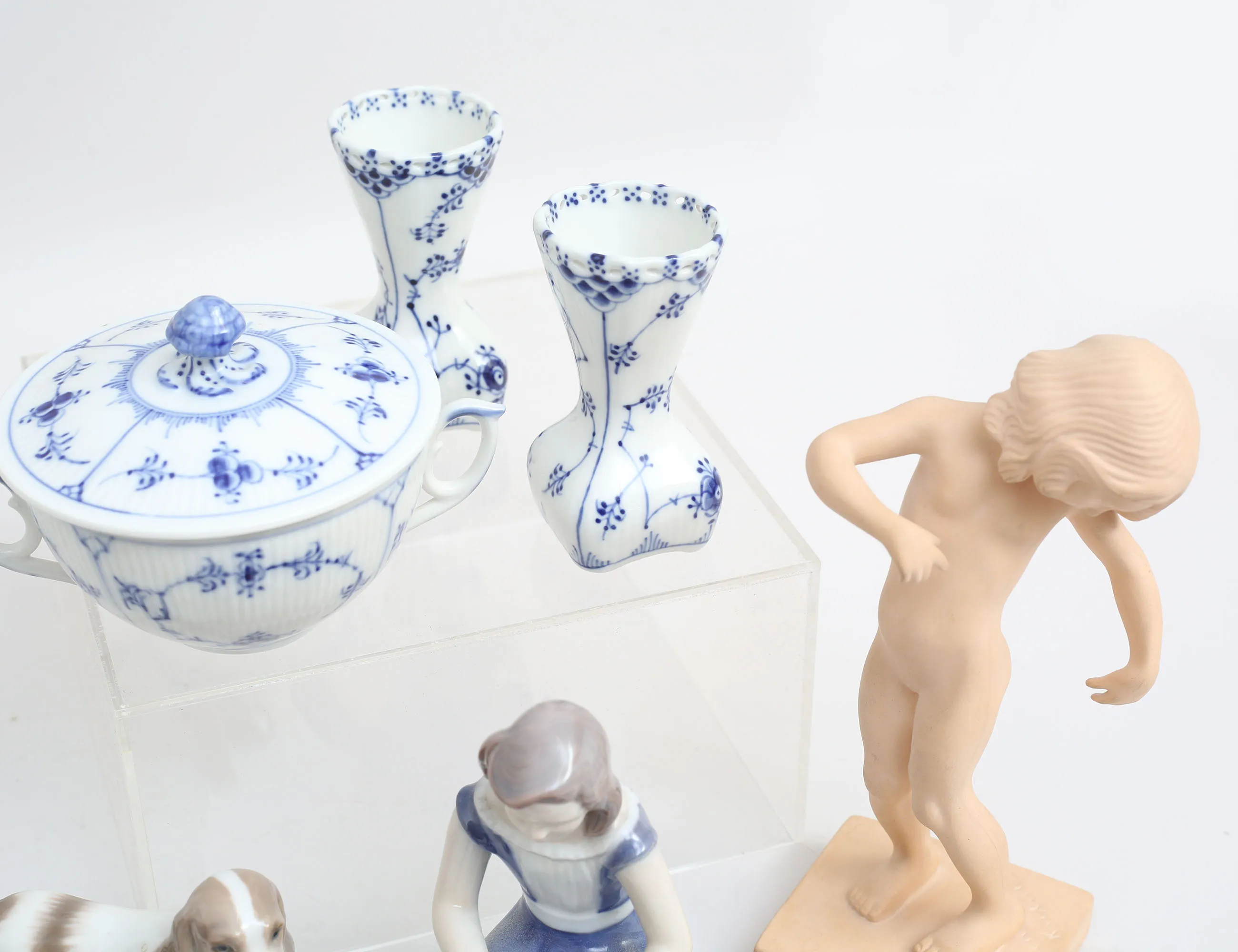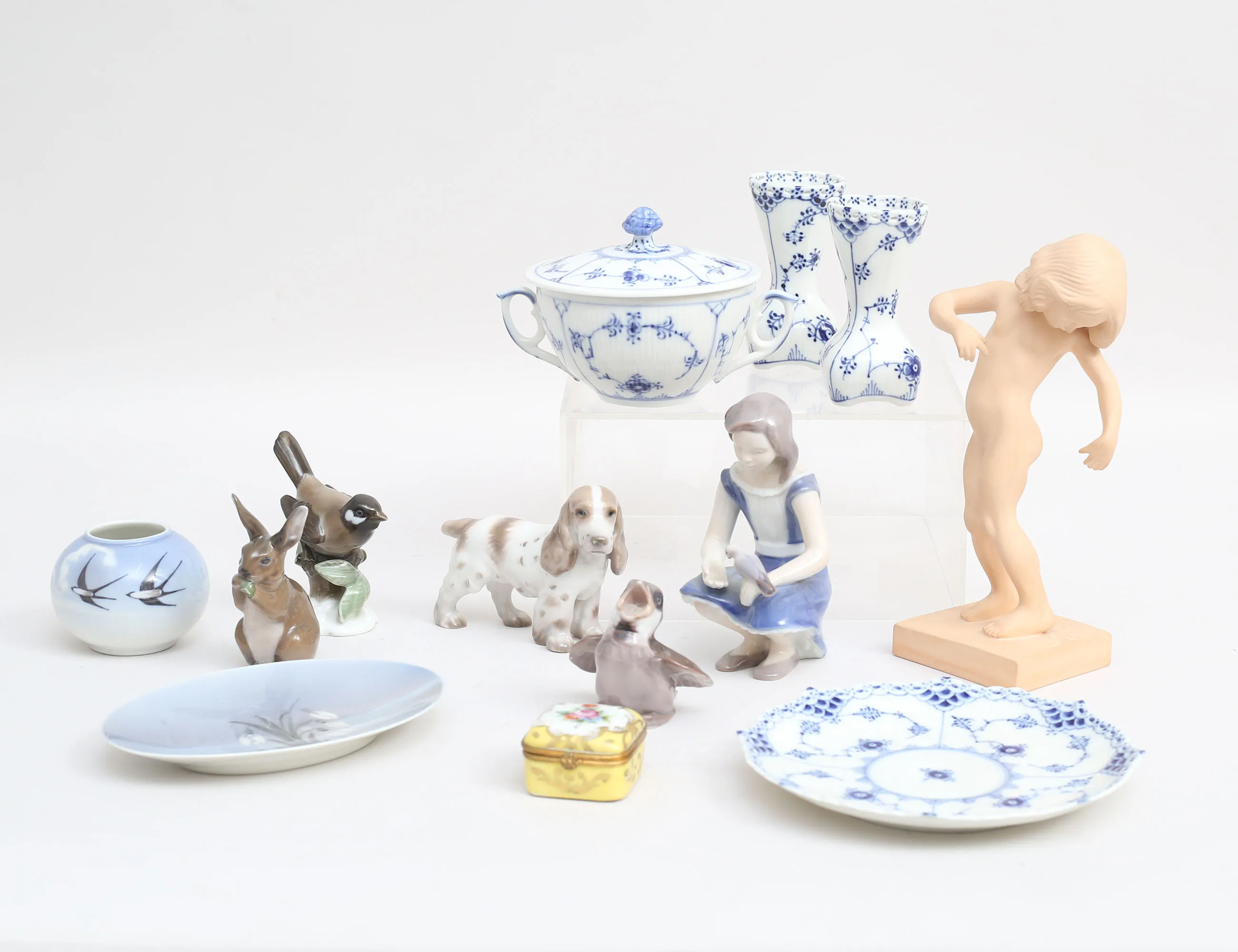 buljongkopp med fat samt 2 vaser "Musselmalet"; modellnnummer 2199, 1142, 1162 (fat micronagg) vas, fat samt figurin , 3 figuriner Bing & Gröndahl, höjd 7-13, figurin Roenthal höjd 9,5, figurin Venus Kallipygos höjd 21, dosa Limoges Frankrike 5x5